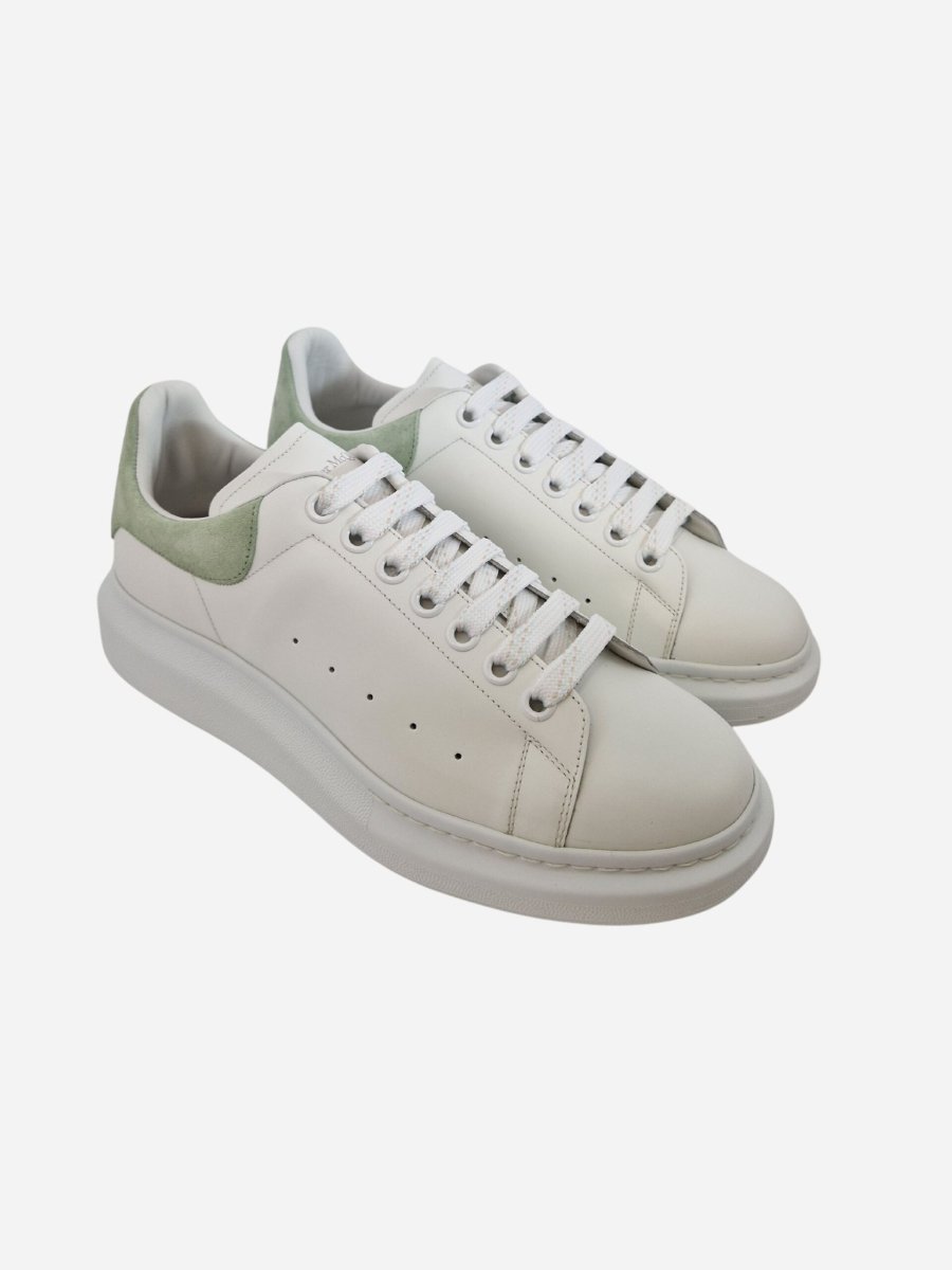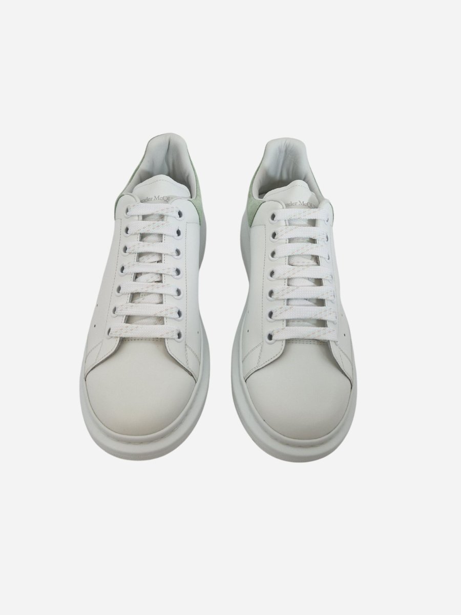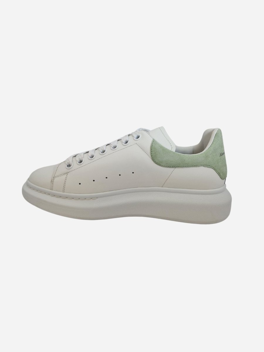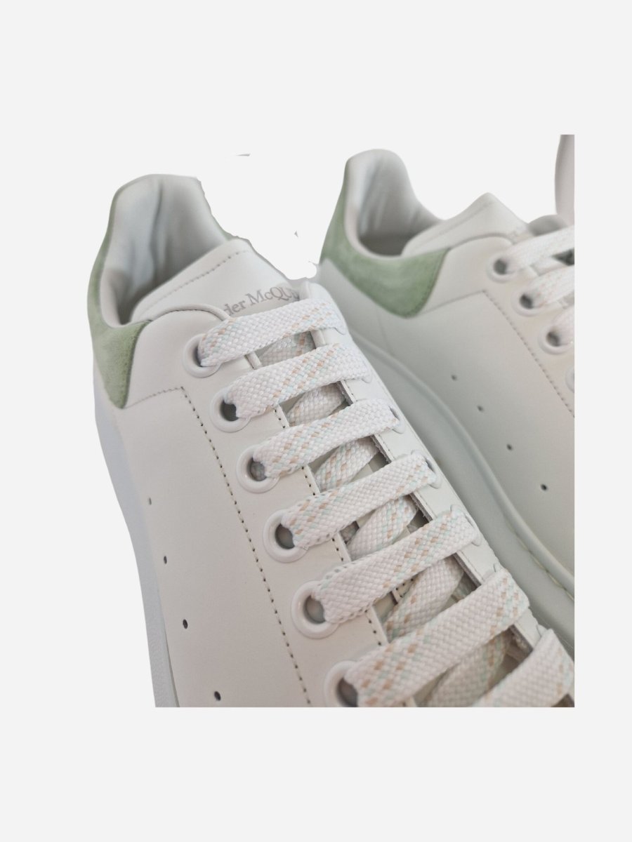 Sneakers Larry by Alexander McQueen. Scarpe realizzate in vera pelle con finitura liscia e maxi suola in gomma. Scarpe arricchite da un motivo forato laterale e talloncino a contrasto in suede verde pastello. Logo presente su talloncino e linguetta. Chiusura con lacci.