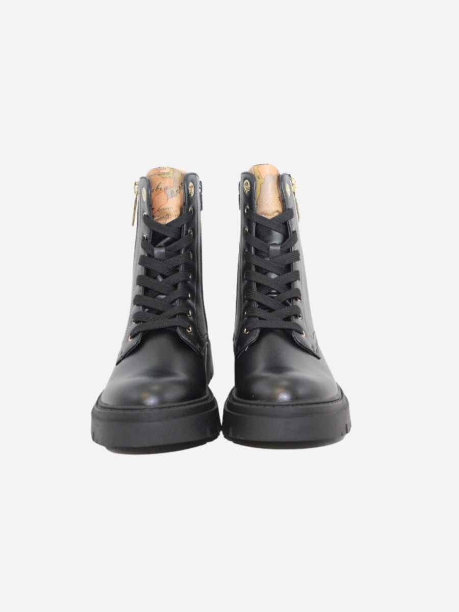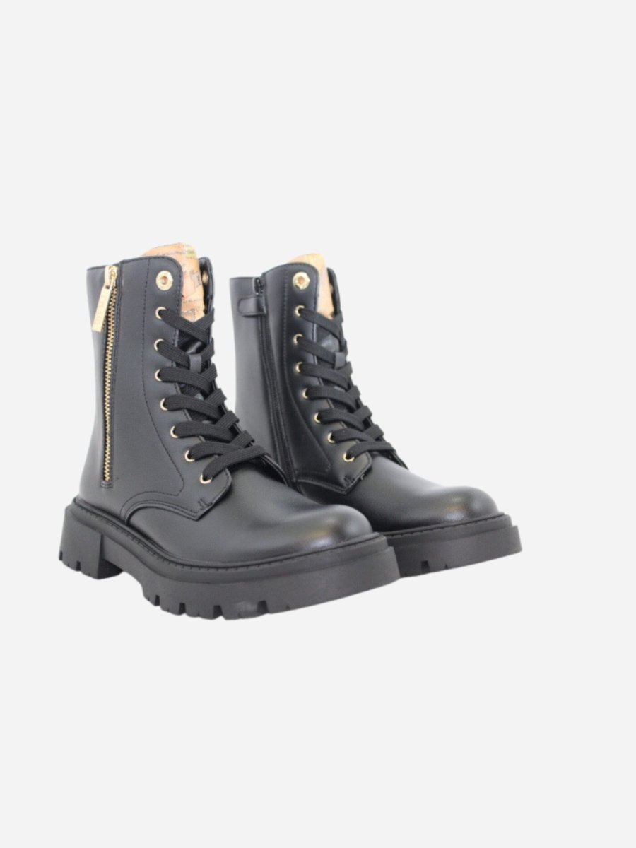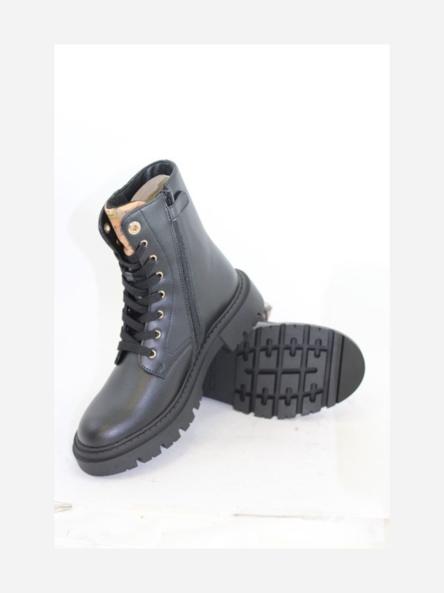 Anfibi by Prima Classe di Alviero Martini. Scarpe realizzate in pelle nera con suola track in gomma alta 4 cm. Cerniera laterale su entrambi i lati. Dettaglio a fantasia geo sulla linguetta. Prima Classe by Alviero Martini รจ il brand dell’iconica fantasia geo, che rende inconfondibile lo stile delle calzature. Il design, interamente italiano, รจ ispirato al viaggio ed รจ realizzato con eccellenza artigianale.