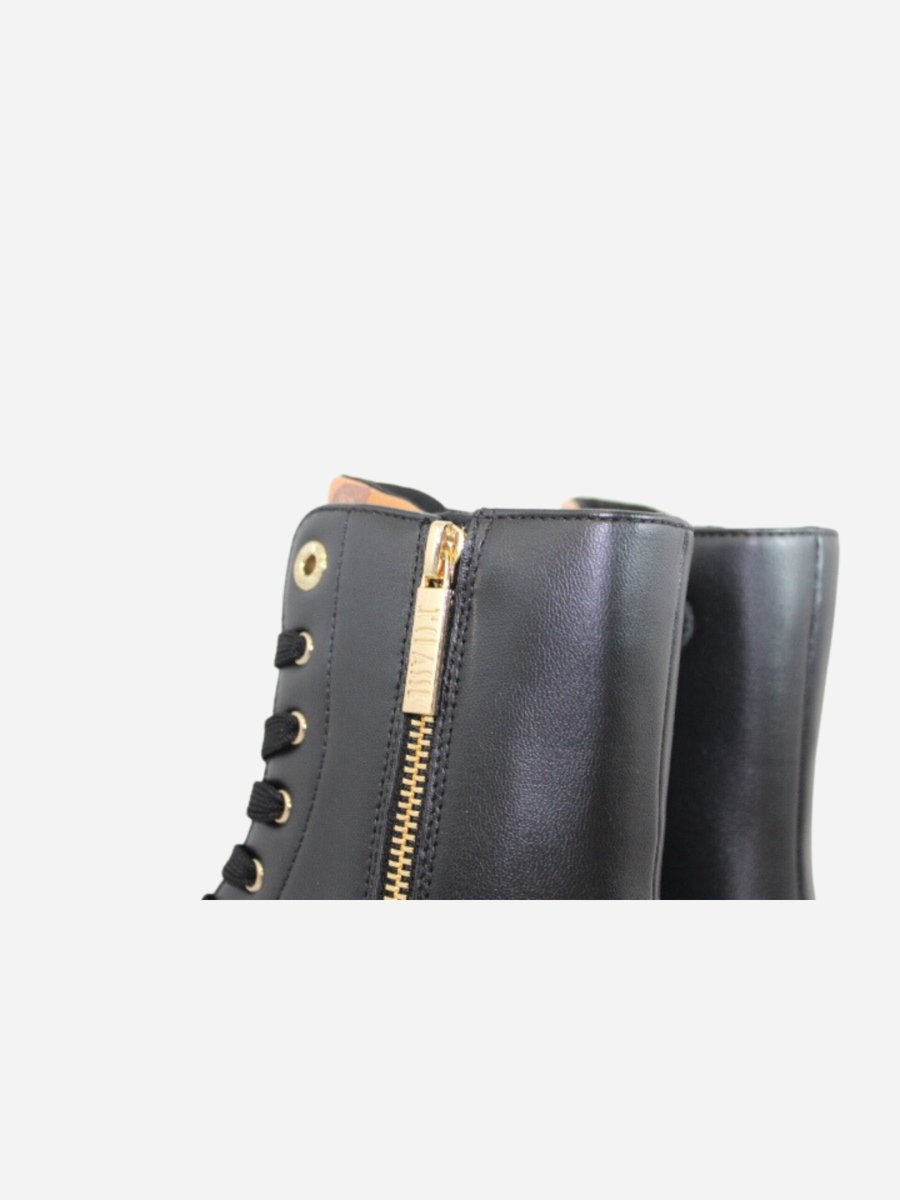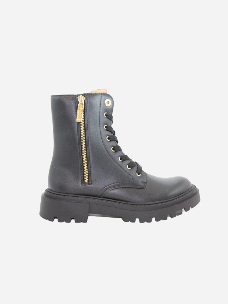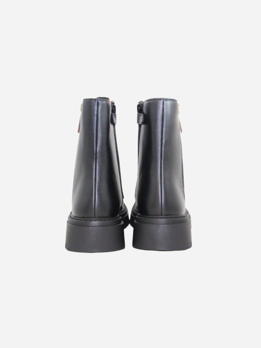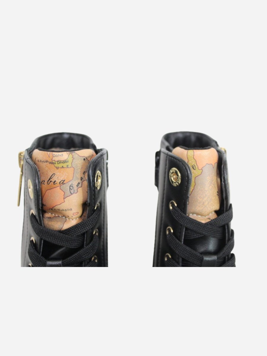 Anfibi by Prima Classe di Alviero Martini. Scarpe realizzate in pelle nera con suola track in gomma alta 4 cm. Cerniera laterale su entrambi i lati. Dettaglio a fantasia geo sulla linguetta. Prima Classe by Alviero Martini รจ il brand dell’iconica fantasia geo, che rende inconfondibile lo stile delle calzature. Il design, interamente italiano, รจ ispirato al viaggio ed รจ realizzato con eccellenza artigianale.