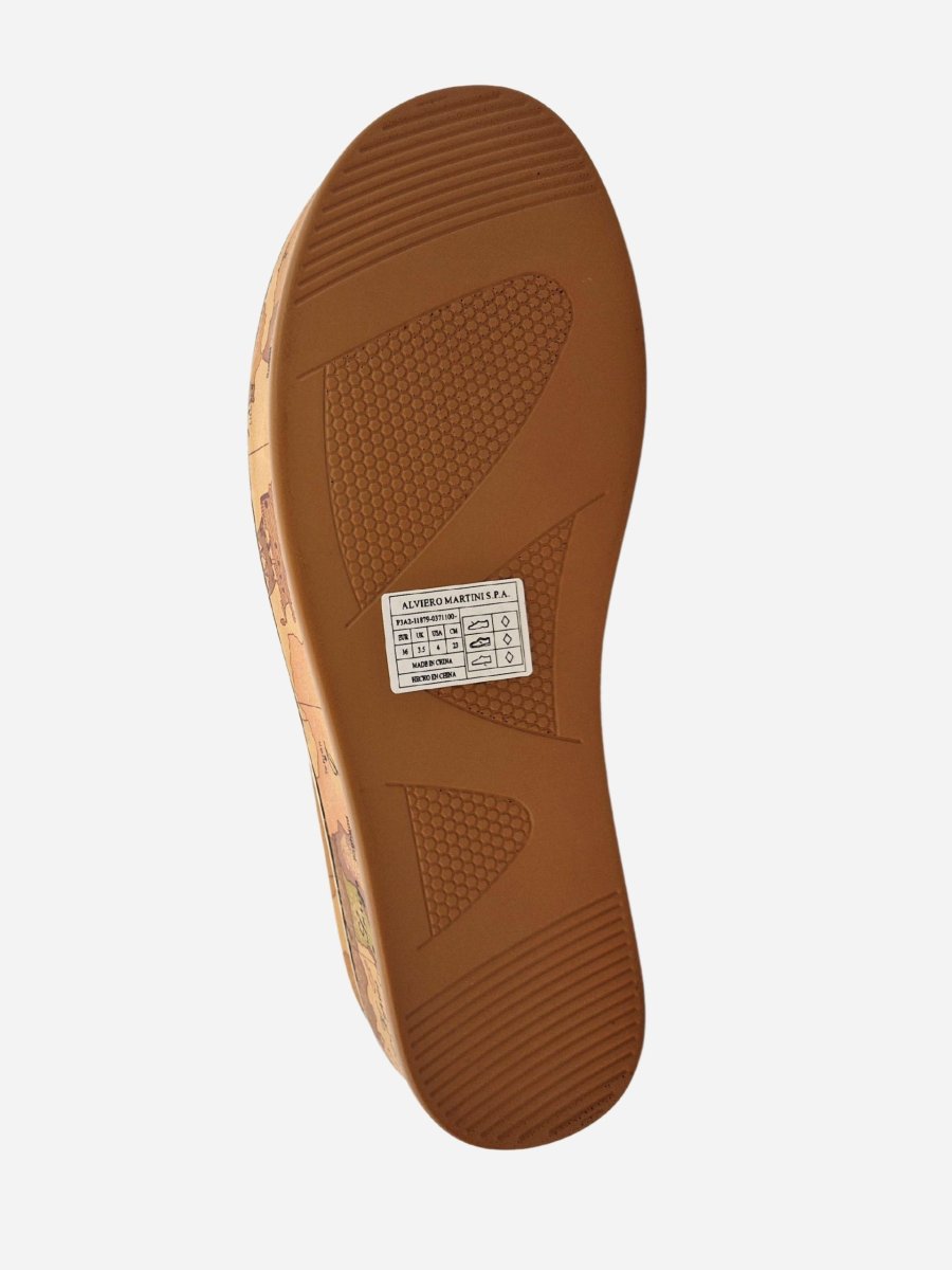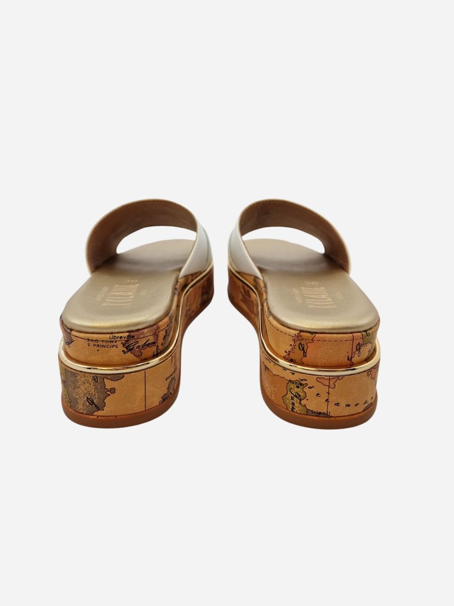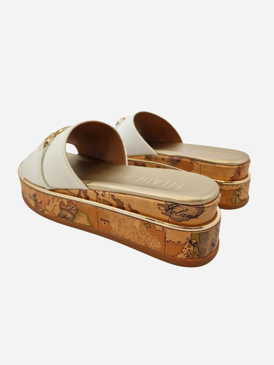 Ciabatta by Alviero Martini Prima Classe. Calzature realizzate in similpelle, con fascia arricchita da un accessorio dorato con logo. Fondo di 4 cm decorato con stampa geo.