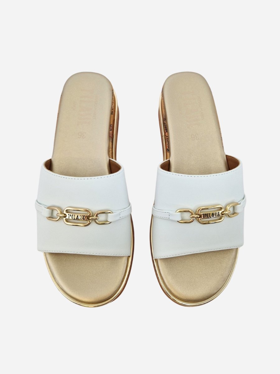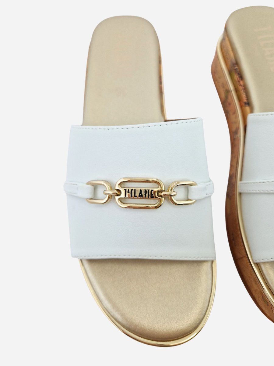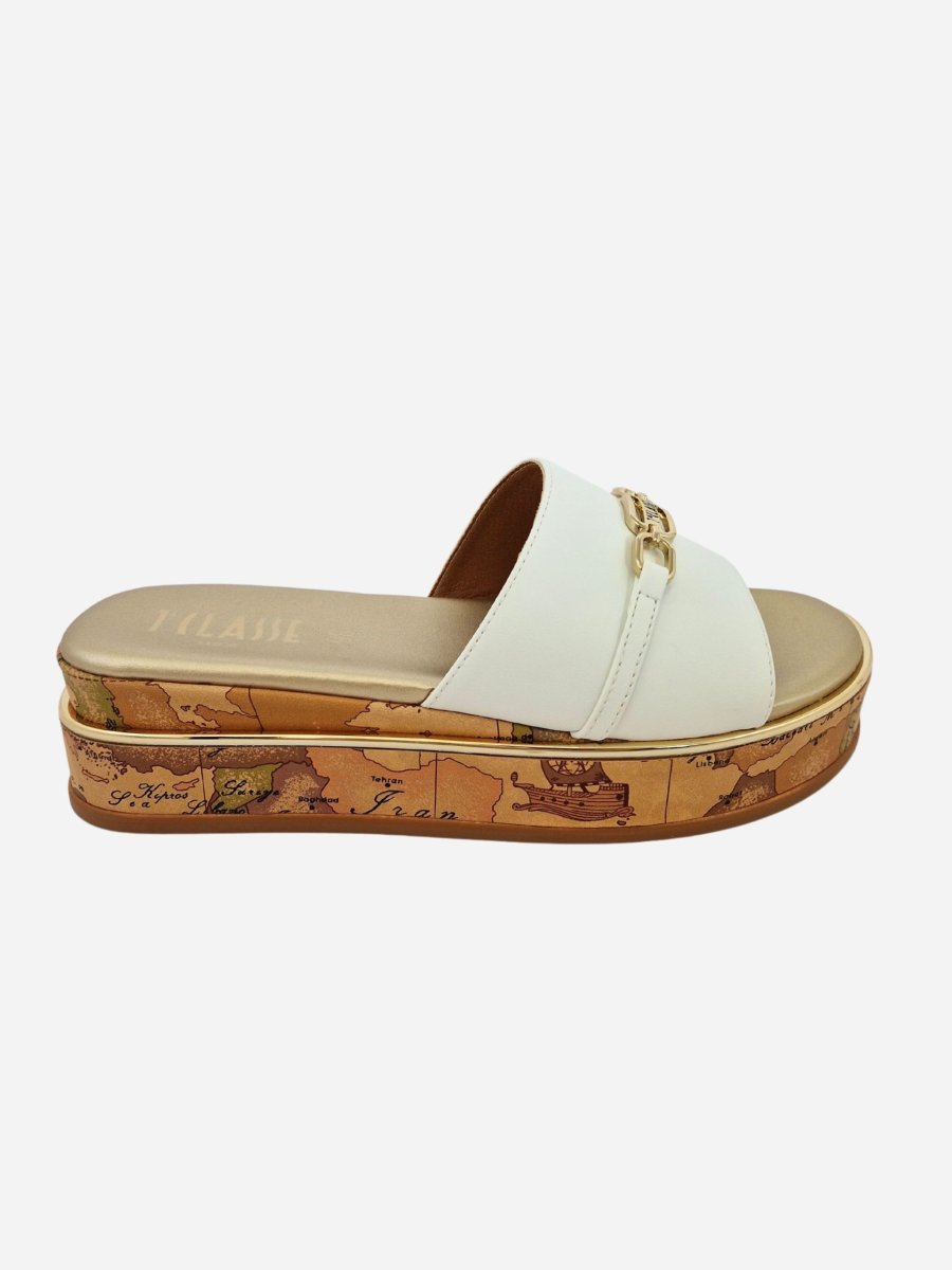 Ciabatta by Alviero Martini Prima Classe. Calzature realizzate in similpelle, con fascia arricchita da un accessorio dorato con logo. Fondo di 4 cm decorato con stampa geo.