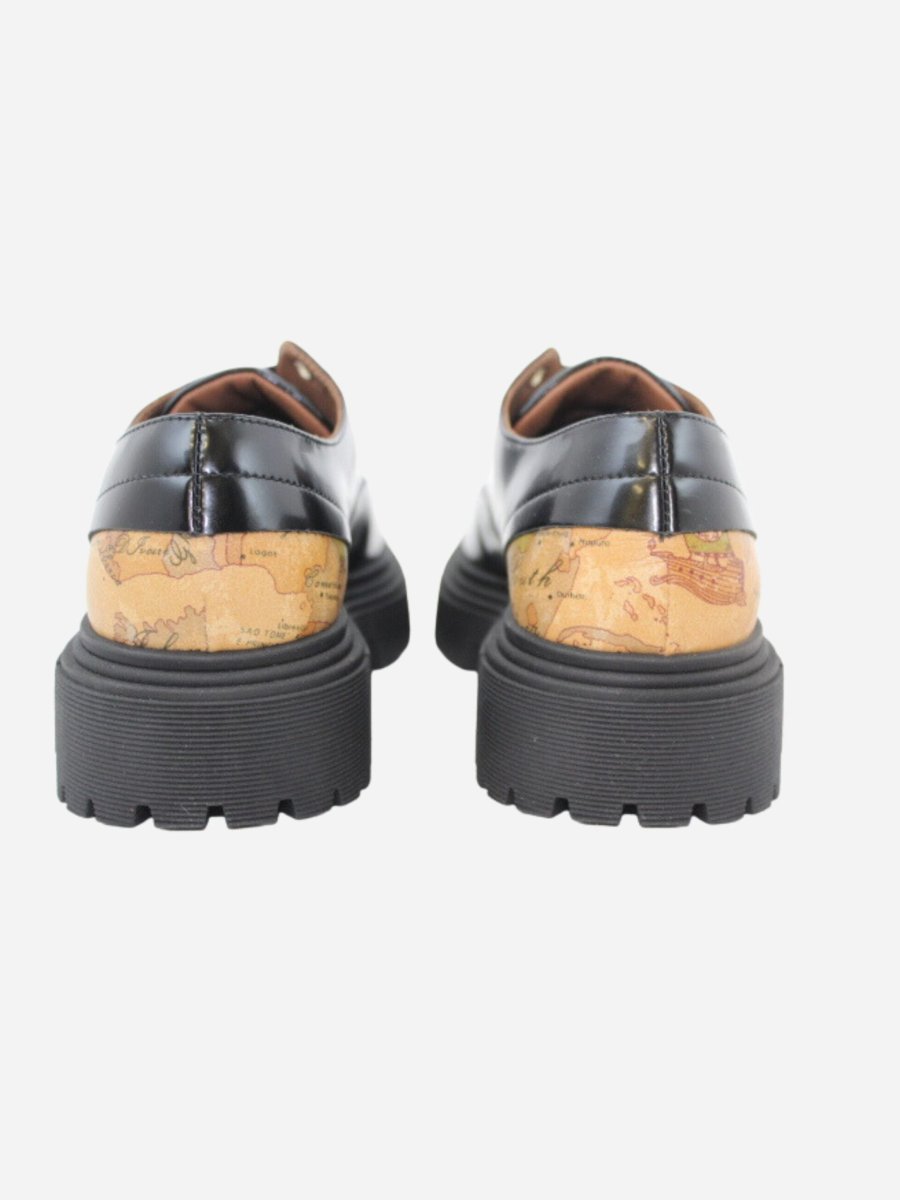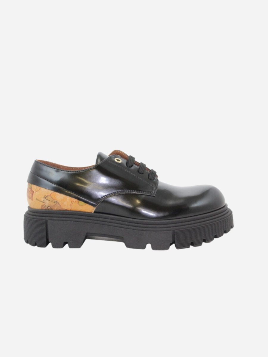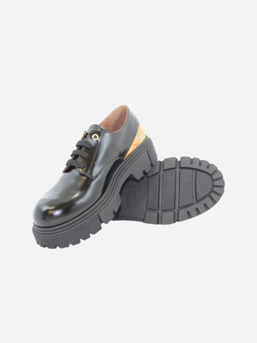 Scarpa stringata by Prima Classe di Alviero Martini. Scarpa realizzata in pelle nera spazzolata con interno in pelle. Fondo Platform di 3,5 cm. Chiusura con lacci. Dettaglio con l’iconica fantasia geo sul tallone. Prima Classe by Alviero Martini รจ il brand dell’iconica fantasia geo, che rende inconfondibile lo stile delle calzature. Il design, interamente italiano, รจ ispirato al viaggio ed รจ realizzato con eccellenza artigianale.