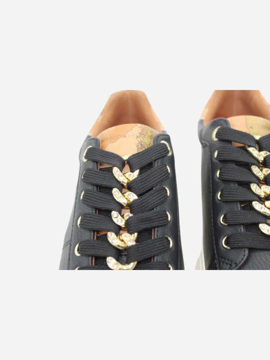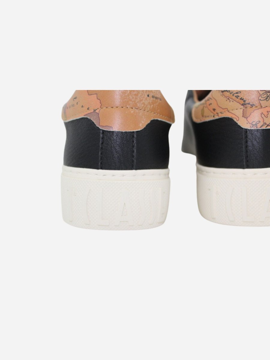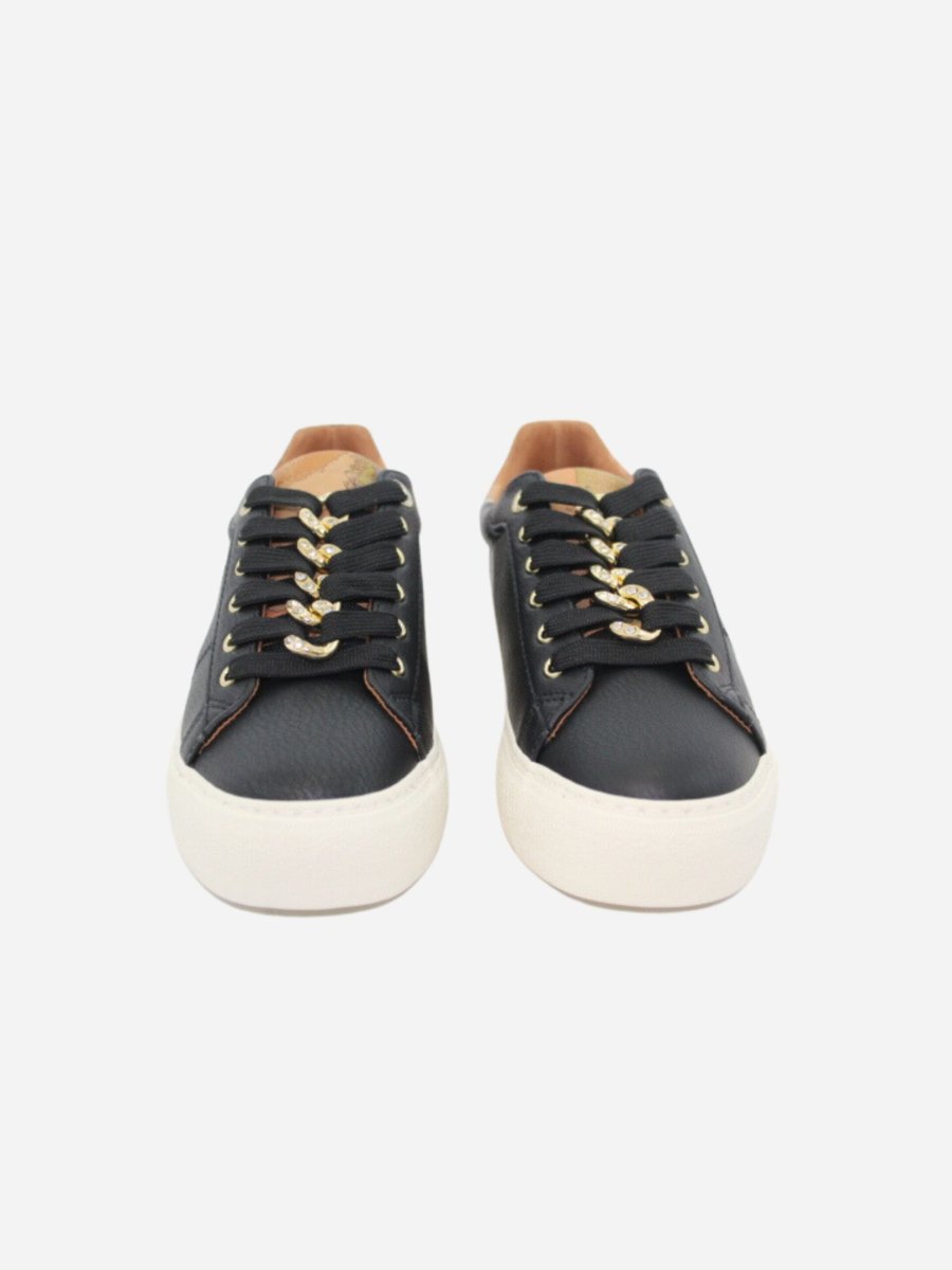 Sneakers by Prima Classe di Alviero Martini. Scarpe realizzate in eco-pelle con interno misto tessuto e pelle. Suola alta in gomma di 3 cm. Dettaglio fantasia geo sul retro e applicazione di strass sui lacci. Chiusura con lacci. Prima Classe by Alviero Martini รจ il brand dell’iconica fantasia geo, che rende inconfondibile lo stile delle calzature. Il design, interamente italiano, รจ ispirato al viaggio ed รจ realizzato con eccellenza artigianale.
