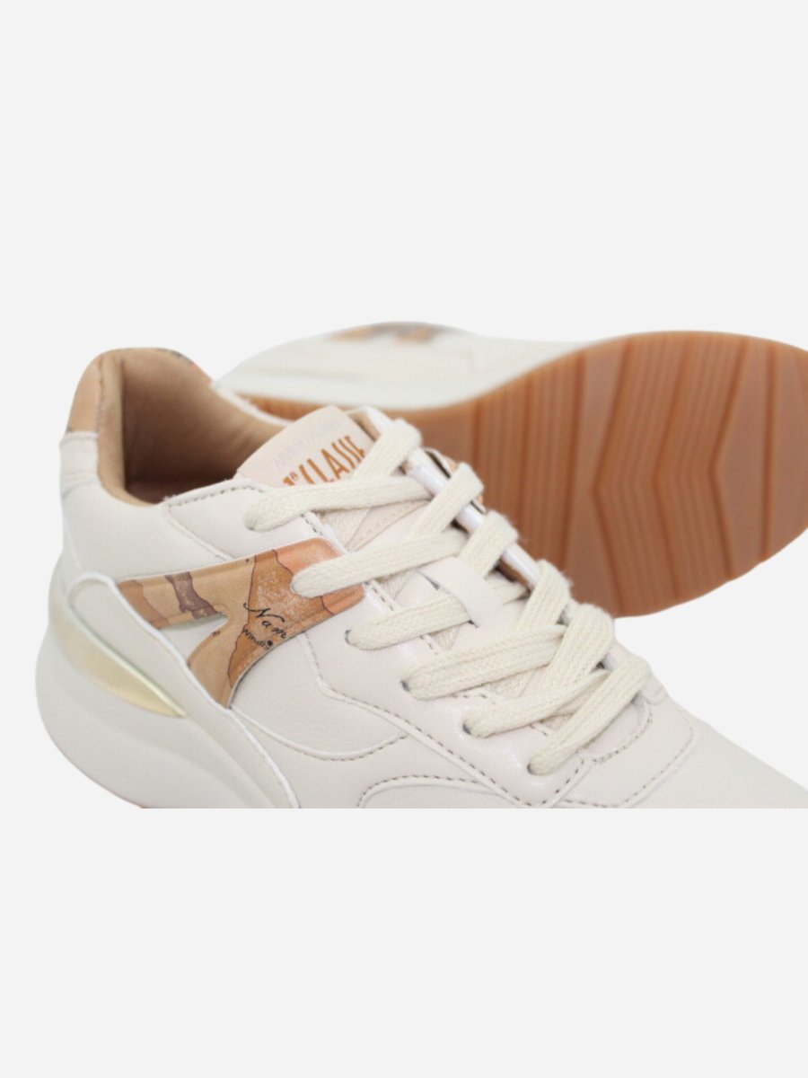 Sneakers 1683 Prima Classe by Alviero Martini nella variante panna. Scarpe realizzate in eco-pelle con interno in tessuto. Suola in gomma alta 4 cm. Dettagli con l’iconica fantasia geo sopra al tallone e lateralmente. Inserto dorato con logo nella parte posteriore. Prima Classe by Alviero Martini รจ il brand dell’iconica fantasia geo, che rende inconfondibile lo stile delle calzature. Il design, interamente italiano, รจ ispirato al viaggio ed รจ realizzato con eccellenza artigianale.