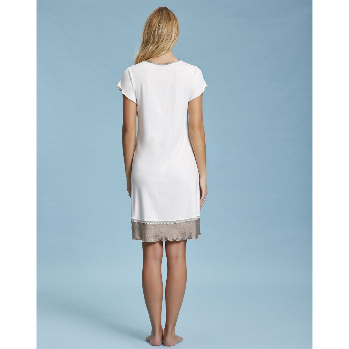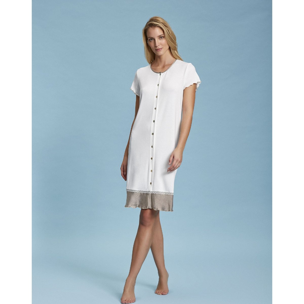 Camicia da notte aperta donna Andra primavera/estate, a maniche corte, con inserto in raso, collo serafino e apertura a bottoncini . Composizione: 100% cotone. Confezione da 1 pezzo. Disponibile nel colore Naturale e Perla nelle taglie 3 โ 4 โ 5.