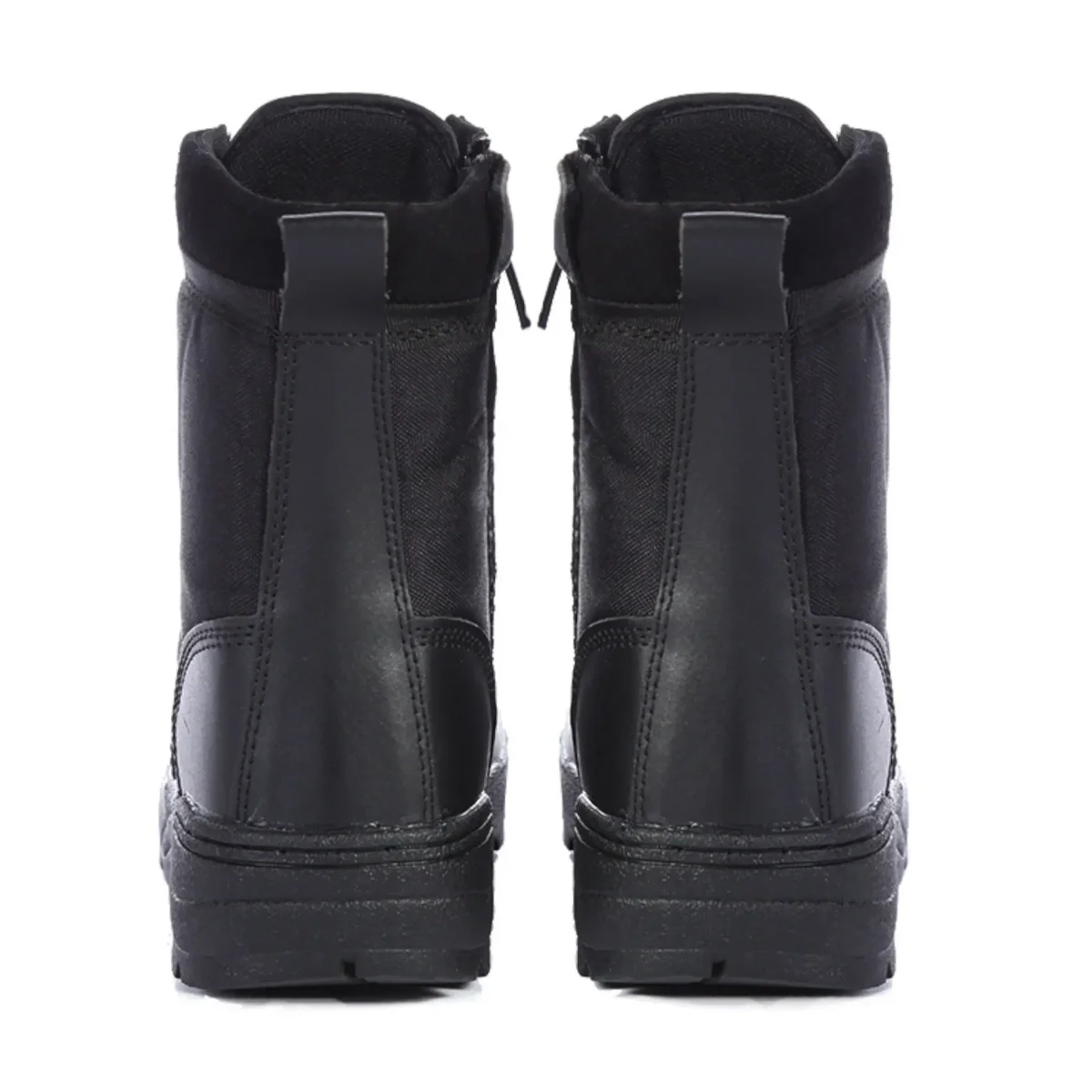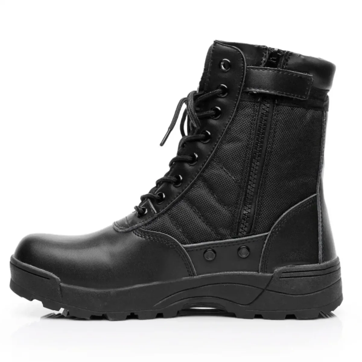 - Sistema di chiusura doppio: Lacci tessuti resistenti e cerniera laterale con fascia velcro per calzata sicura