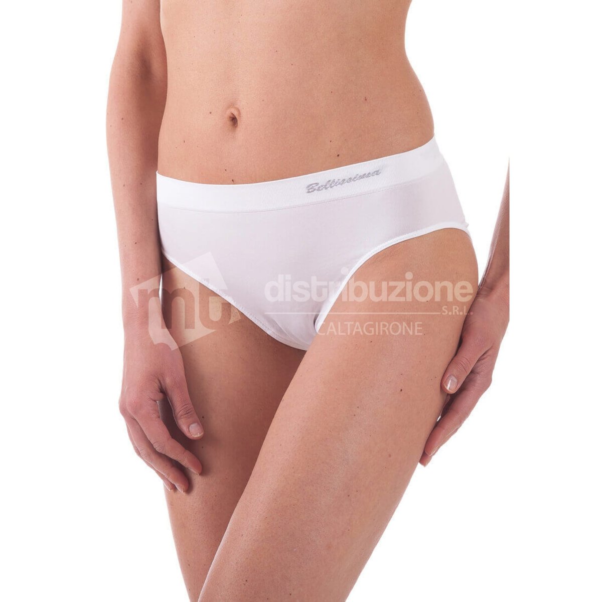 Slip donna sgambato Bellissima in microfibra elasticizzata con tassello in cotone. Composizione: 92% poliammide, 8% elastan. Confezione da 3 pezzi. Disponibile nei colori Bianco, Naturale e Nero nelle taglie S/M – M/L – L/XL.