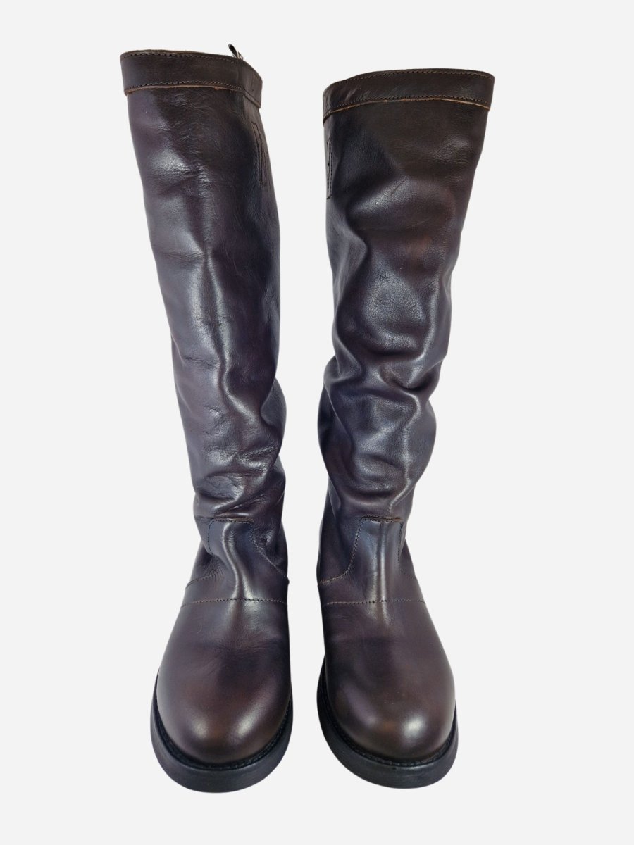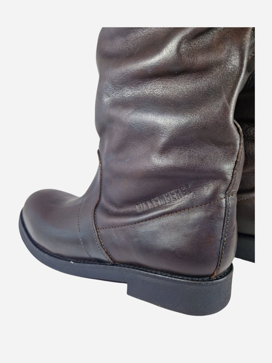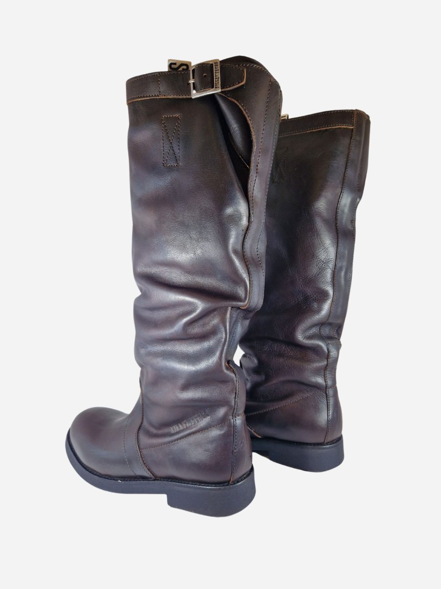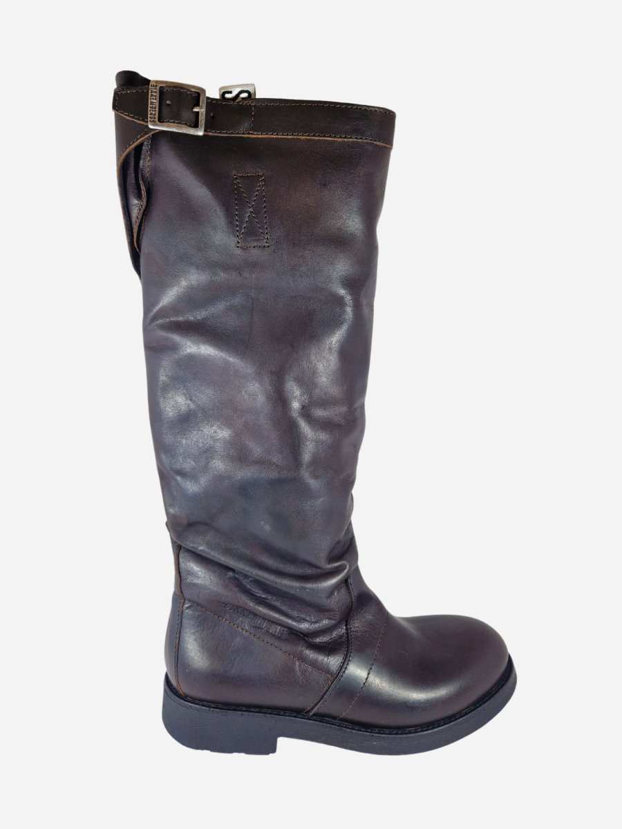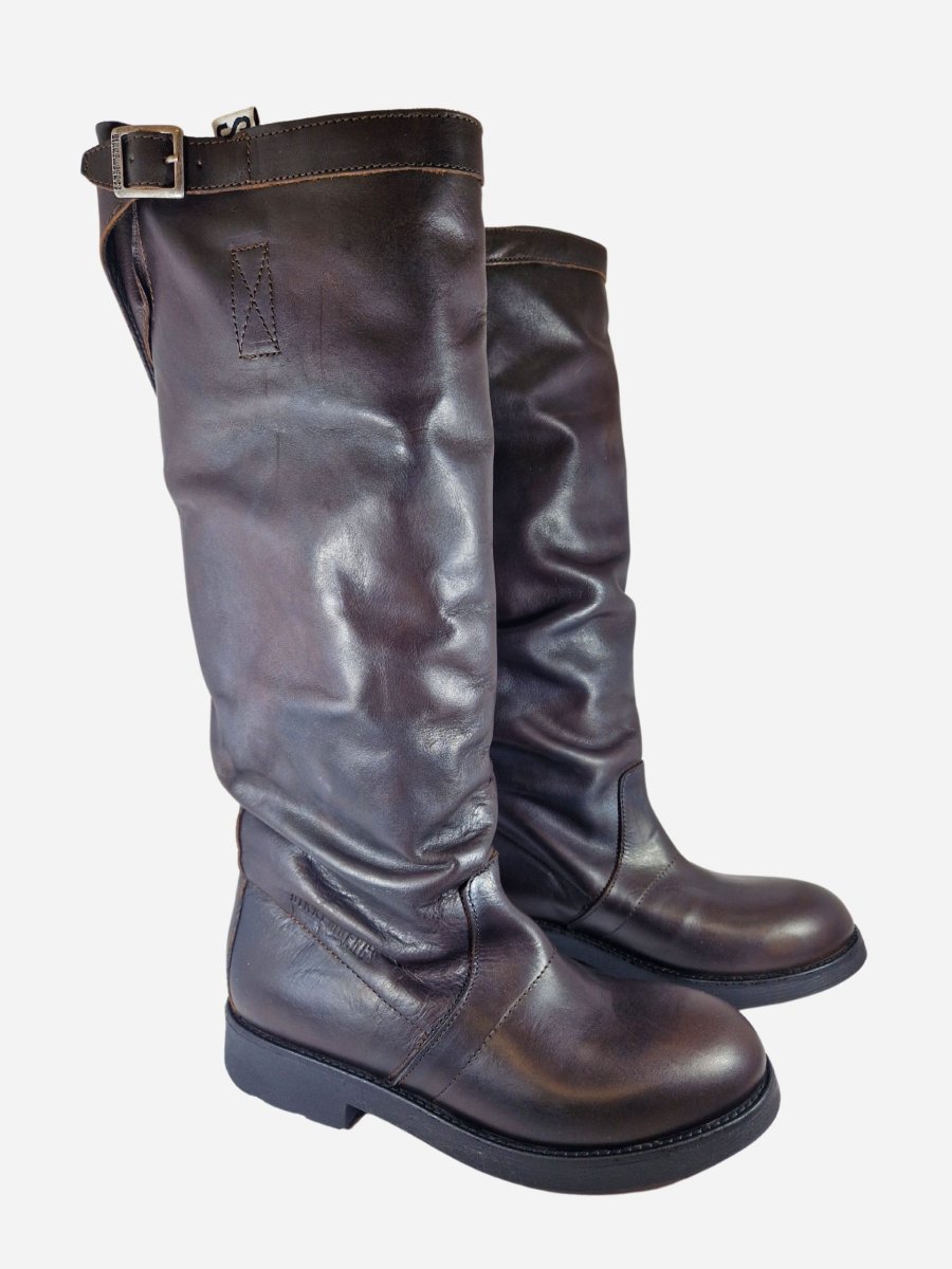 Stivali al ginocchio stile vintage di Bikkembergs. Realizzati in vera pelle effetto invecchiato dalla linea morbida, con interno in pelle e suola in gomma. Fibbia sul bordo superiore.