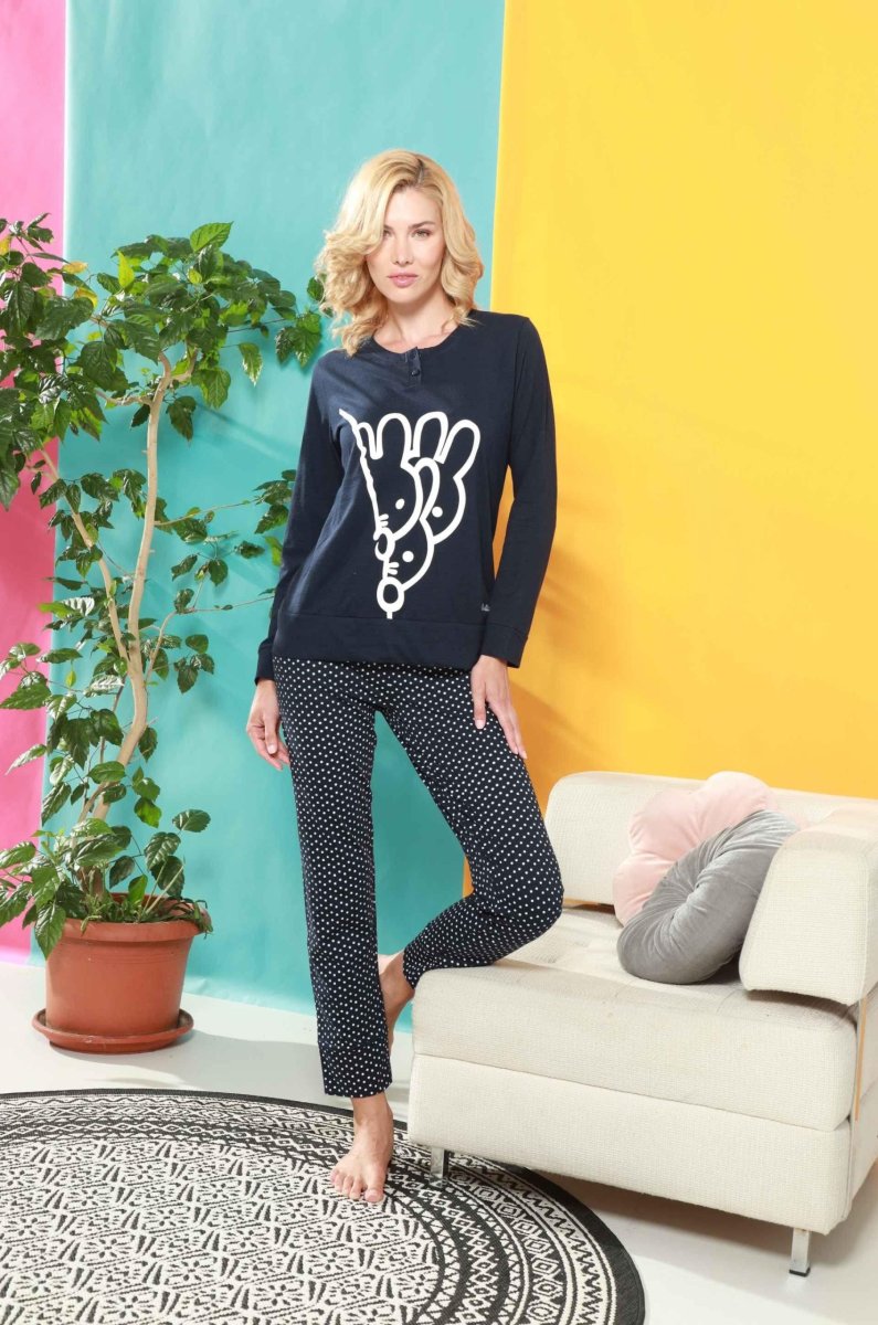 Pigiama donna Nacshua primavera/estate, maglia manica lunga a serafino con bottoncini, pantalone lungo con fantasia. Composizione: 100% cotone. Confezione da 6 pezzi. Disponibile nei colori Blu e Grigio nelle taglie Assortite S (1pz) โ M (2pz) โ L (2pz) โ XL (1pz).