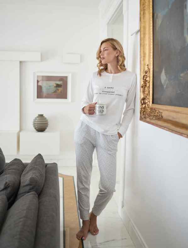 Pigiama donna Nacshua primavera/estate, maglia manica lunga a serafino con bottoncini, pantalone lungo con fantasia. Composizione: 100% cotone. Confezione da 6 pezzi. Disponibile nei colori Bianco/Grigio e Grigio/Bianco nelle taglie Assortite S (1pz) โ M (2pz) โ L (2pz) โ XL (1pz).