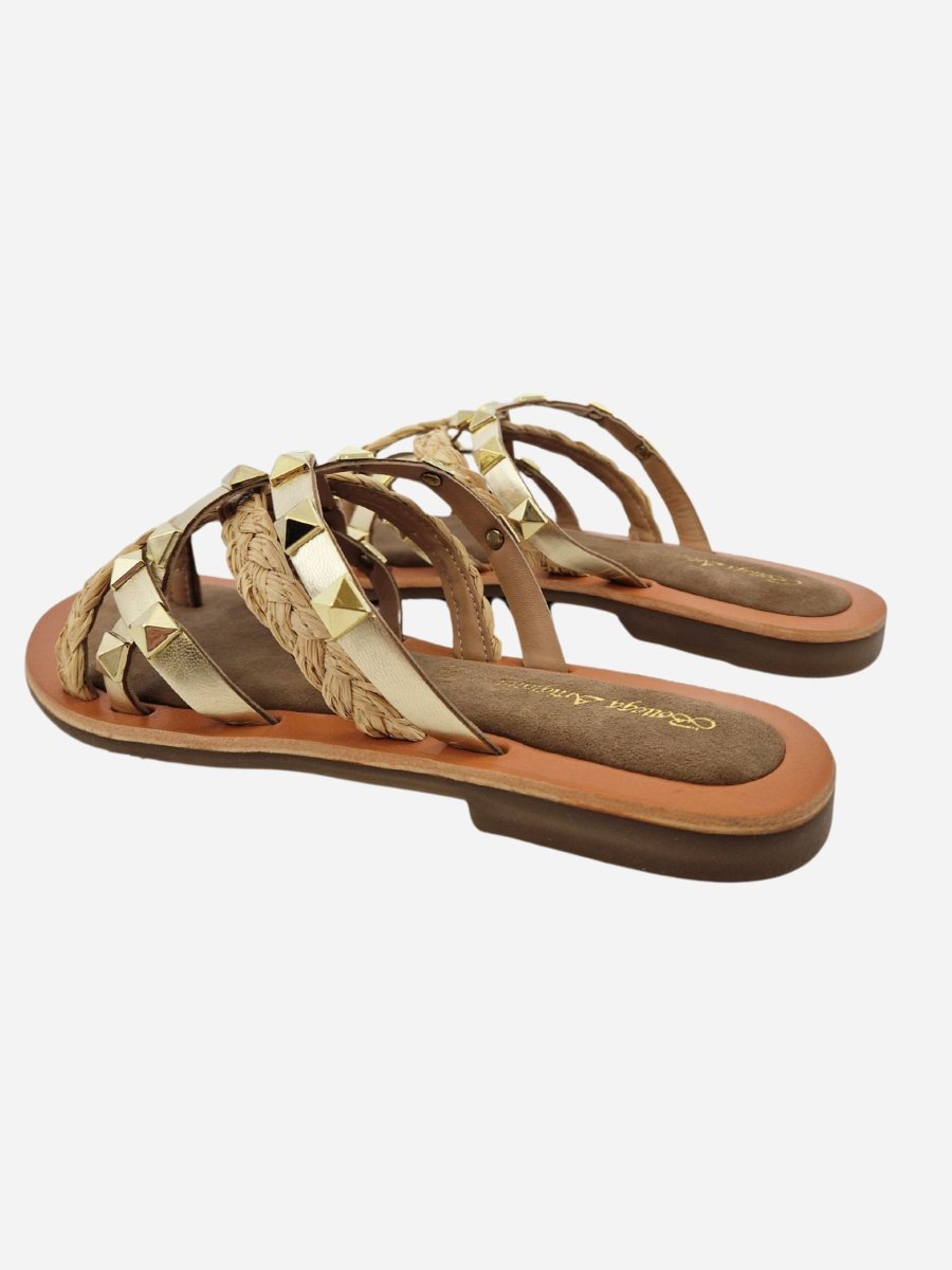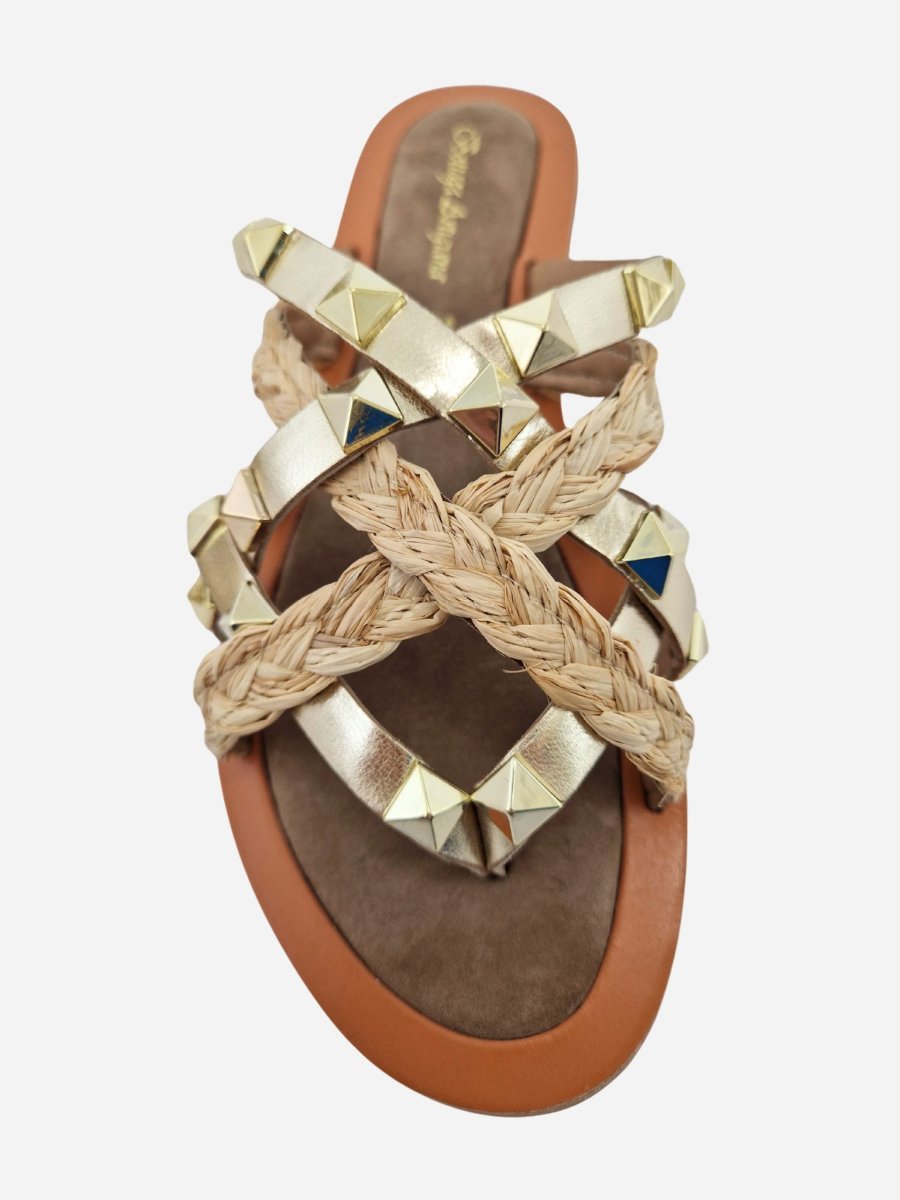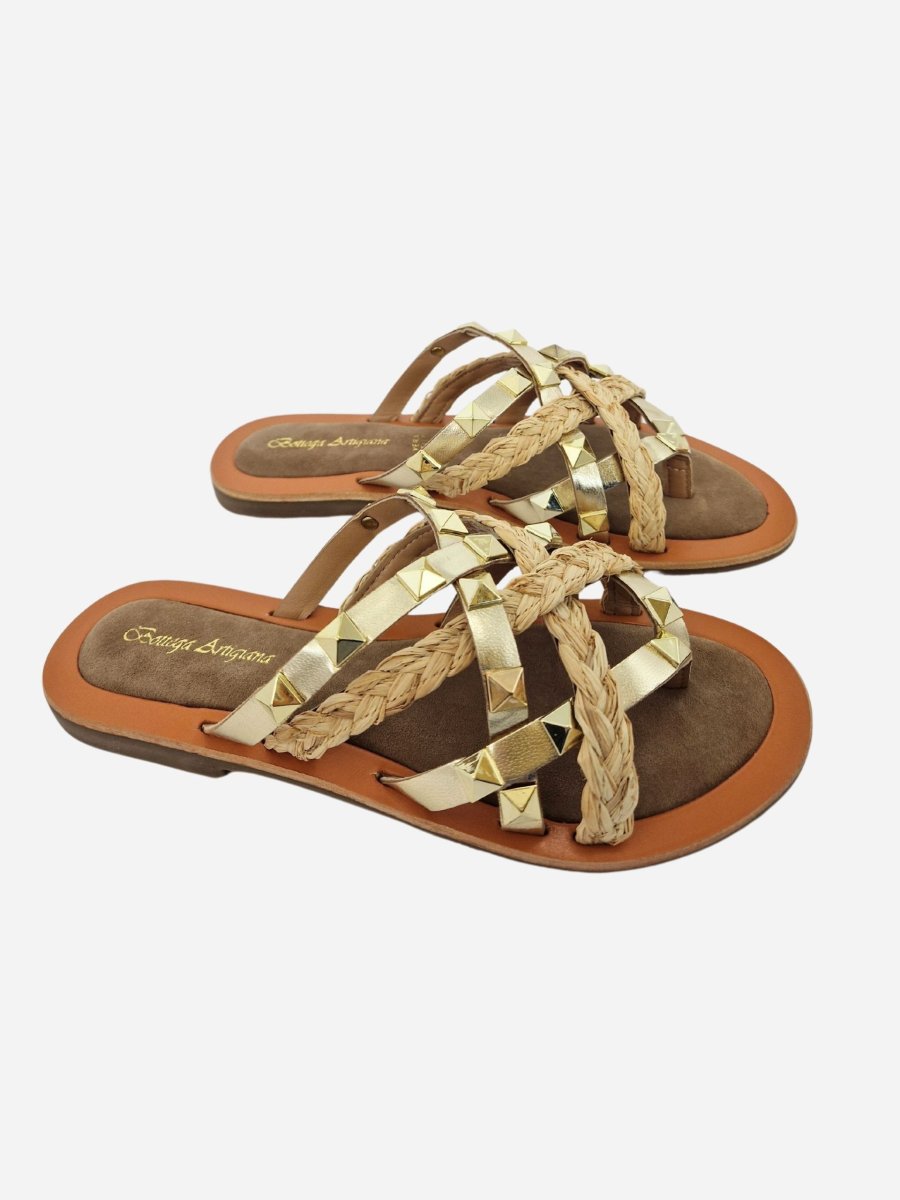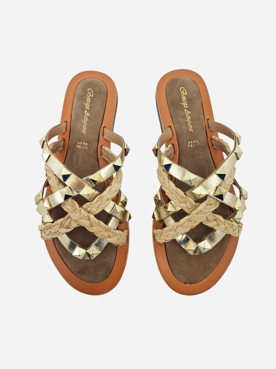 Ciabatte by Bottega Artigiana. Calzature con fascette incrociate realizzate in vera pelle e corda con fondo morbido, arricchite da borchie applicate. Punta arrotondata.