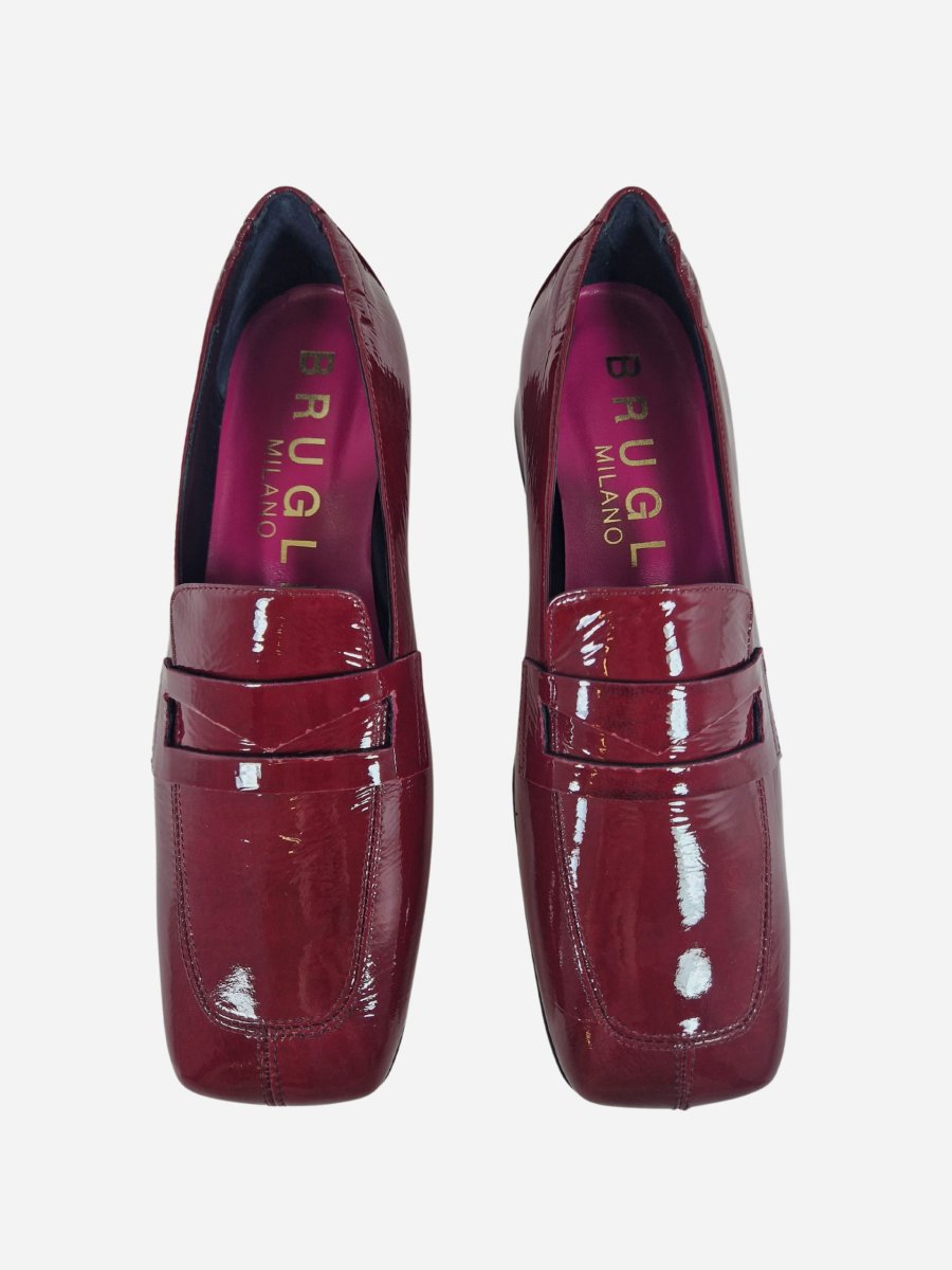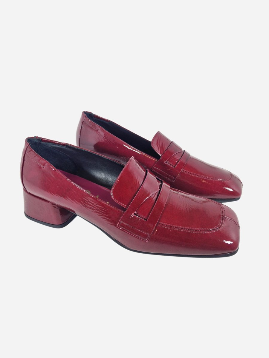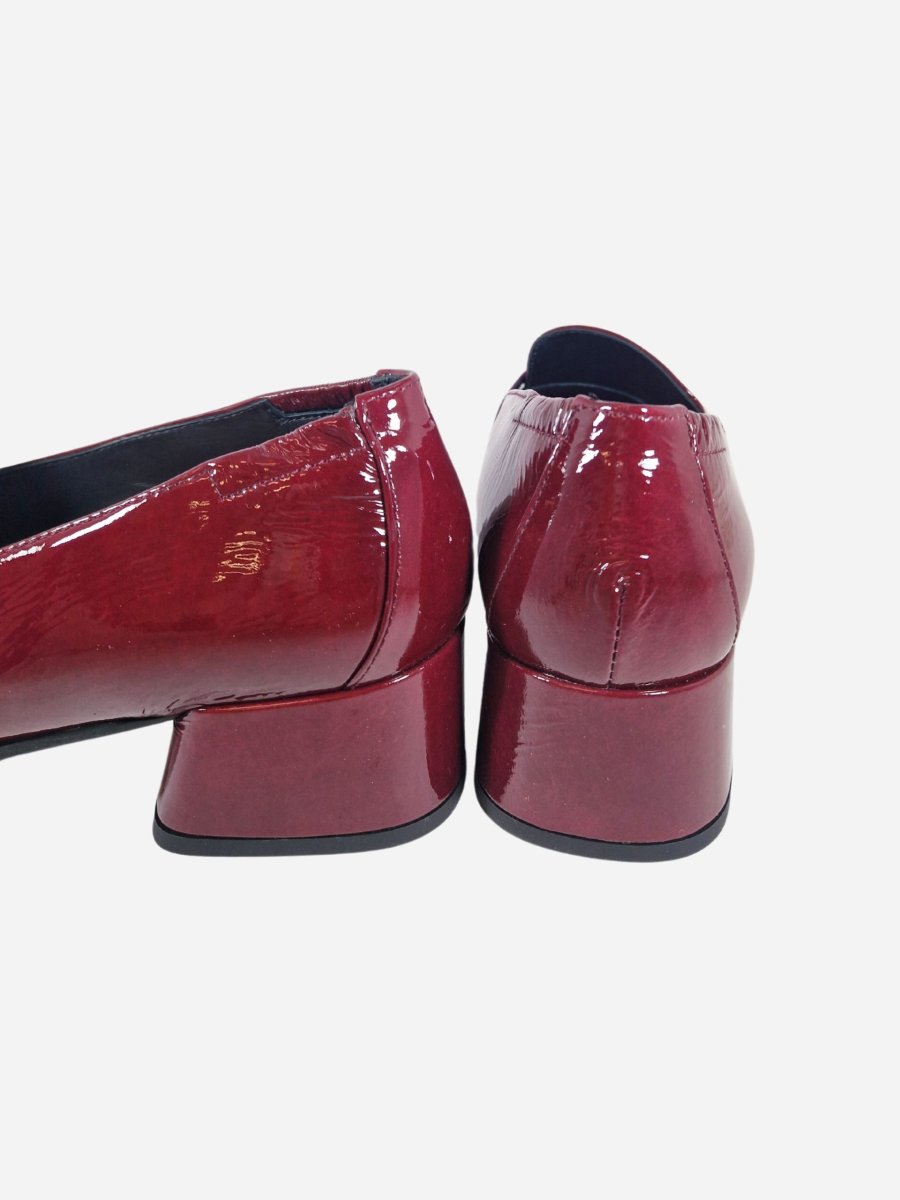 Mocassini con tacco largo di 3 cm arricchiti da un accessorio sulla punta. Calzature realizzate in vera pelle verniciata, con fondo in cuoio e suola in materiale sintetico.