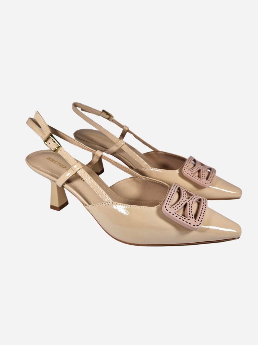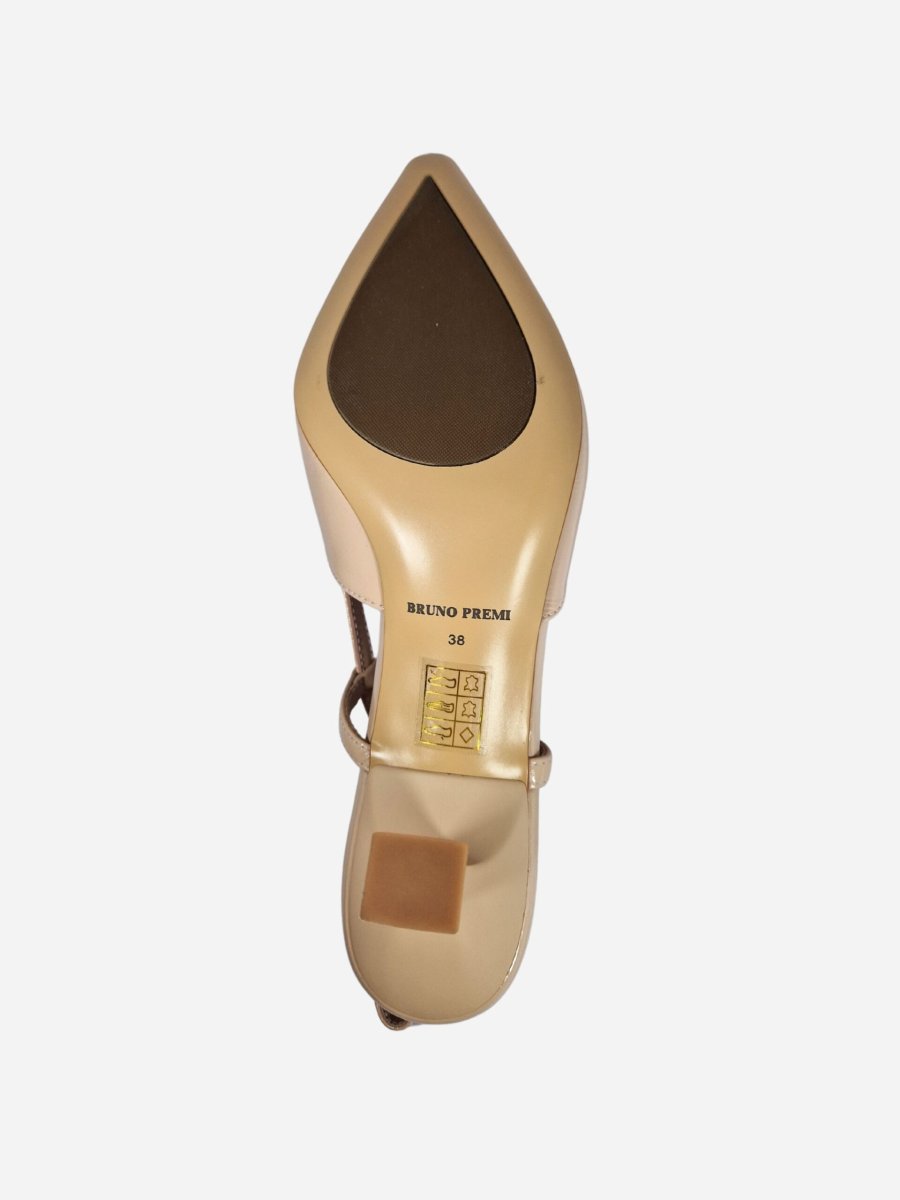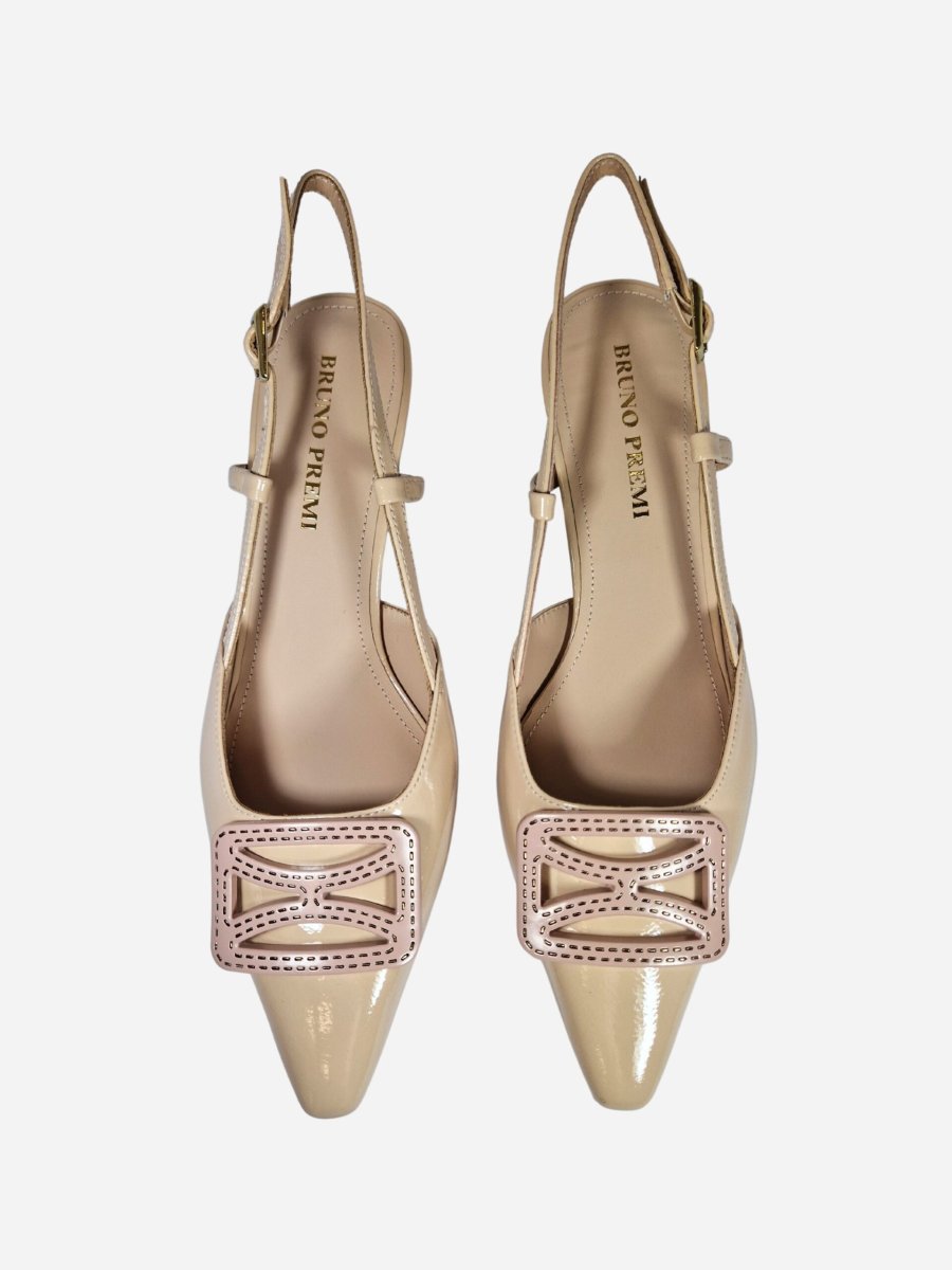 Slingback by Bruno Premi. Calzature realizzate in vera pelle verniciata, con interno in morbido cuoio e suola in materiale sintetico. La punta รจ arricchita da un accessorio tono su tono. Tacco di 7 cm. Chiusura con cinturino al tallone.