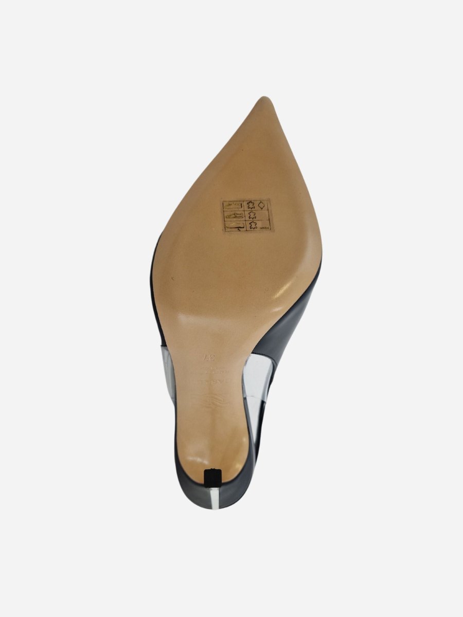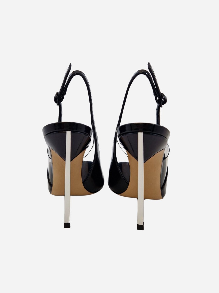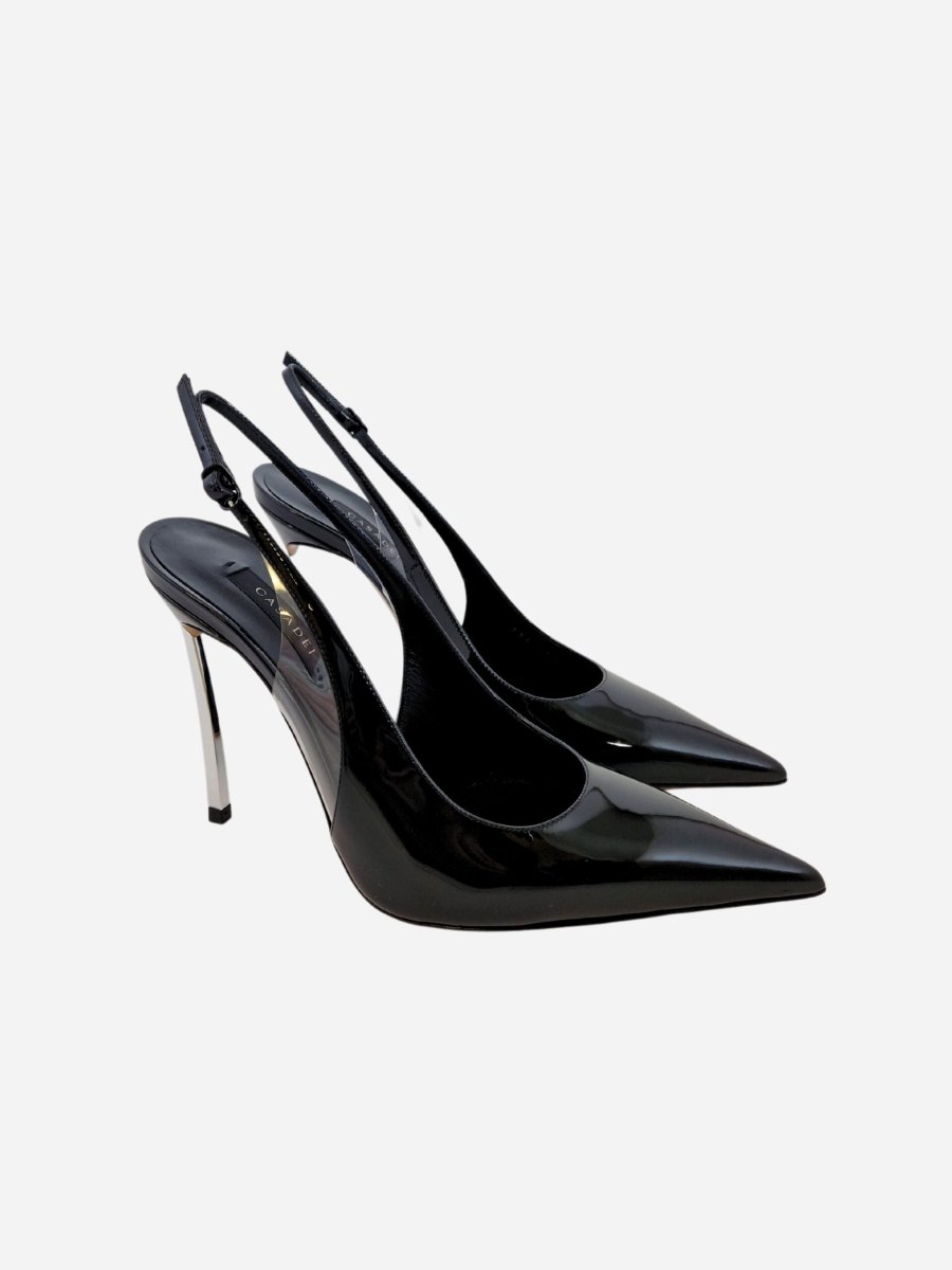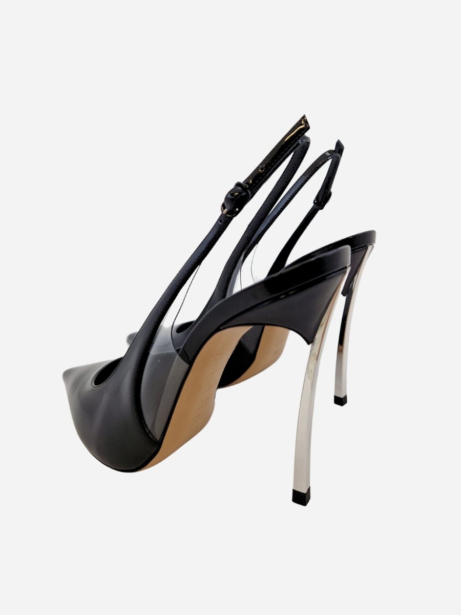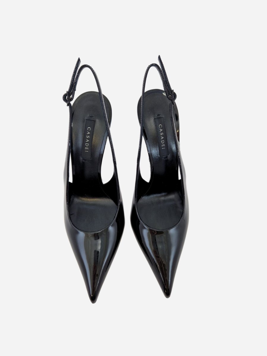 Slingback by Casadei. Scarpe realizzate in vera pelle di vitello verniciata con mobido fondo in cuoio. Inserti in pvc laterali. Iconico tacco blade di 10 cm simbolo della maison. Disponibile in due varianti: nero, arancione.
