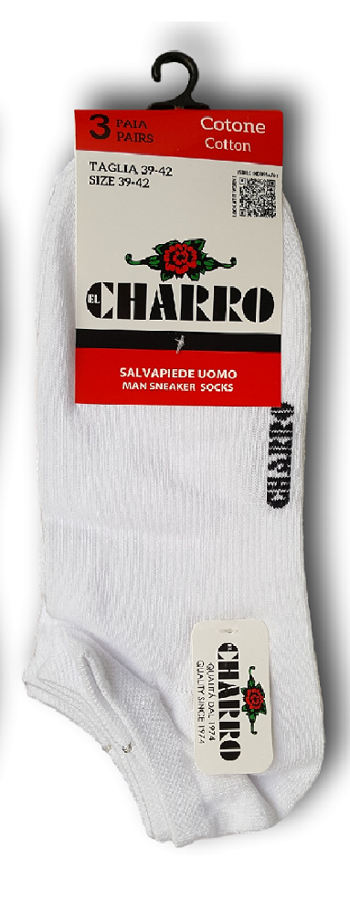 Fantasmino unisex Charro, realizzato in morbido cotone elasticizzato, garantisce comfort e stabilitร .ย Composizione: 72% cotone, 26% poliestere, 2% elastan. Confezione da 12 pezzi. Disponibile nei colori Bianco, Blu e Nero nelle taglie 35/38 โ 39/42 โ 43/46.