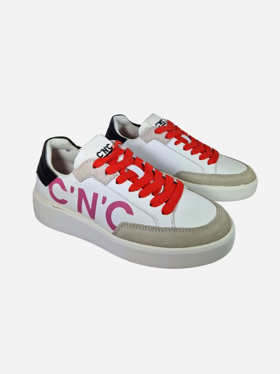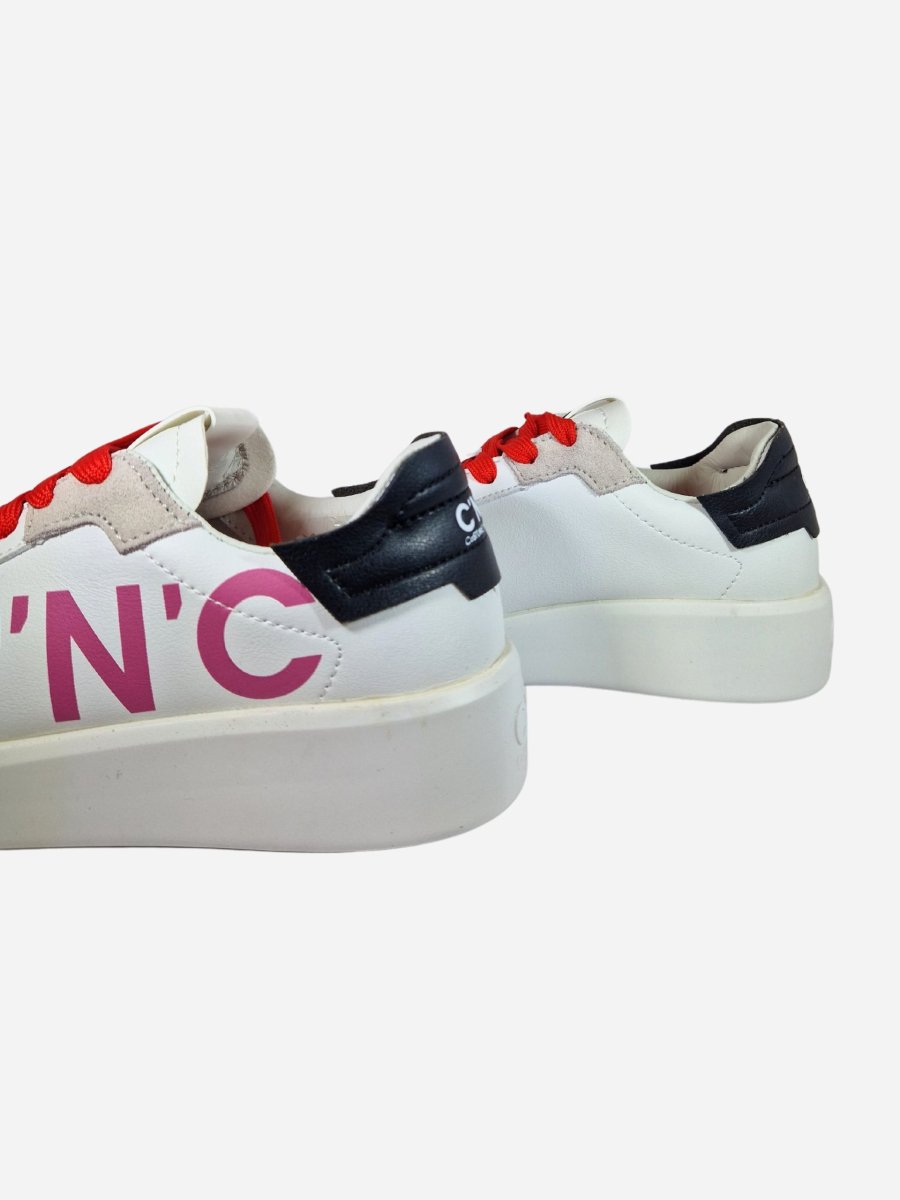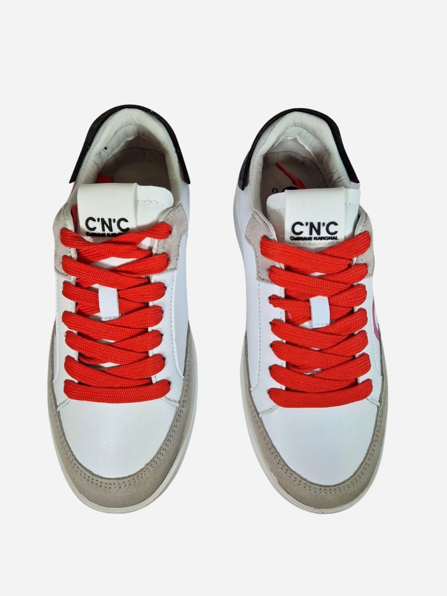 Sneakers 18808 by Costume National. Scarpe realizzate in pelle con inserti in camoscio a contrasto, caratterizzate da maxi logo laterale. Toppone in pelle nera a contrasto. Chiusura con lacci colorati.