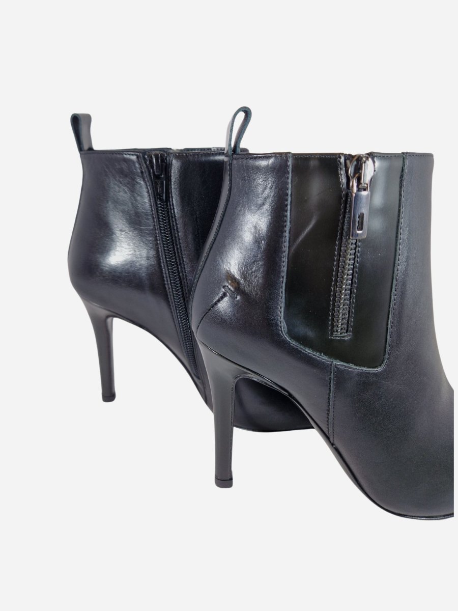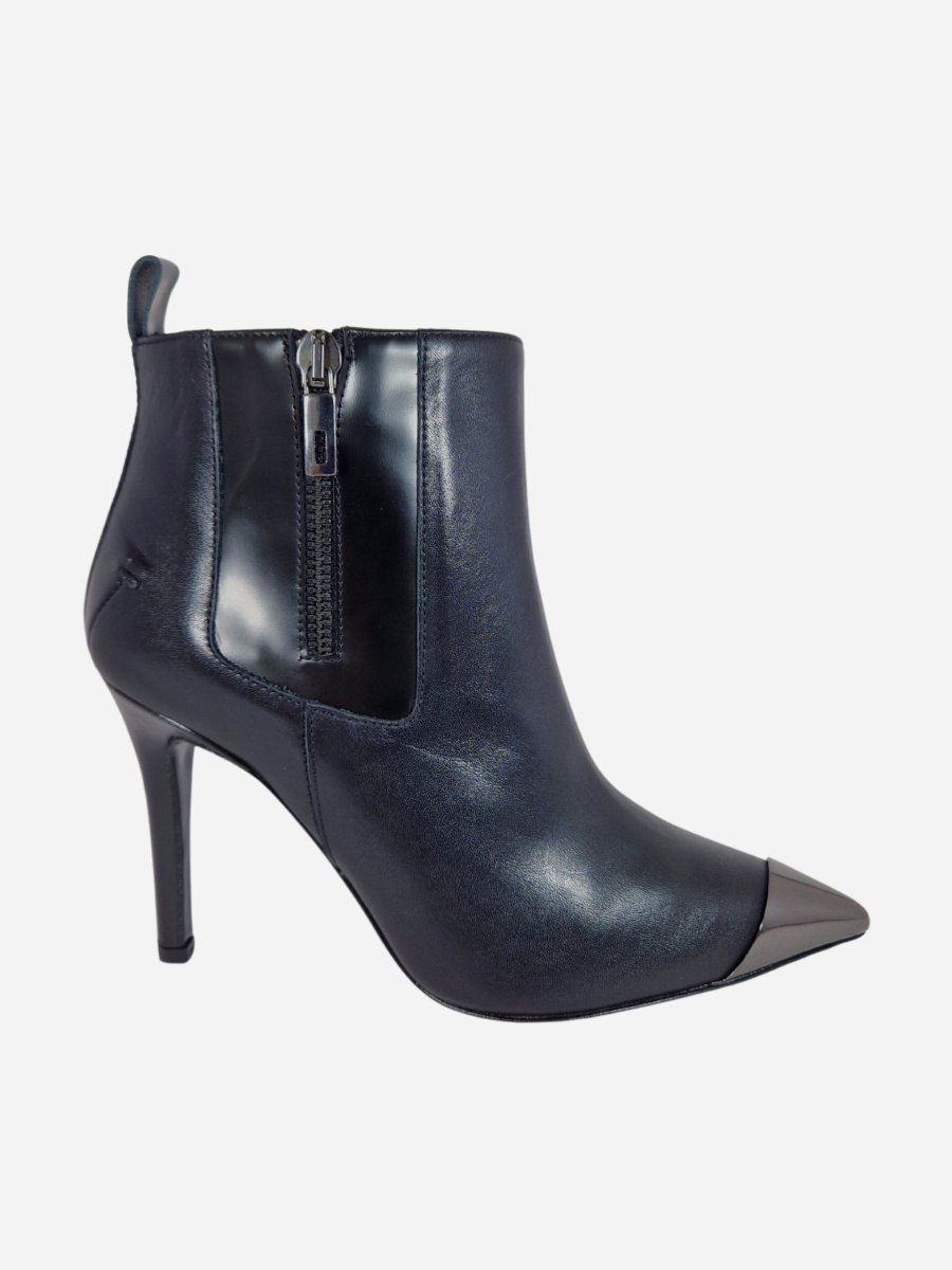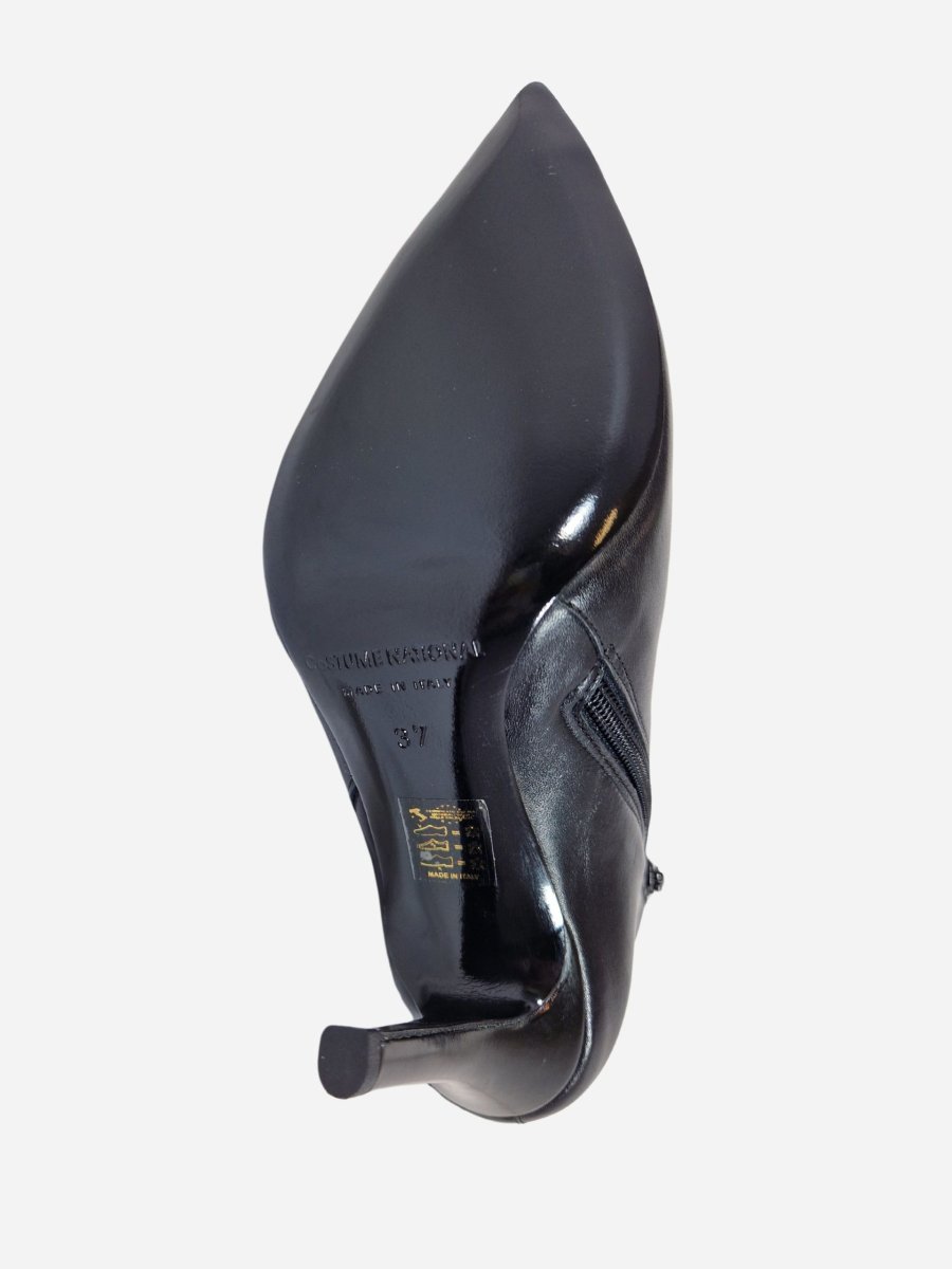 Tronchetto by Costume National. Calzature realizzate in vera pelle, arricchite da una doppia zip laterale e punta metallica a contrasto. Tacco a spillo di 7 cm. Made in Italy