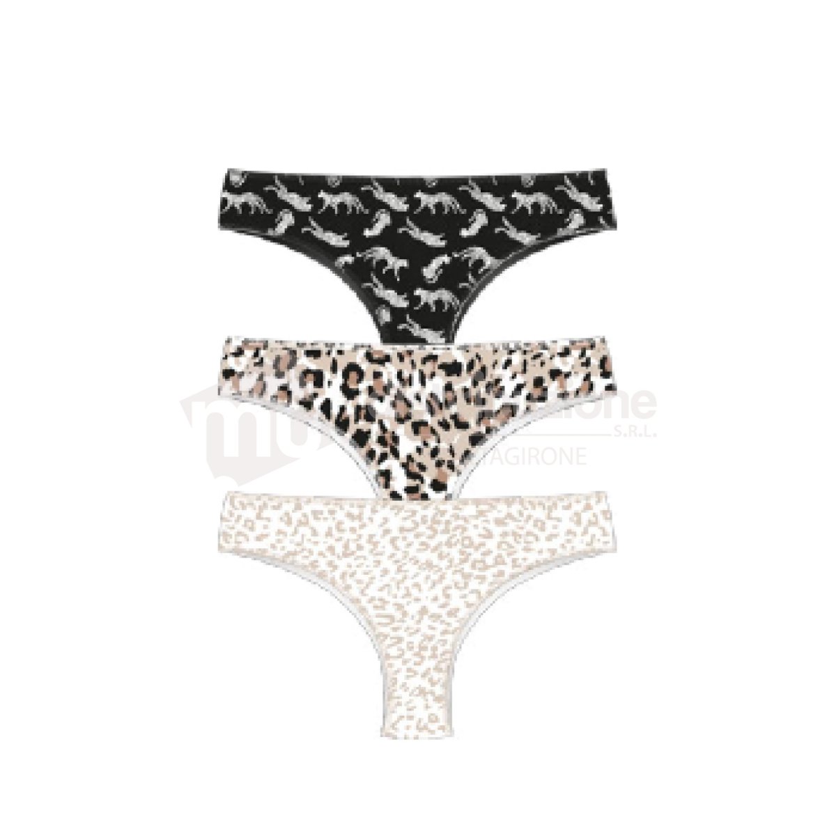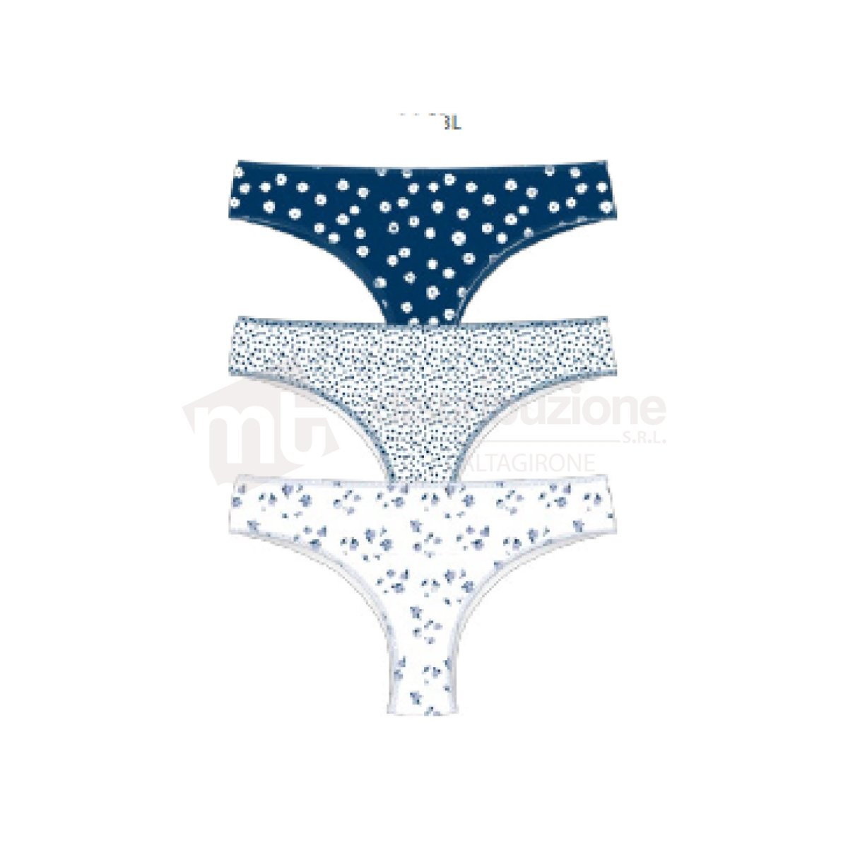 Brasiliana donna Cotonella con fantasia, in morbido cotone bielastico con bordino invisibile, cucitura piatta e antisegno ideale da utilizzare con pantaloni o abiti aderenti. Composizione: 95% Cotone , 5% Elastan Confezione da 12 pezzi in blister da 3 pezzi. Disponibile nei colori Assortiti Blu e Assortiti Nero nelle taglie 2 โ 3 โ 4.