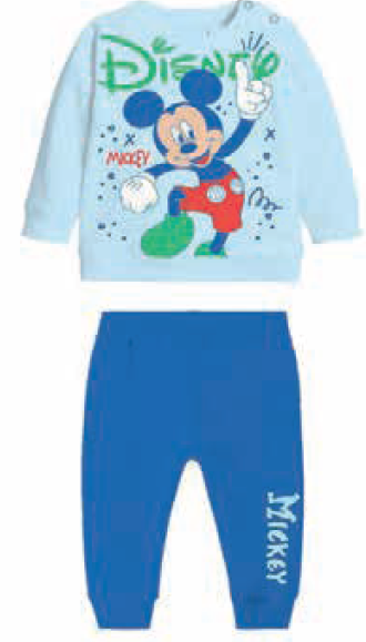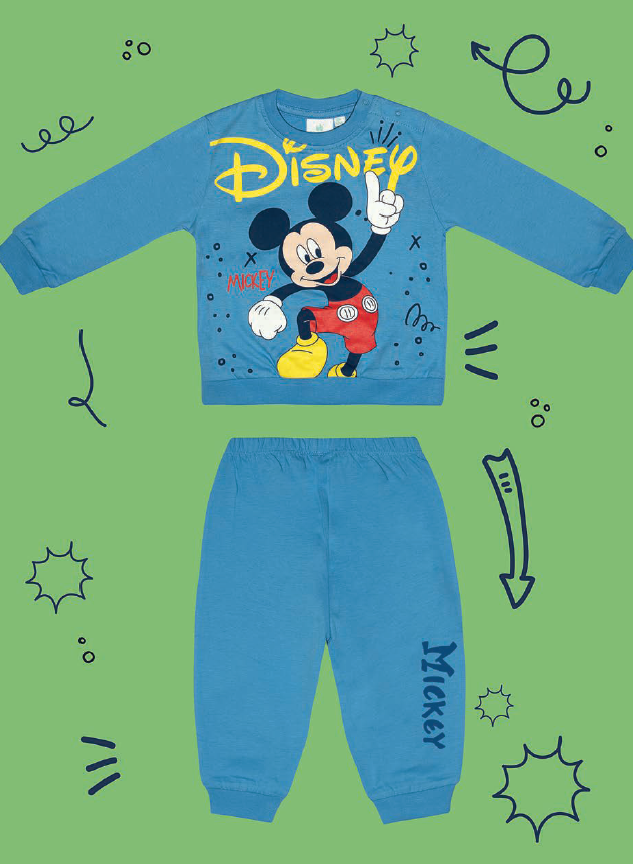 Pigiama baby Disney con fantasia Mickey, maglia manica lunga girocollo, pantalone lungo in tinta unita con polsini alle caviglie. Composizione: 100% cotone. Confezione da 1 pezzo. Disponibile nei colori Avio e Azzurro nelle taglie 12 mesi โ 18 mesi โ 24 mesi โ 30 mesi.
