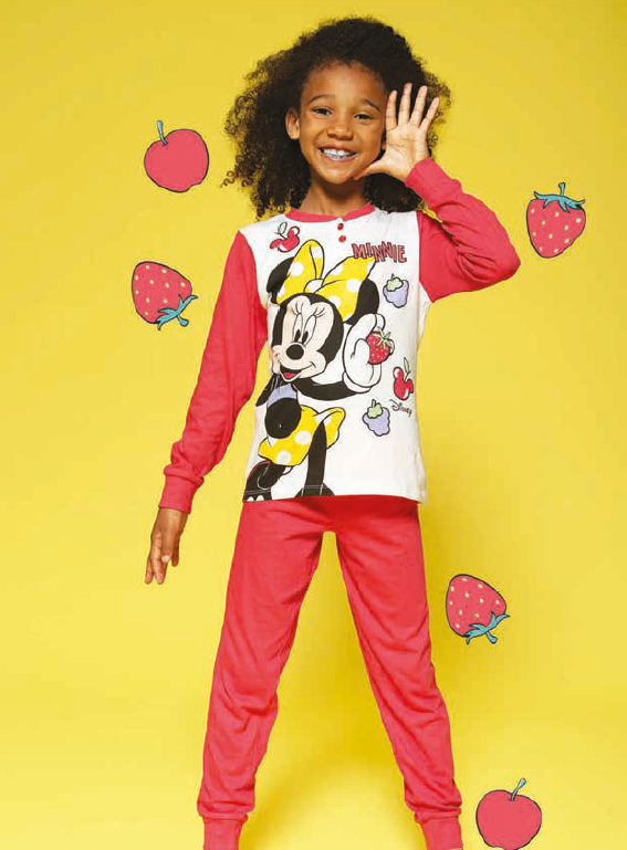 Pigiama bimba Disney con fantasia Minnie, maglia manica lunga girocollo, pantalone lungo in tinta unita con polsini alle caviglie. Composizione: 100% cotone. Confezione da 1 pezzo. Disponibile nei colori Corallo e Rosa nelle taglie 3/4 anni – 5/6 anni – 7/8 anni – 9/10 anni.