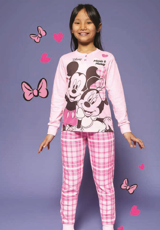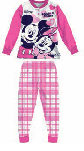 Pigiama bimba Disney con fantasia Minnie e Topolino, maglia manica lunga a serafino con bottoncini, pantalone lungo con stampa a quadri e con polsini alle caviglie . Composizione: 100% cotone. Confezione da 1 pezzo. Disponibile nei colori Fucsia e Rosa nelle taglie 3/4 anni – 5/6 anni – 7/8 anni – 9/10 anni.