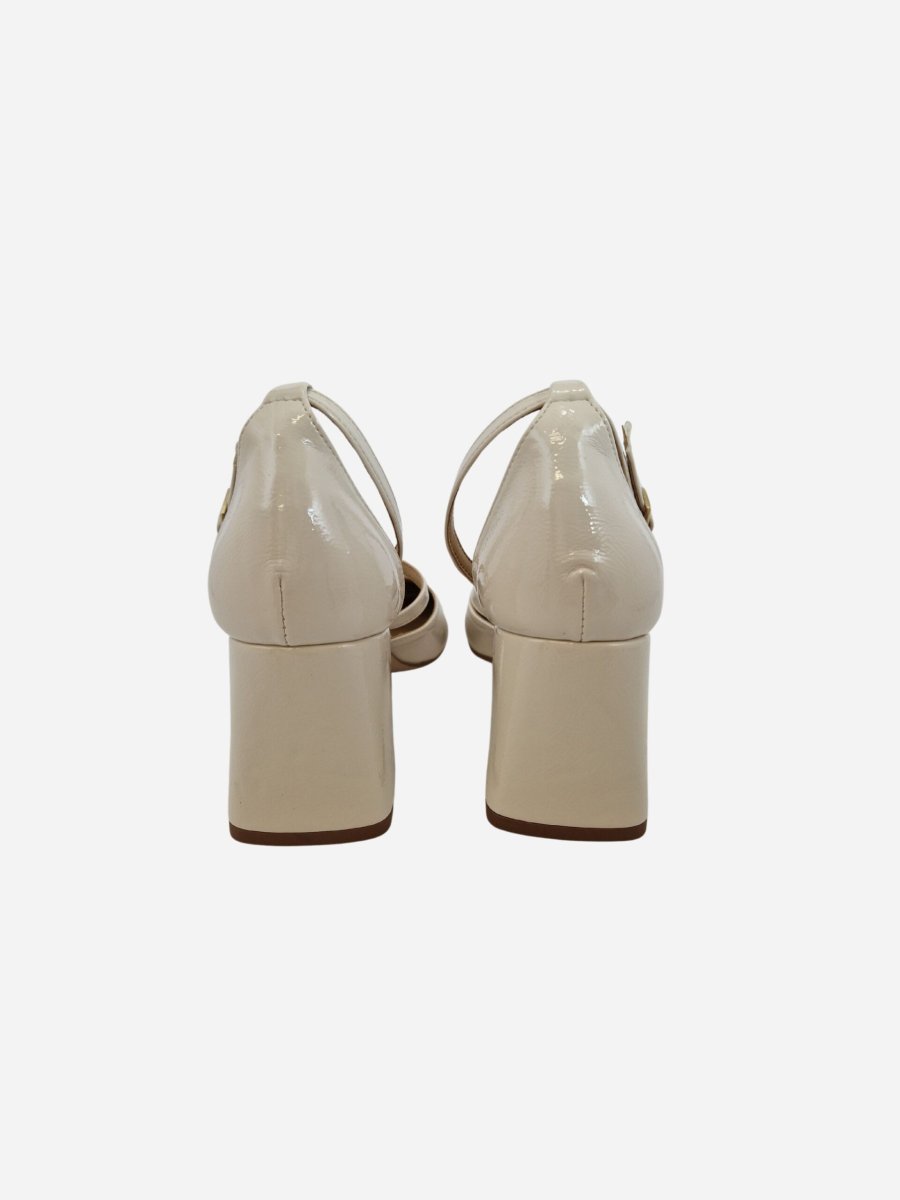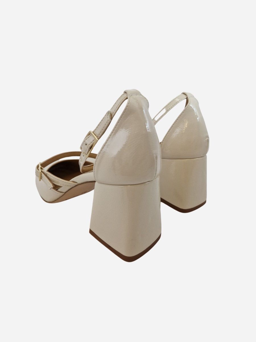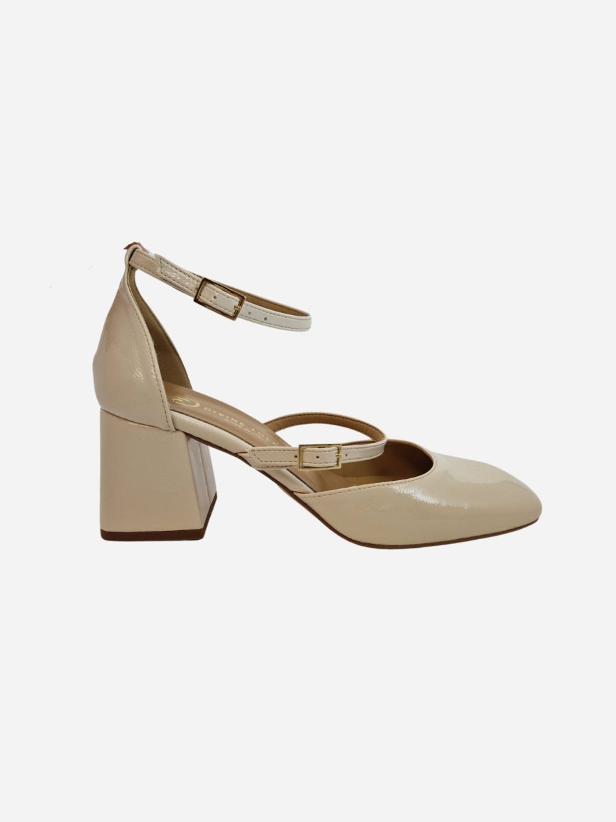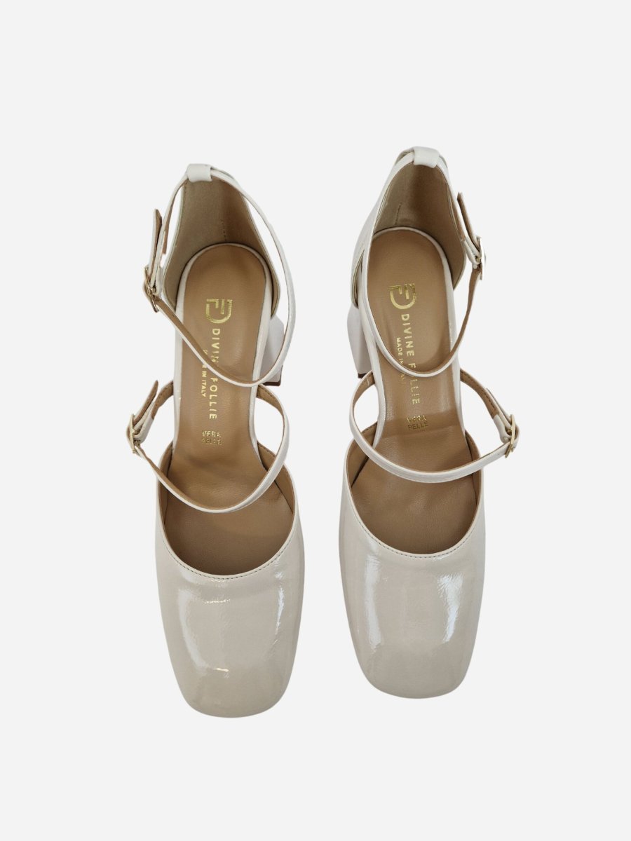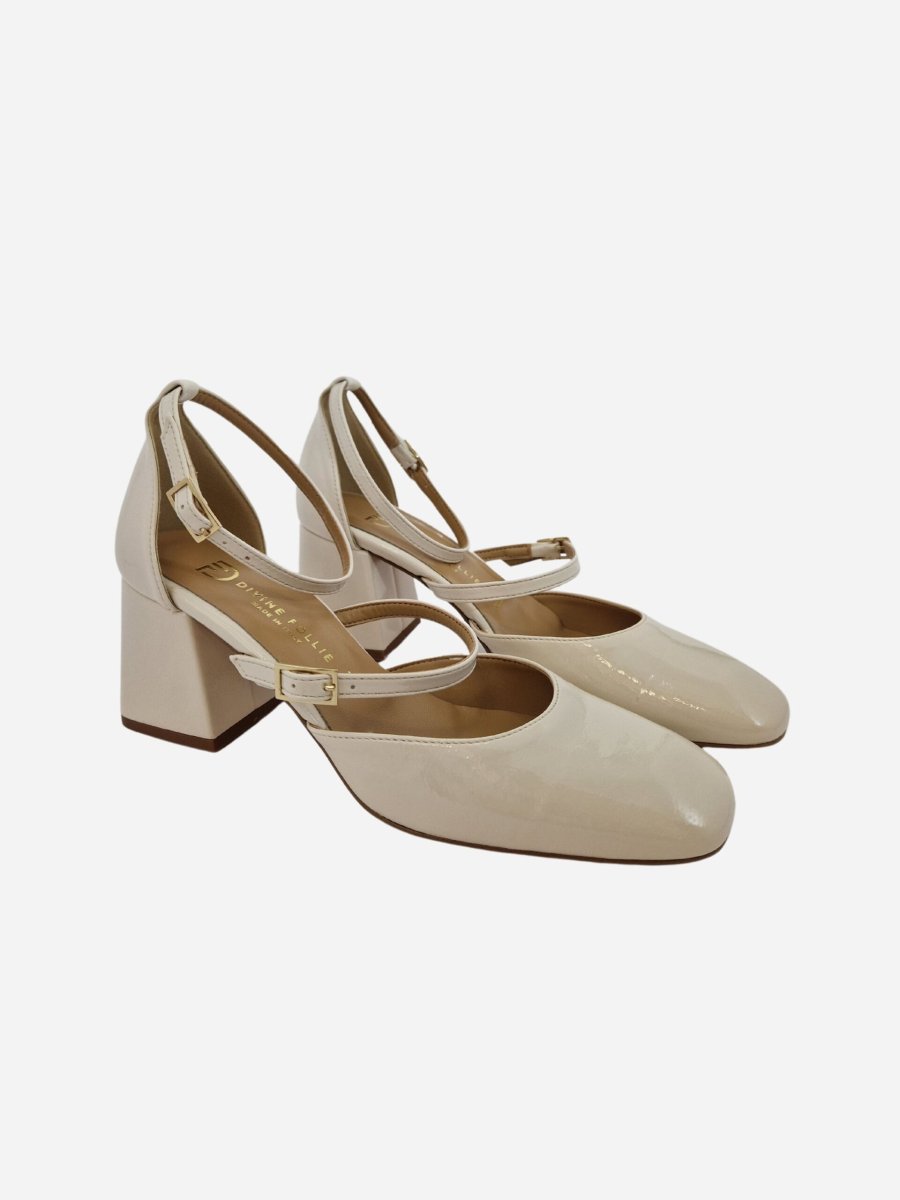 Scarpa con cinturini by Divine Follie. Scarpe realizzate in naplak panna con comodo tacco quadrato 7 cm. Chiusura con doppio cinturino, uno alla caviglia, uno che abbraccia il piede. Punta arrotondata. Suola interna in cuoio. Made in Italy