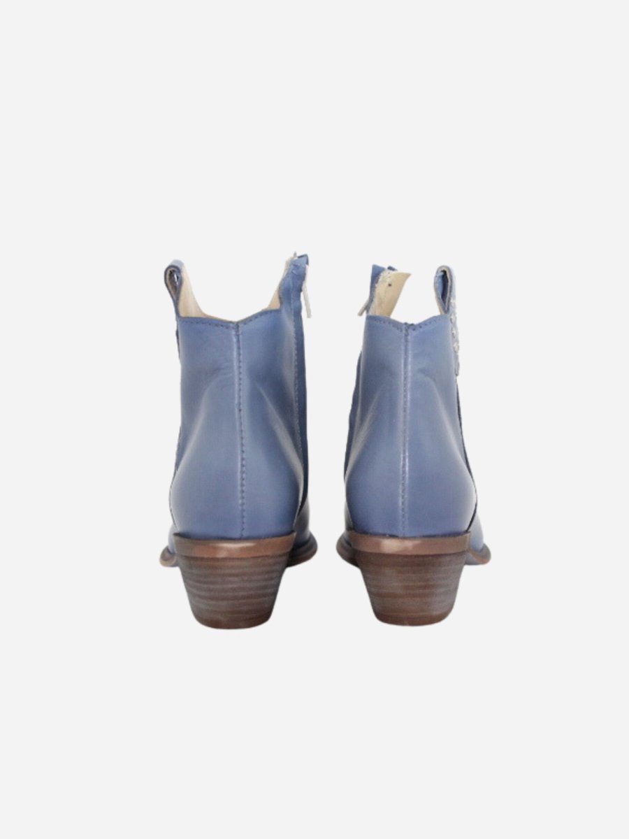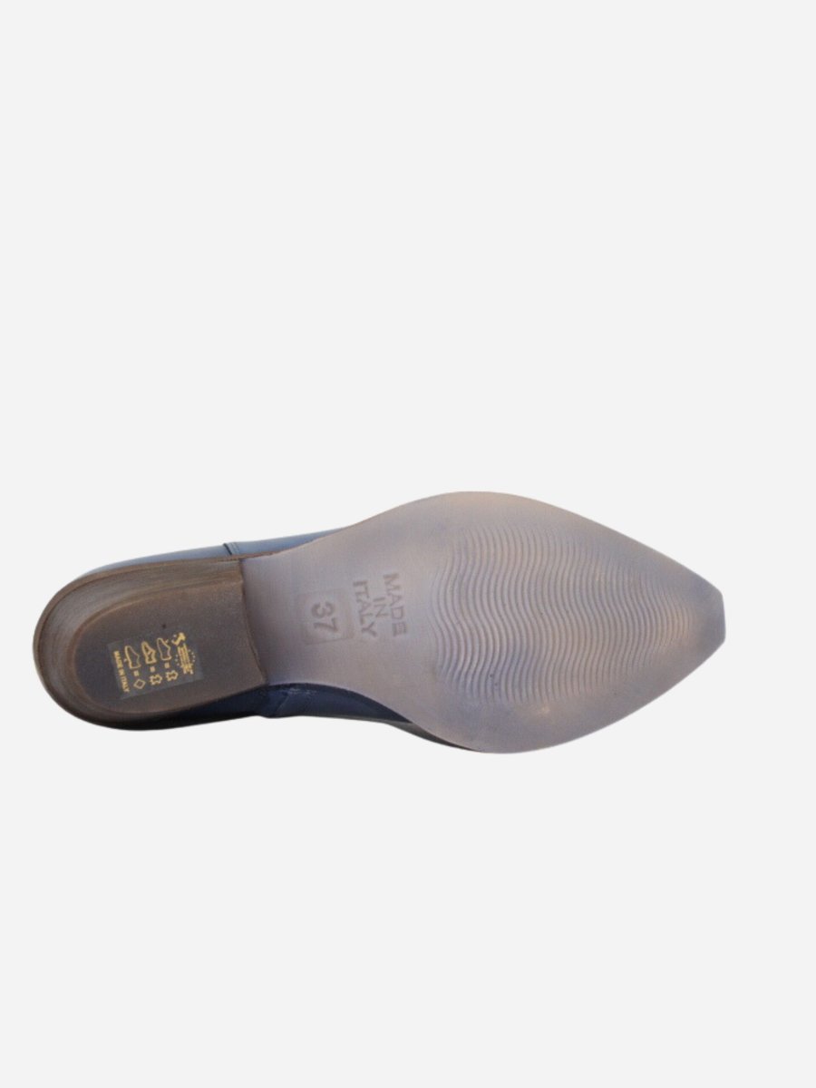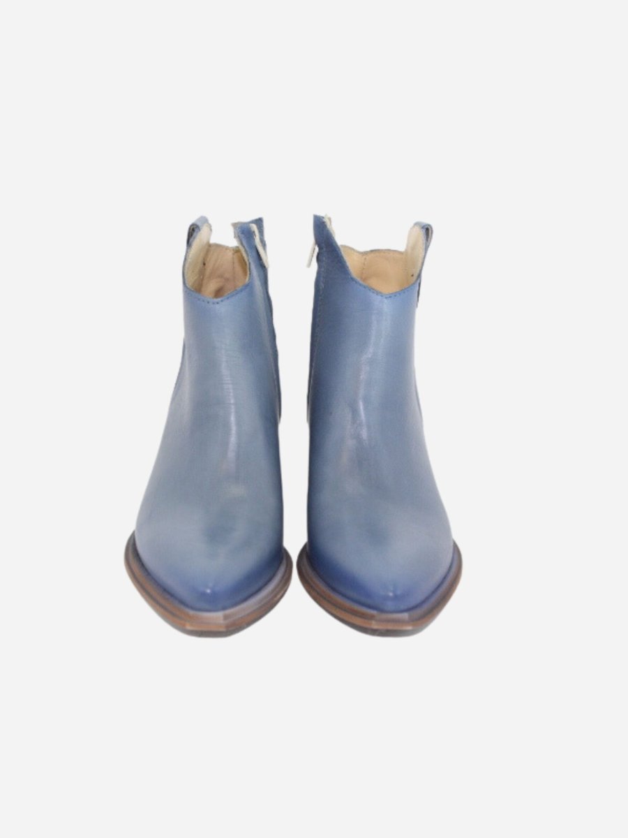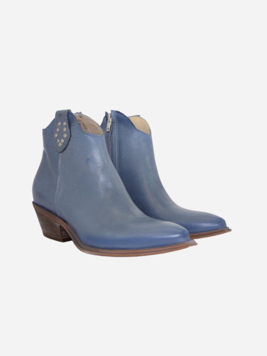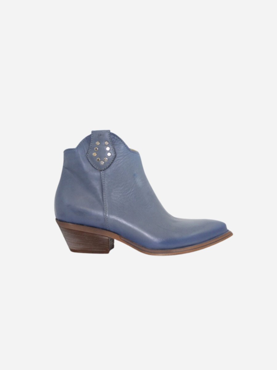 Texano by Divine Follie nella variante blu denim. Scarpe realizzate in nappa effetto invecchiato. Dettaglio con borchiette argento applicate. Comodo tacco largo di 3 cm.
