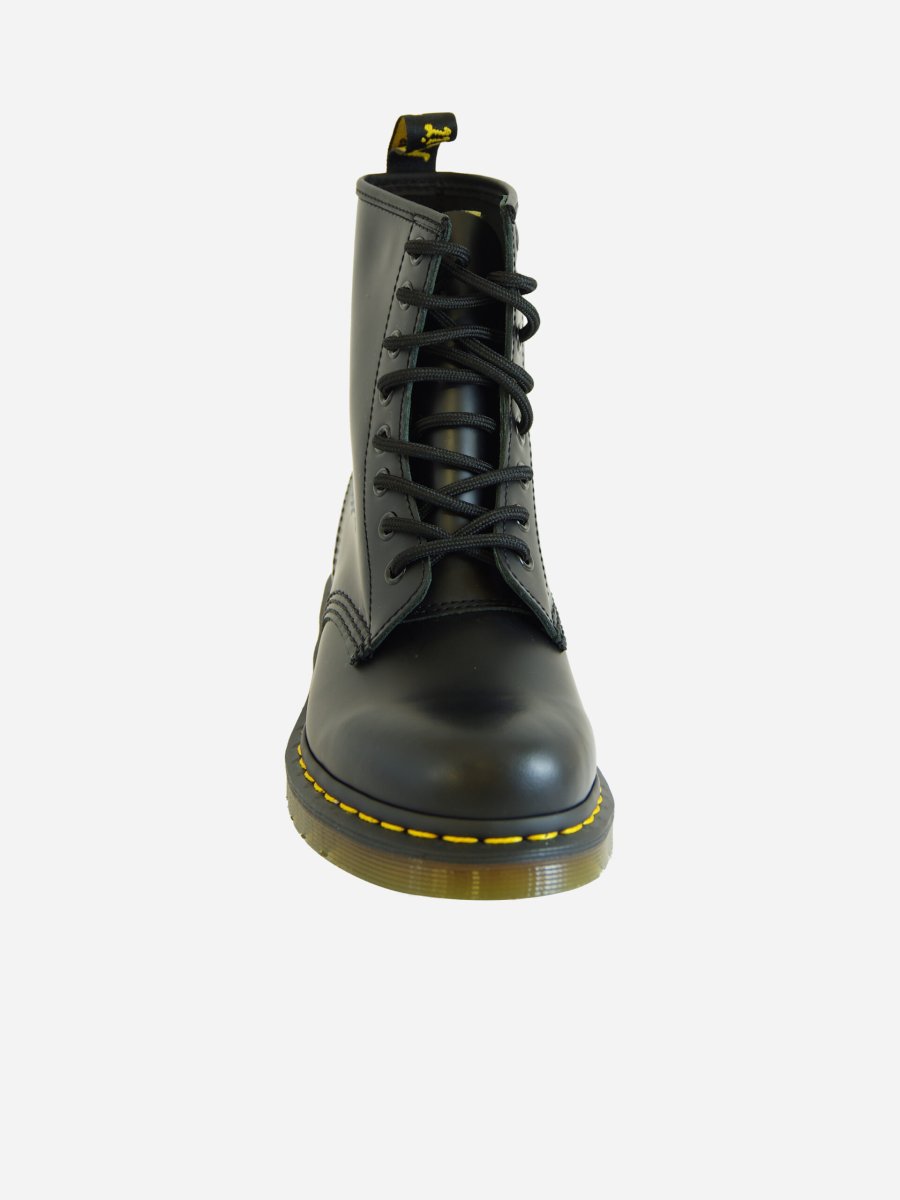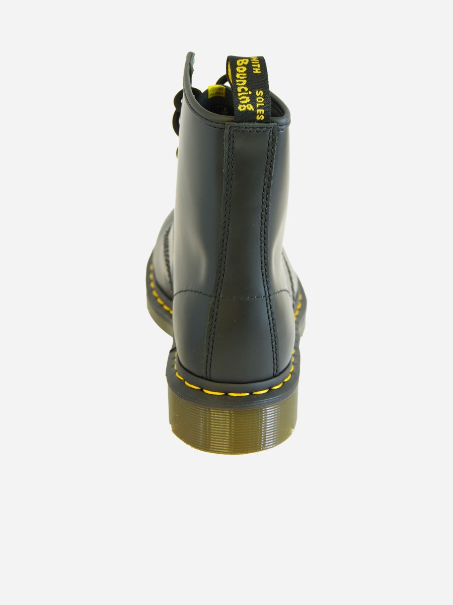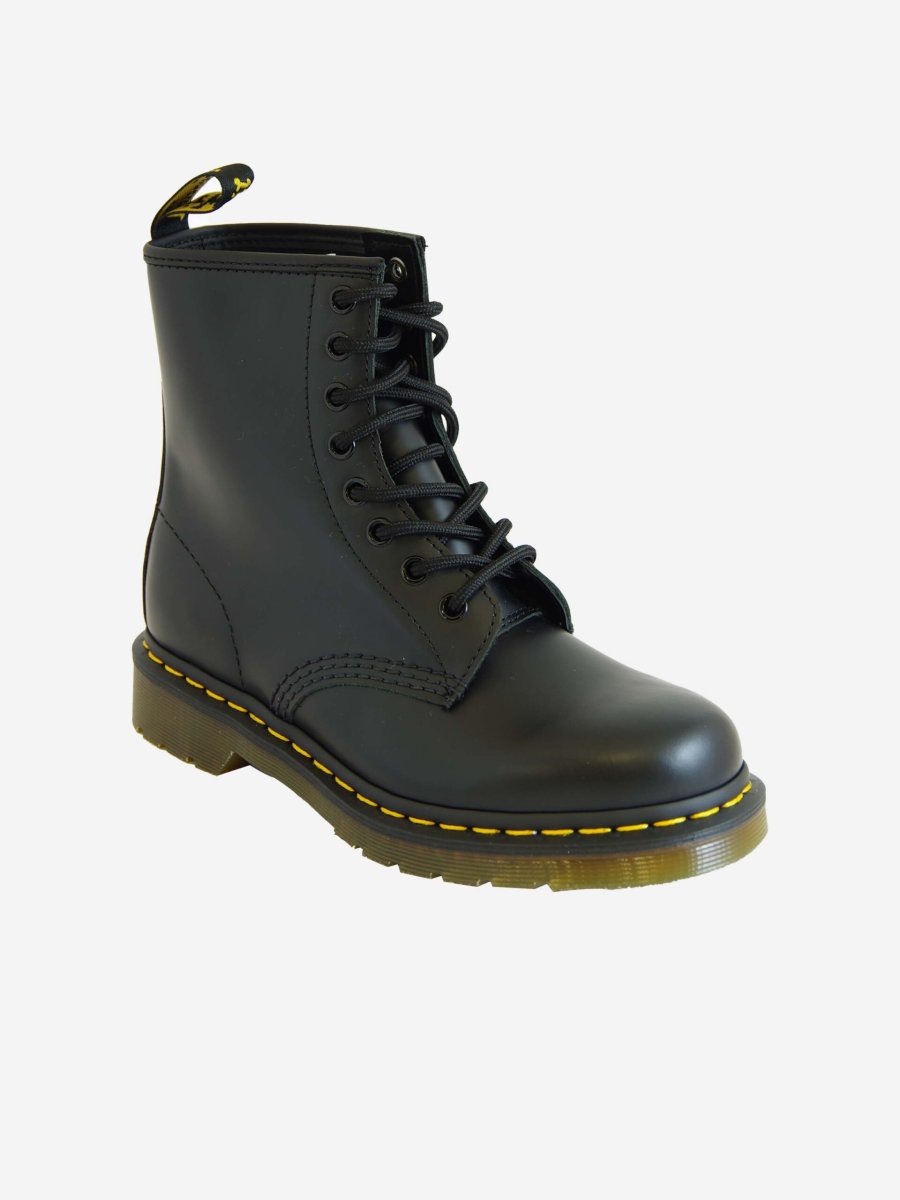 Anfibio di Dr. Martens. Anfibio stringato a 8 fori con cuciture gialle a vista, linguetta sul tallone e colore nero spazzolato.