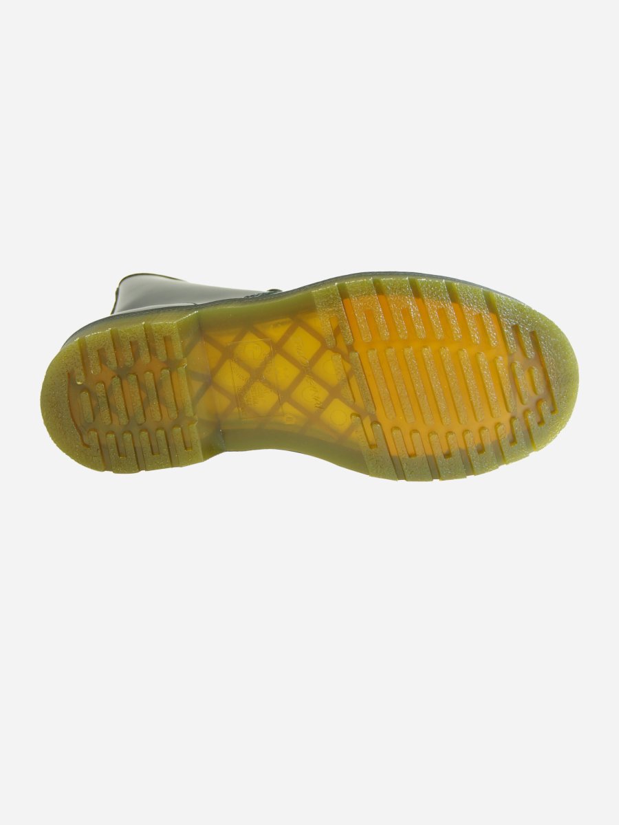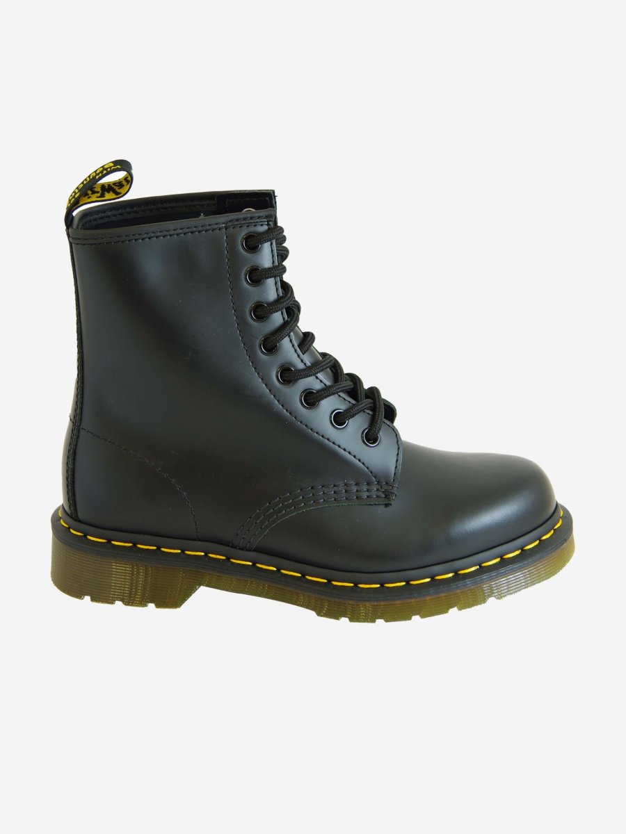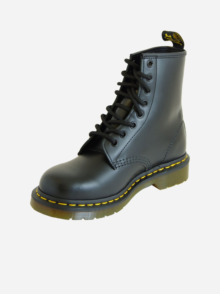 Anfibio di Dr. Martens. Anfibio stringato a 8 fori con cuciture gialle a vista, linguetta sul tallone e colore nero spazzolato.
