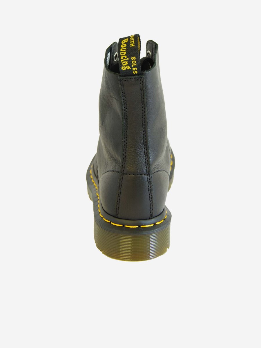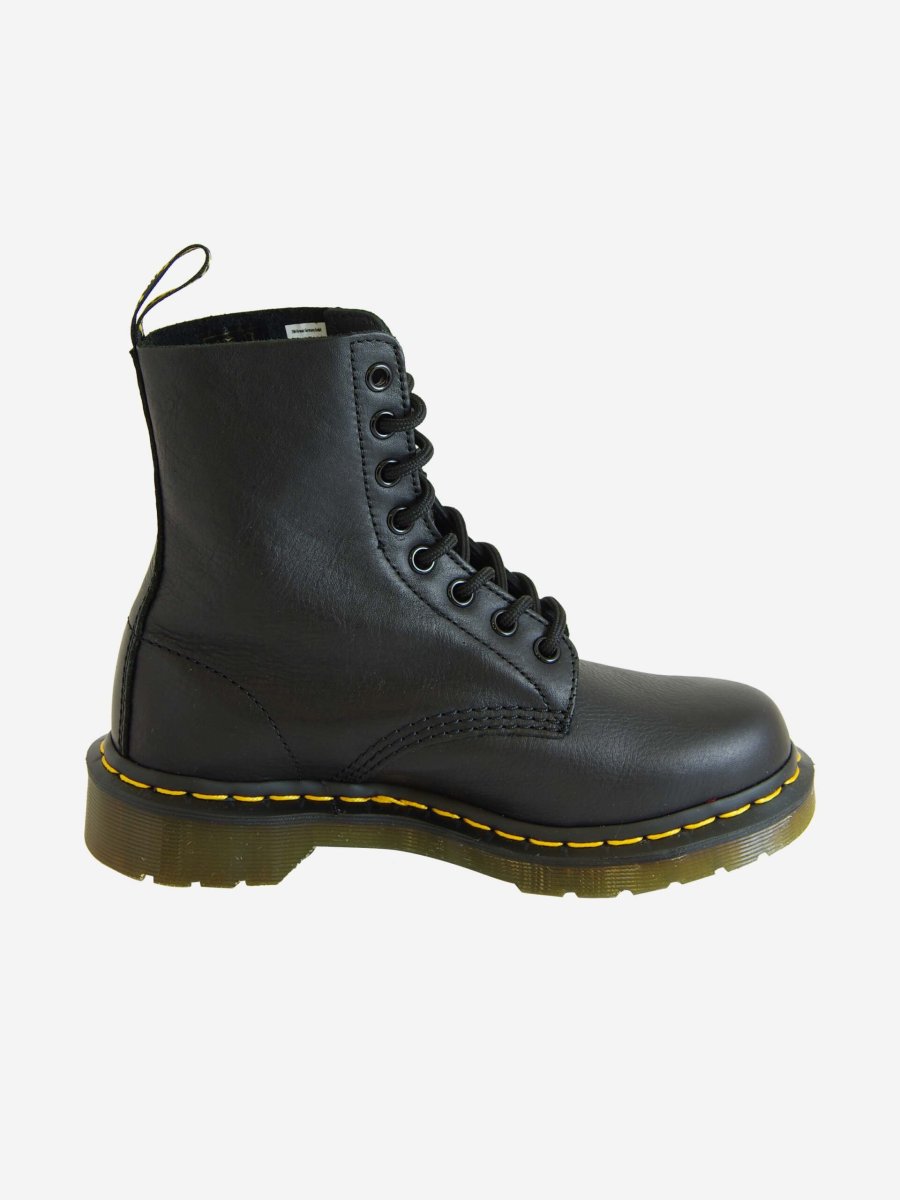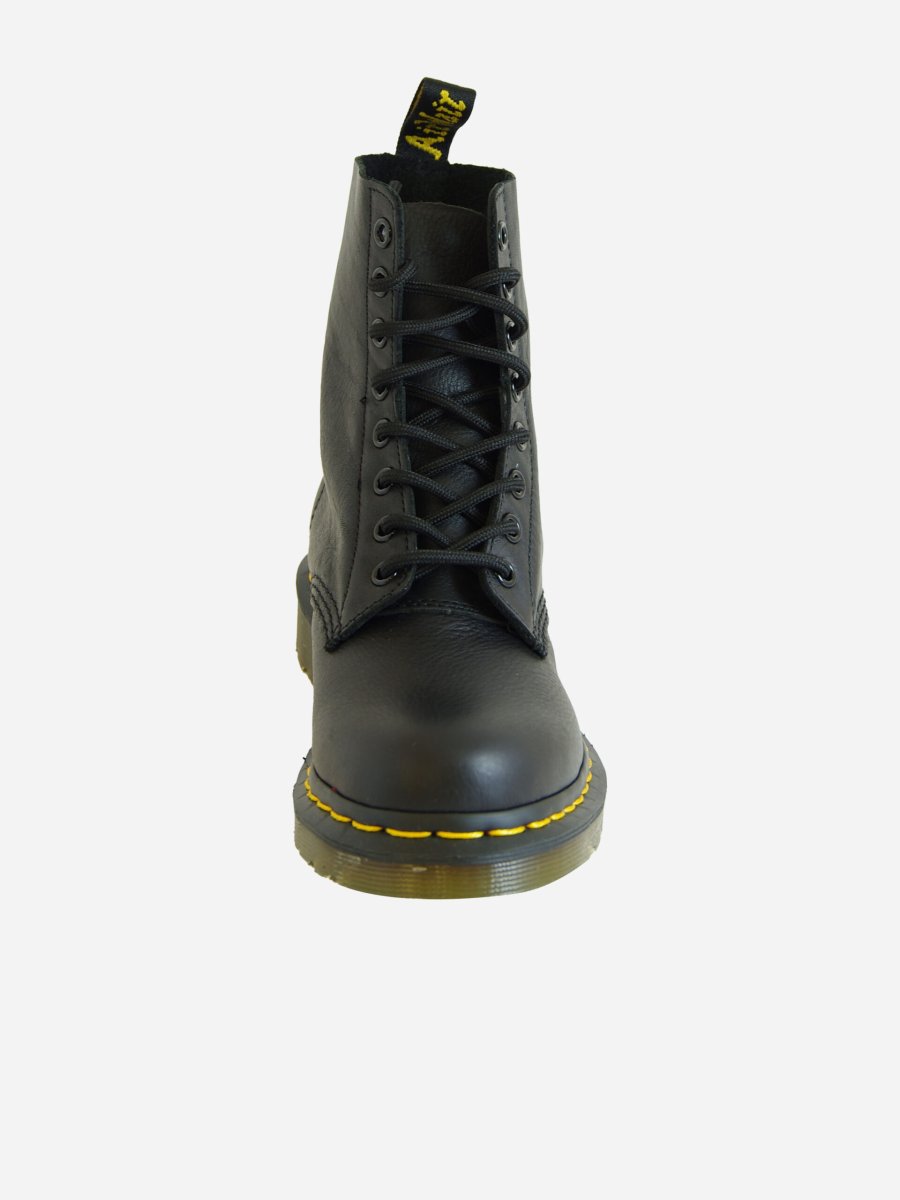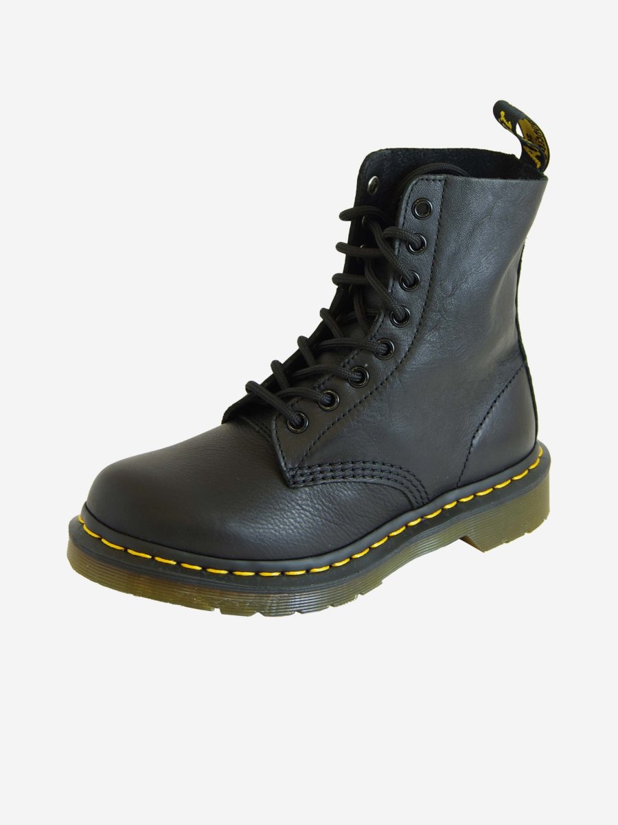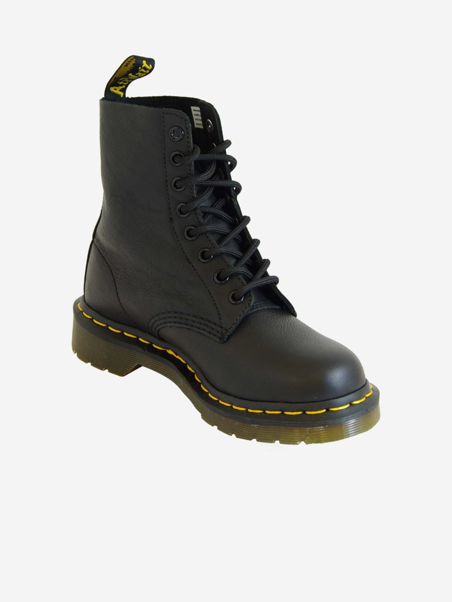 Anfibio di Dr. Martens modello Pascal, caratterizzato da una pelle piรน morbida rispetto al classico 1460. Anfibio nero con cuciture gialle a vista e linguetta sul tallone. Stringato a 8 fori. In pelle e suola in pvc.