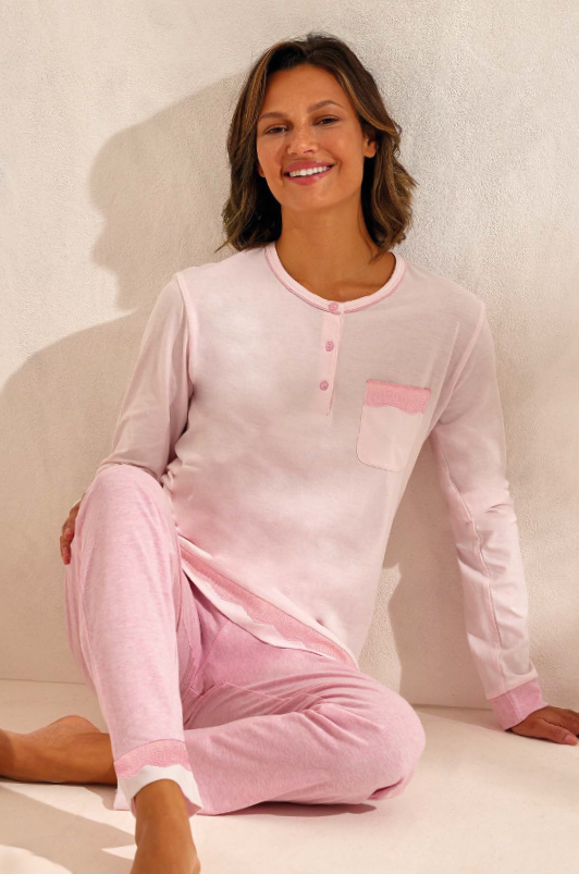 Pigiama donna Enrico Coveri primavera/estate, maglia manica lunga a serafino con bottoncini in tinta unita, pantalone lungo in tinta unita. Composizione: 100% cotone. Confezione da 8 pezzi. Disponibile nei colori Assortiti (Glicine e Rosa) nelle taglie Assortite S (2pz) โ M (2pz) โ L (2pz) โ XL (2pz).