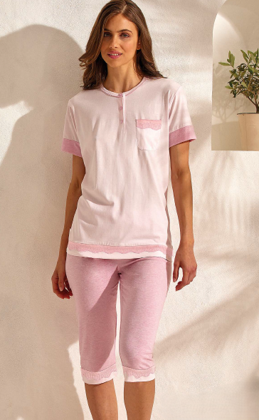 Pigiama donna Enrico Coveri primavera/estate, maglia manica corta a serafino con bottoncini, pantalone pinocchietto in tinta unita. Composizione: 100% cotone. Confezione da 8 pezzi. Disponibile nei colori Assortiti (Glicine e Rosa) nelle taglie Assortite S (2pz) โ M (2pz) โ L (2pz) โ XL (2pz).