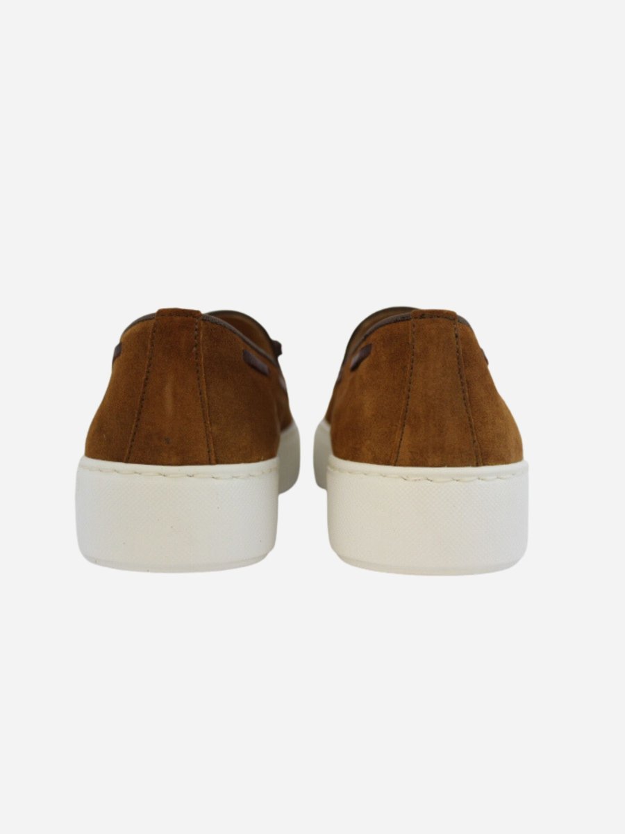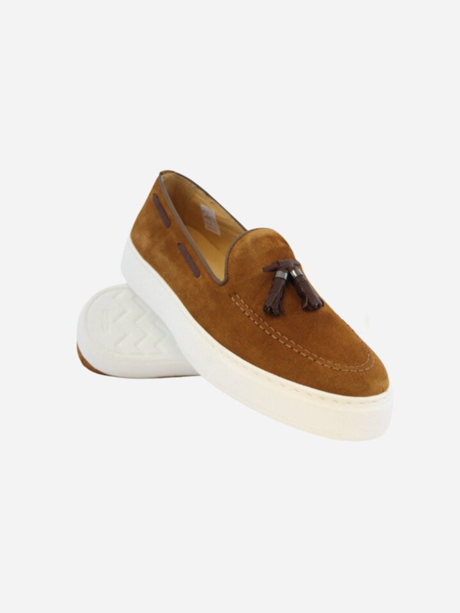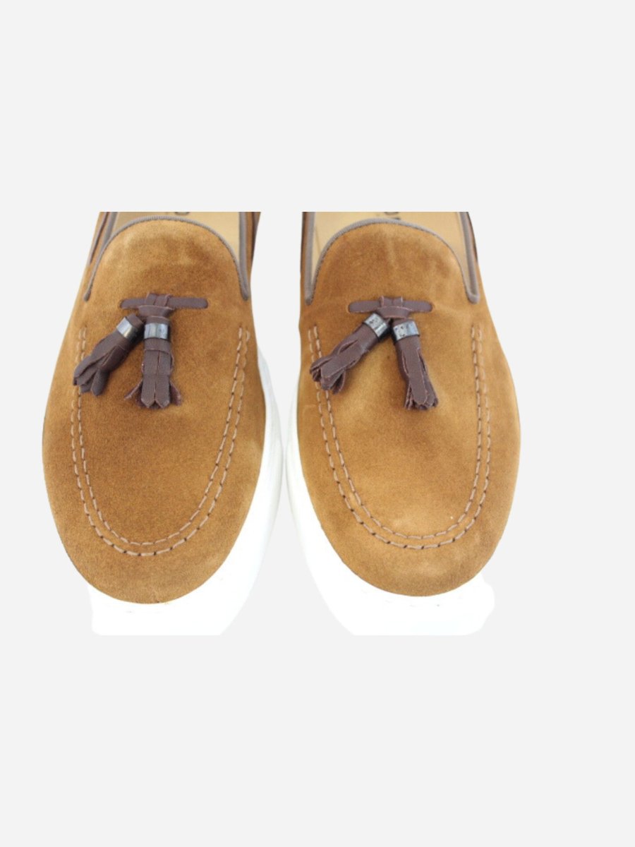 Mocassino in pelle scamosciata nella variante camel. Nappina applicata sulla linguetta e dettaglio cordino laterale. Suola in gomma di 4 cm.
