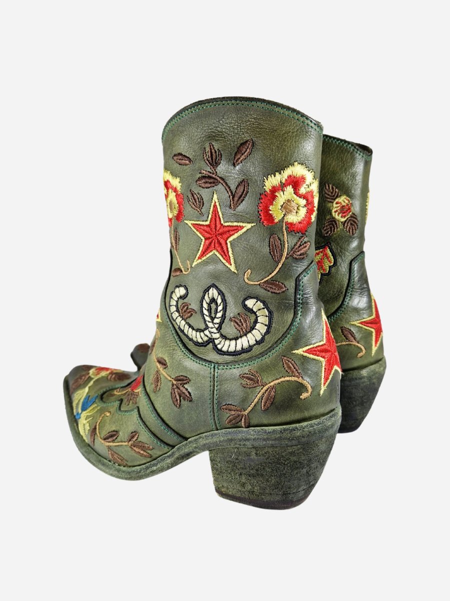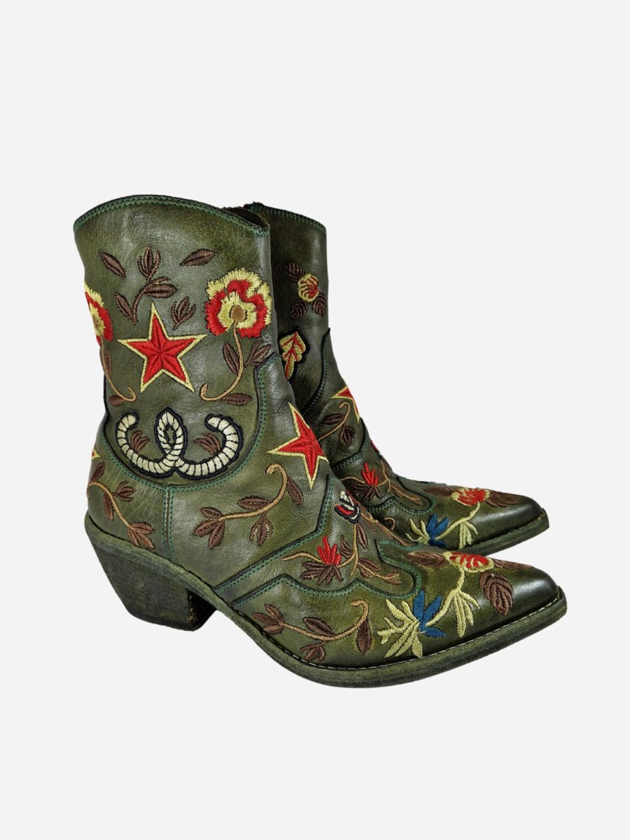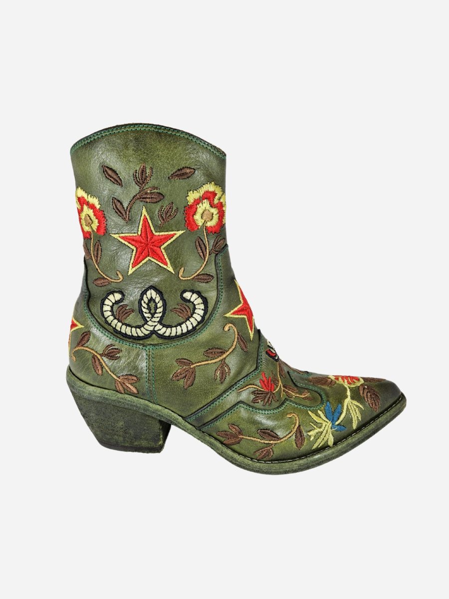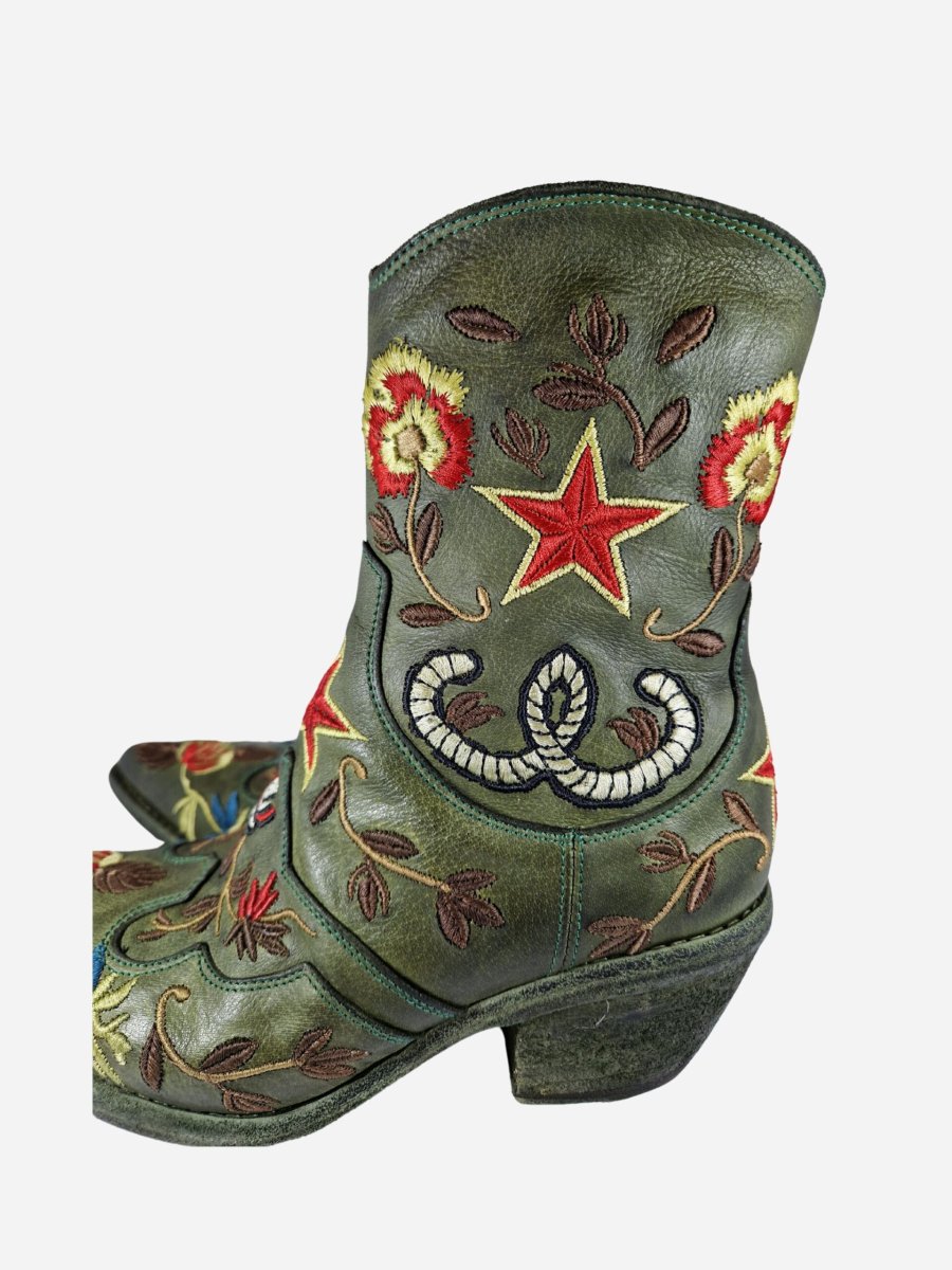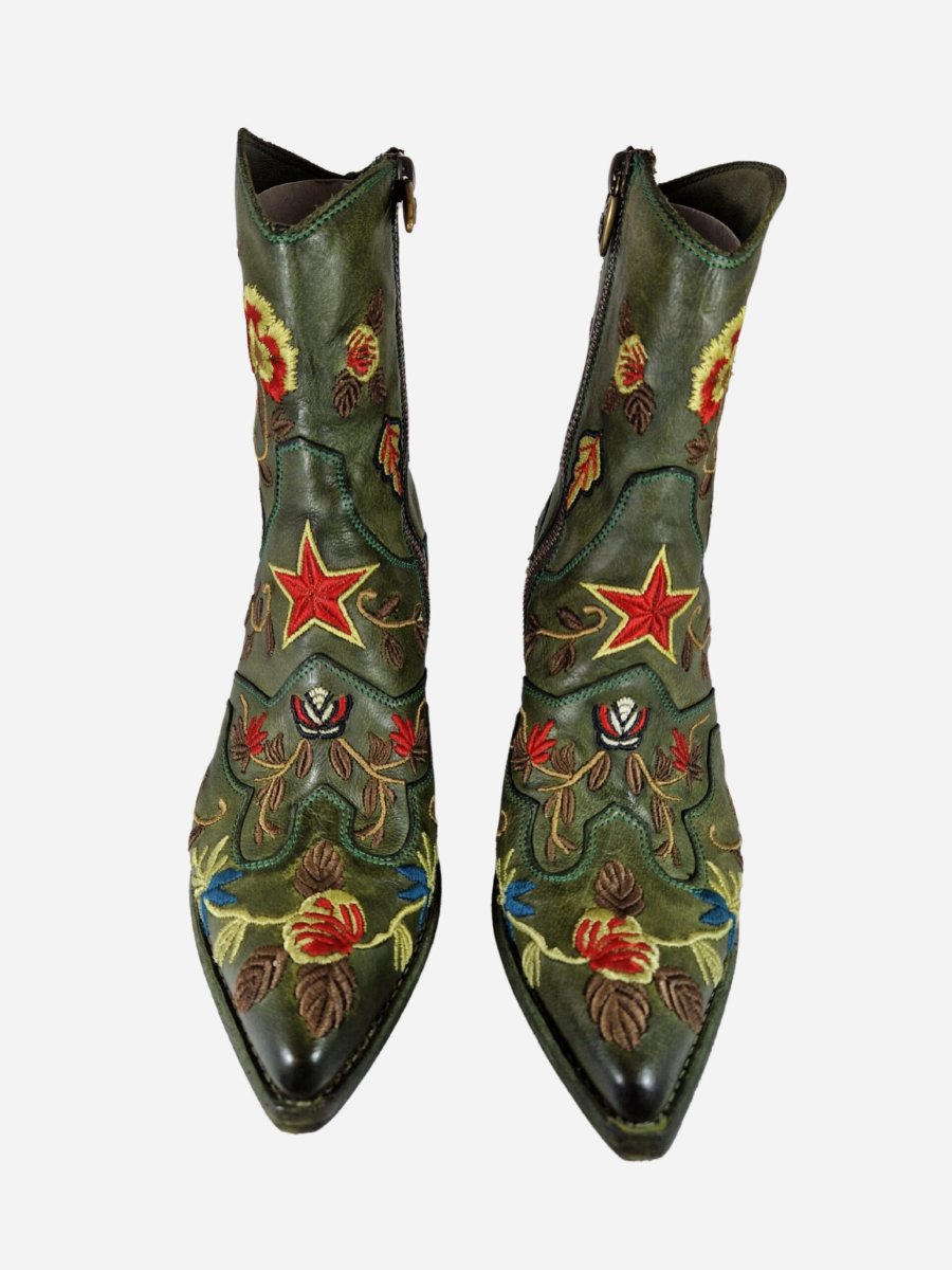 Stivale verde di Fauzian Jeunesse. Stivale verde modello Texano con ricami in velluto, cerniera interna e tacco in legno ricoperto di cuoio. Lavorato A MANO.