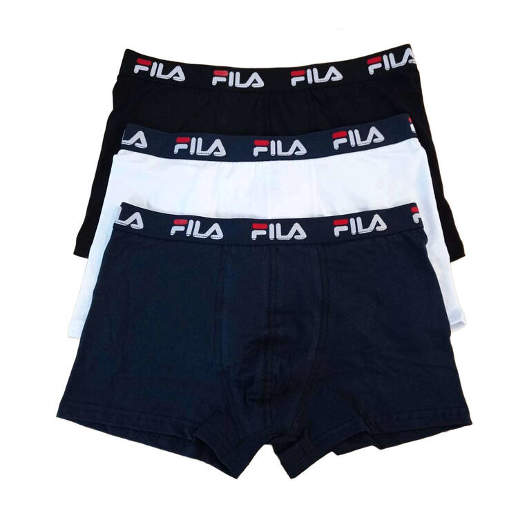 Boxer uomo Fila, in cotone elasticizzato in tinta unita. Confezione da 3 pezzi. Disponibile nel colore Assortito (Blu, Grigio e Nero) e Nero nelle taglie S – M – L – XL – 2XL.