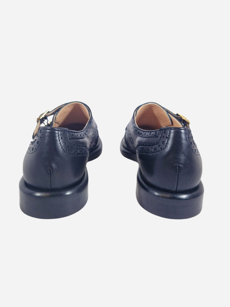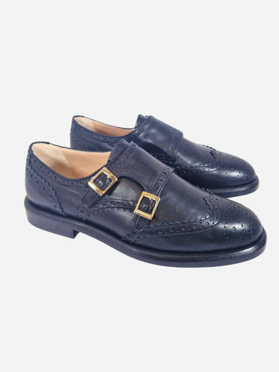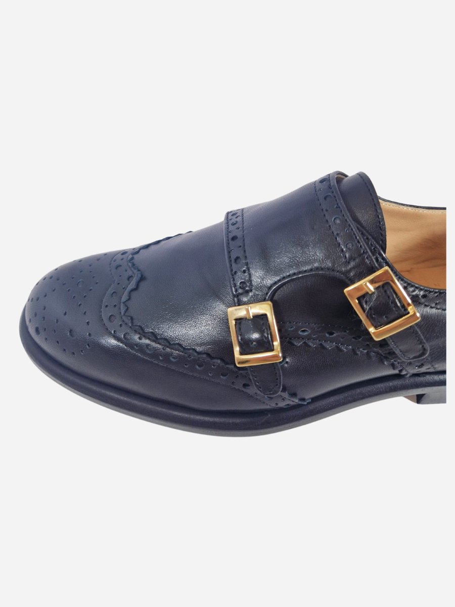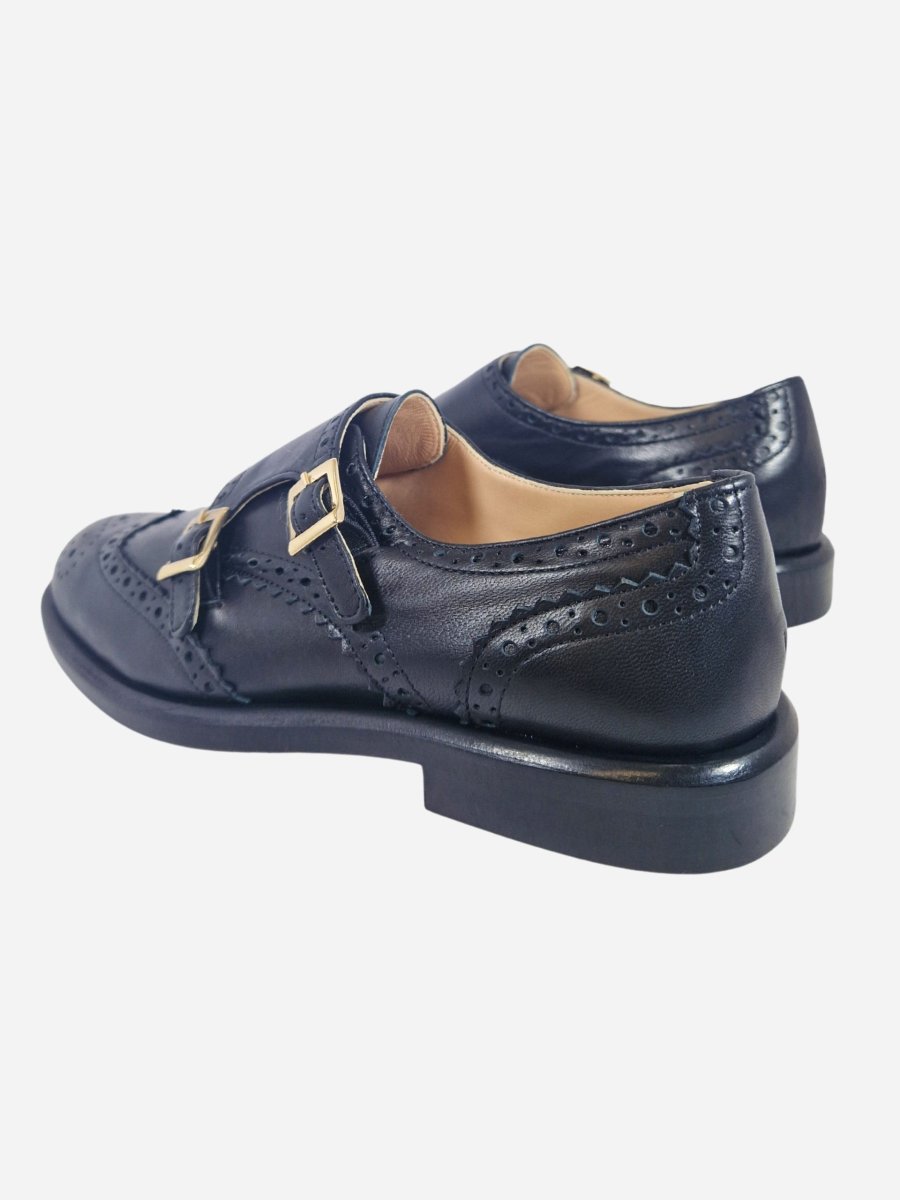 Scarpa inglese by Franco Russo. Scarpe realizzate in nappa nera con decorazione brogue sulla punta. Interno realizzato in morbida pelle, con comodo fondo in cuoio. La scarpa รจ arricchita da una dobbia fibbia dorata. Made in Italy