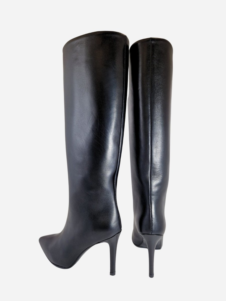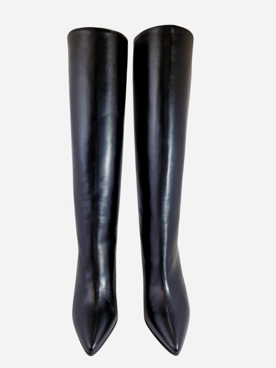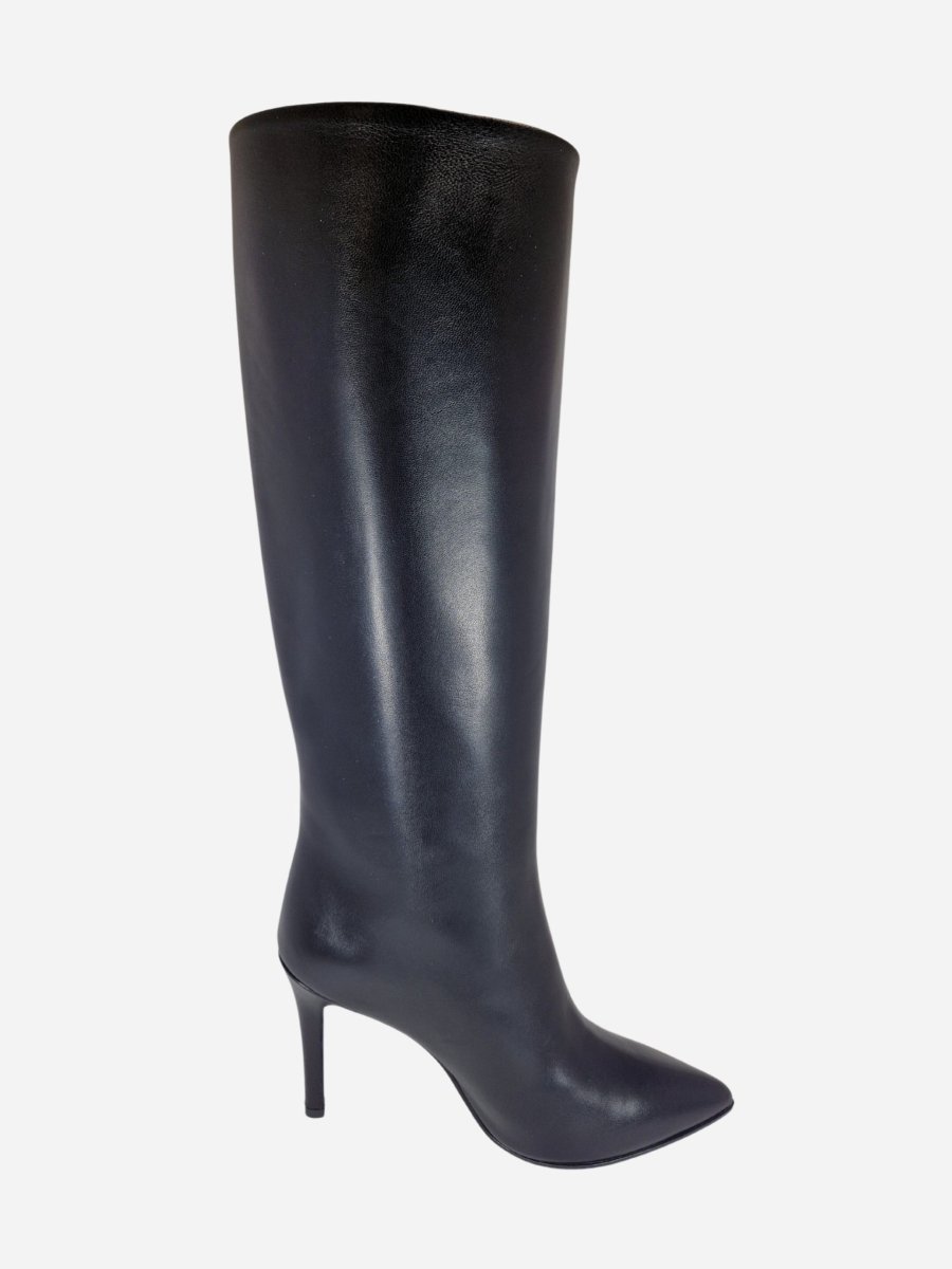Stivali a tubo by Franco Russo. Calzature realizzate in nappa nera con interno realizzato in morbida pelle e comodo fondo in cuoio. Tacco a spillo di 9 cm. Altezza del gambale 36 cm nel n.37. Circonferenza gambale 34,5 cm nel n. 37. Made in Italy