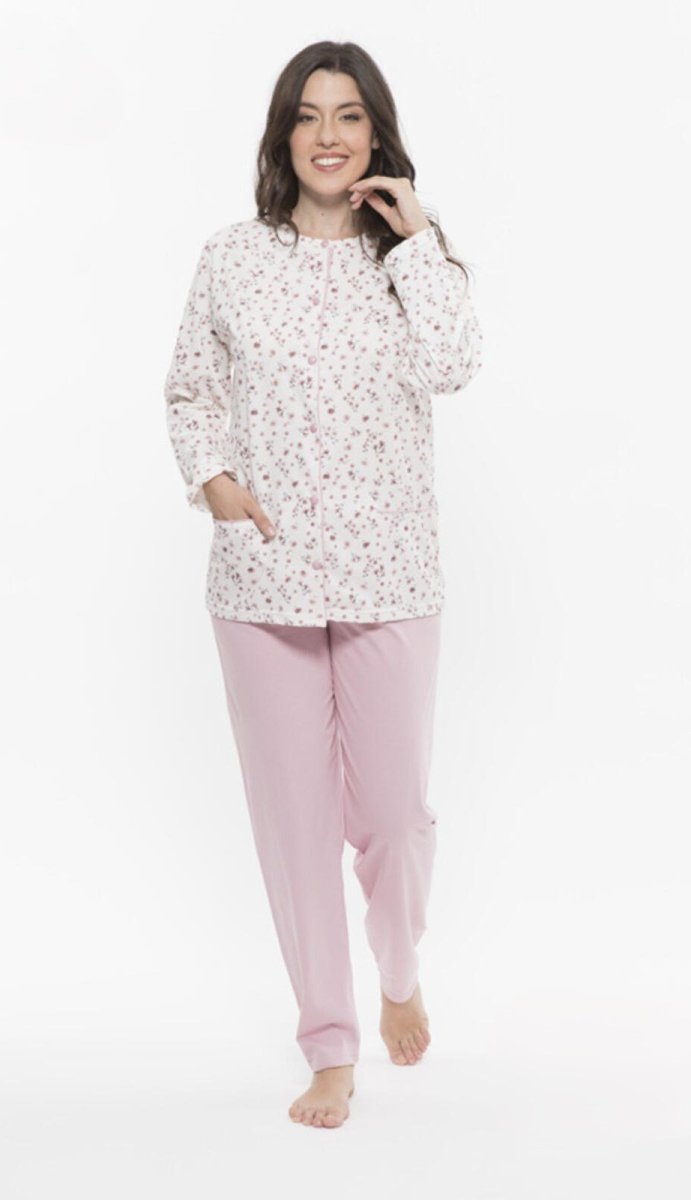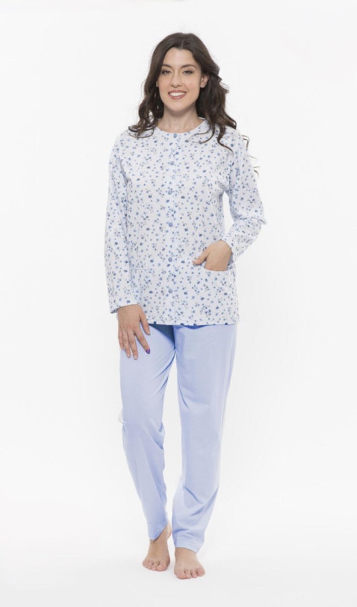 Pigiama aperto donna Gary primavera/estate, maglia aperta manica lunga con bottoncini, pantalone lungo in tinta unita. Composizione: 100% cotone. Confezione da 1 pezzo. Disponibile nei colori Cielo e Rosa nelle taglie S – M – L – XL – XXL.