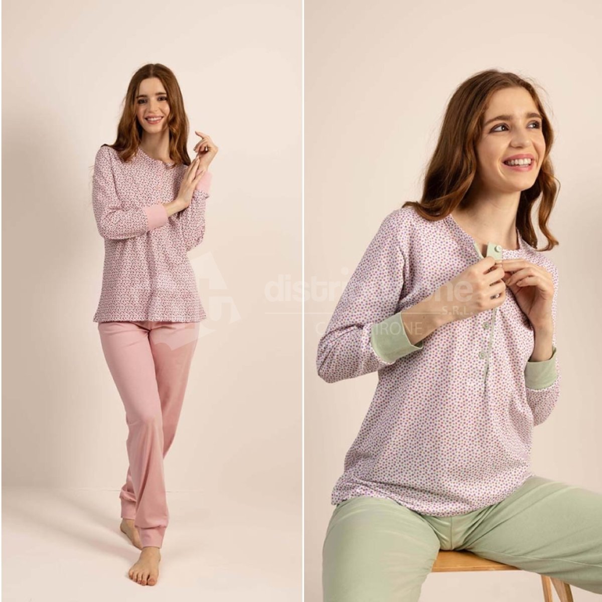 Pigiama donna Gary primavera/estate, maglia manica lunga a serafino con bottoncini, pantalone lungo in tinta unita. Composizione: 100% cotone. Confezione da 1 pezzo. Disponibile nei colori Polvere dorata e Verde nelle taglie S – M – L – XL.
