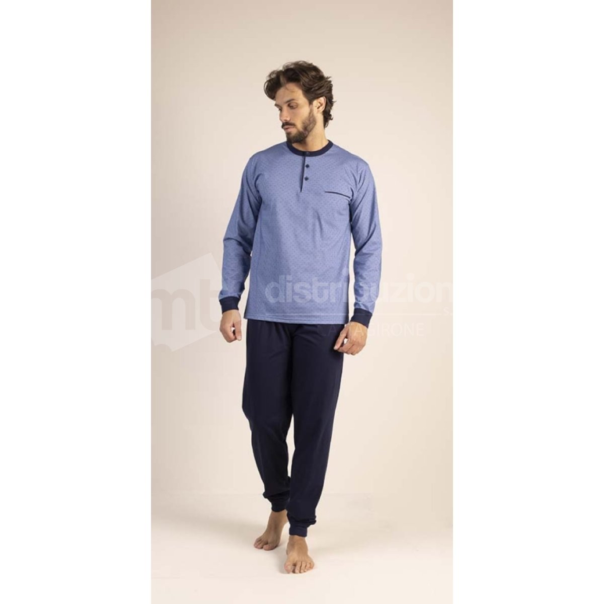 Pigiama uomo Gary primavera/estate, maglia manica lunga con bottoncini, pantalone lungo in tinta unita. Composizione: 100% cotone. Confezione da 1 pezzo. Disponibile nel colore Celeste nelle taglie 46 – 48 – 50 – 52 – 54.