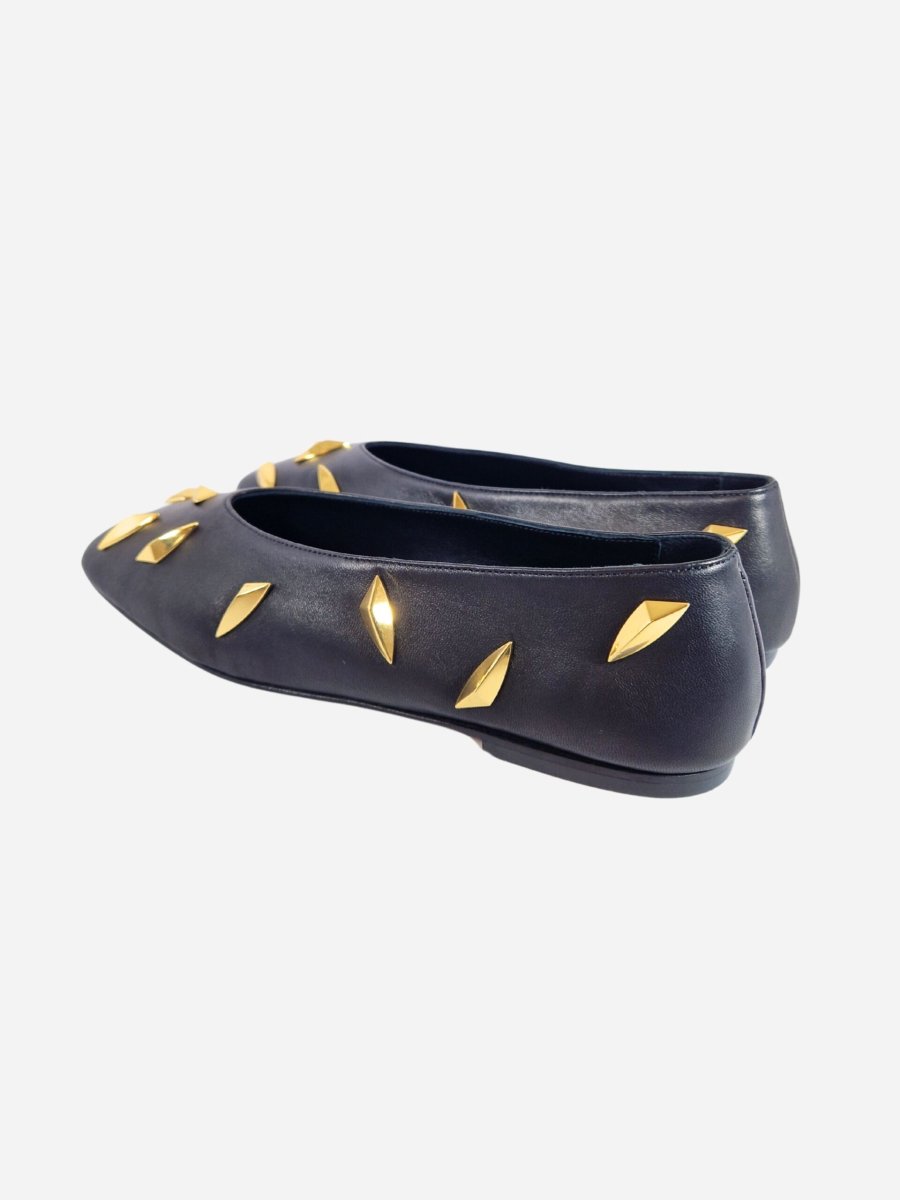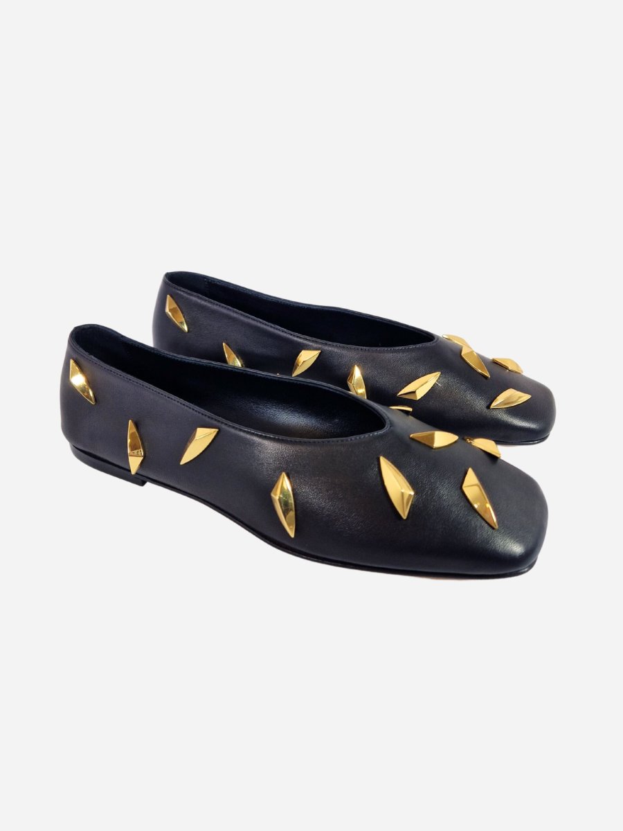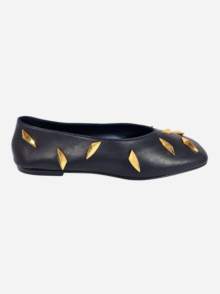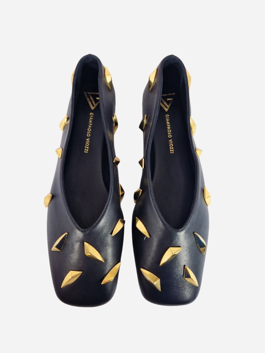 Ballerine by Giampaolo Viozzi. Calzature realizzate in vera pelle con morbido fondo in cuoio e suola in materiale sintetico, impreziosite da borchie dorate lungo tutta la tomaia. Made in Italy. Disponibile in piรน colori: Panna, Nero, Testa di moro, Verde Acqua