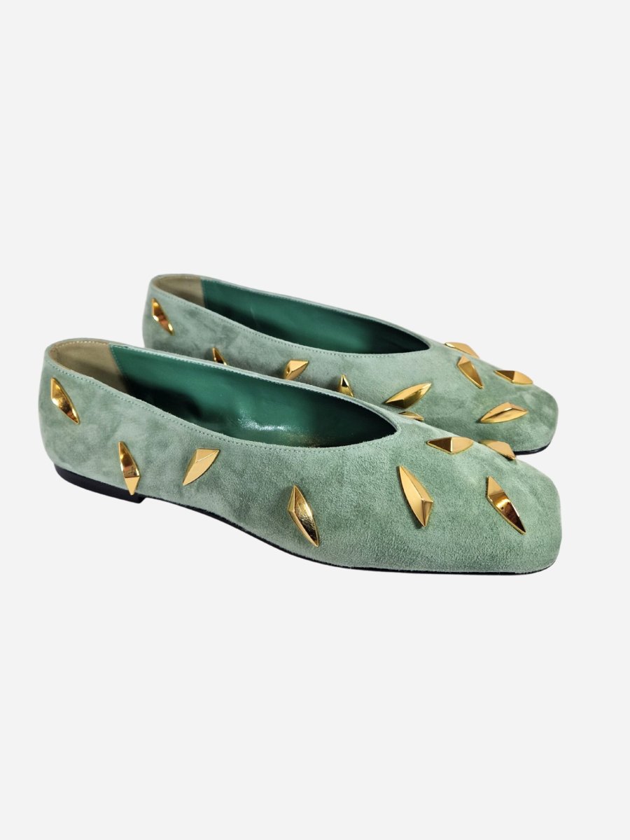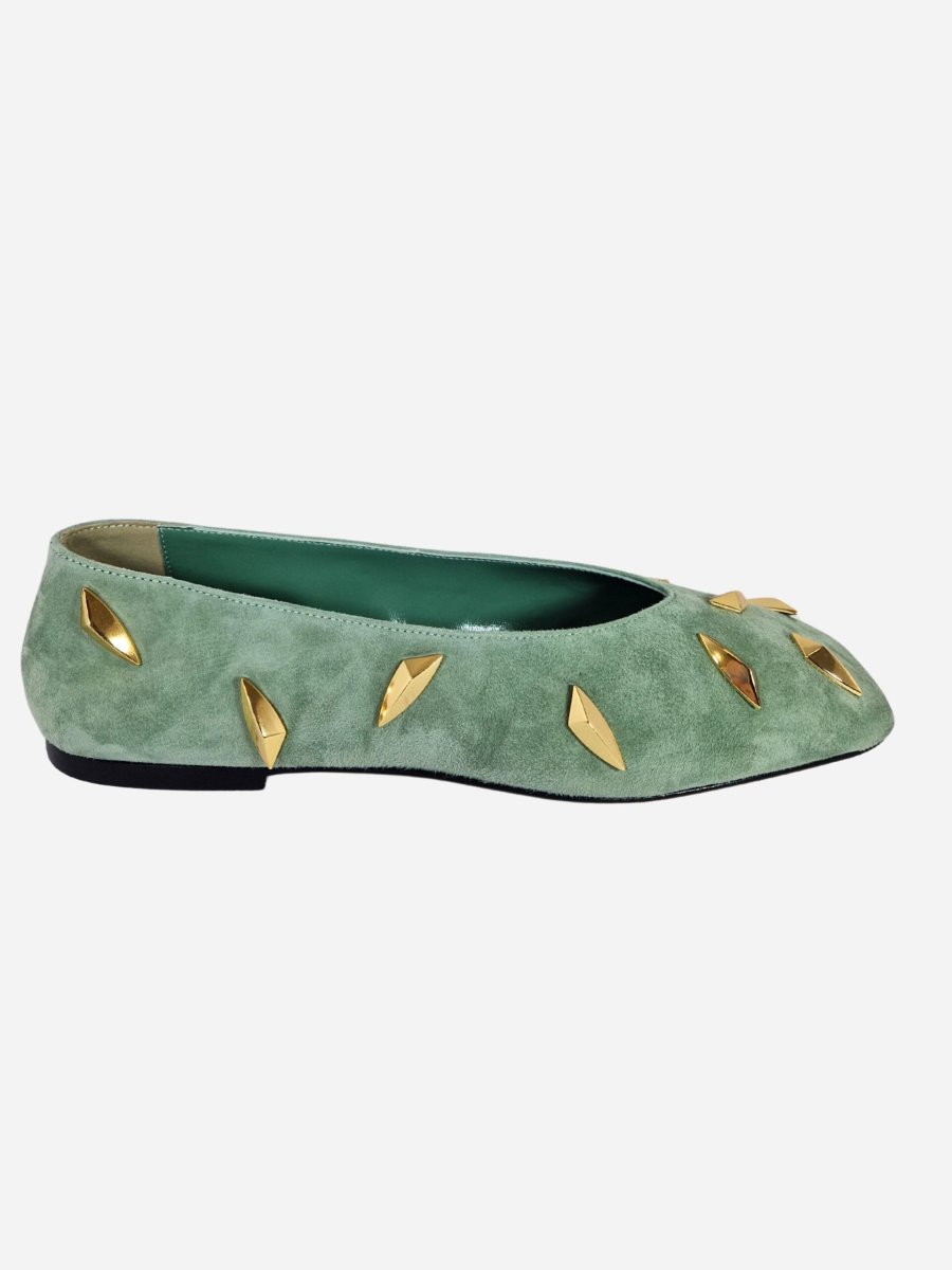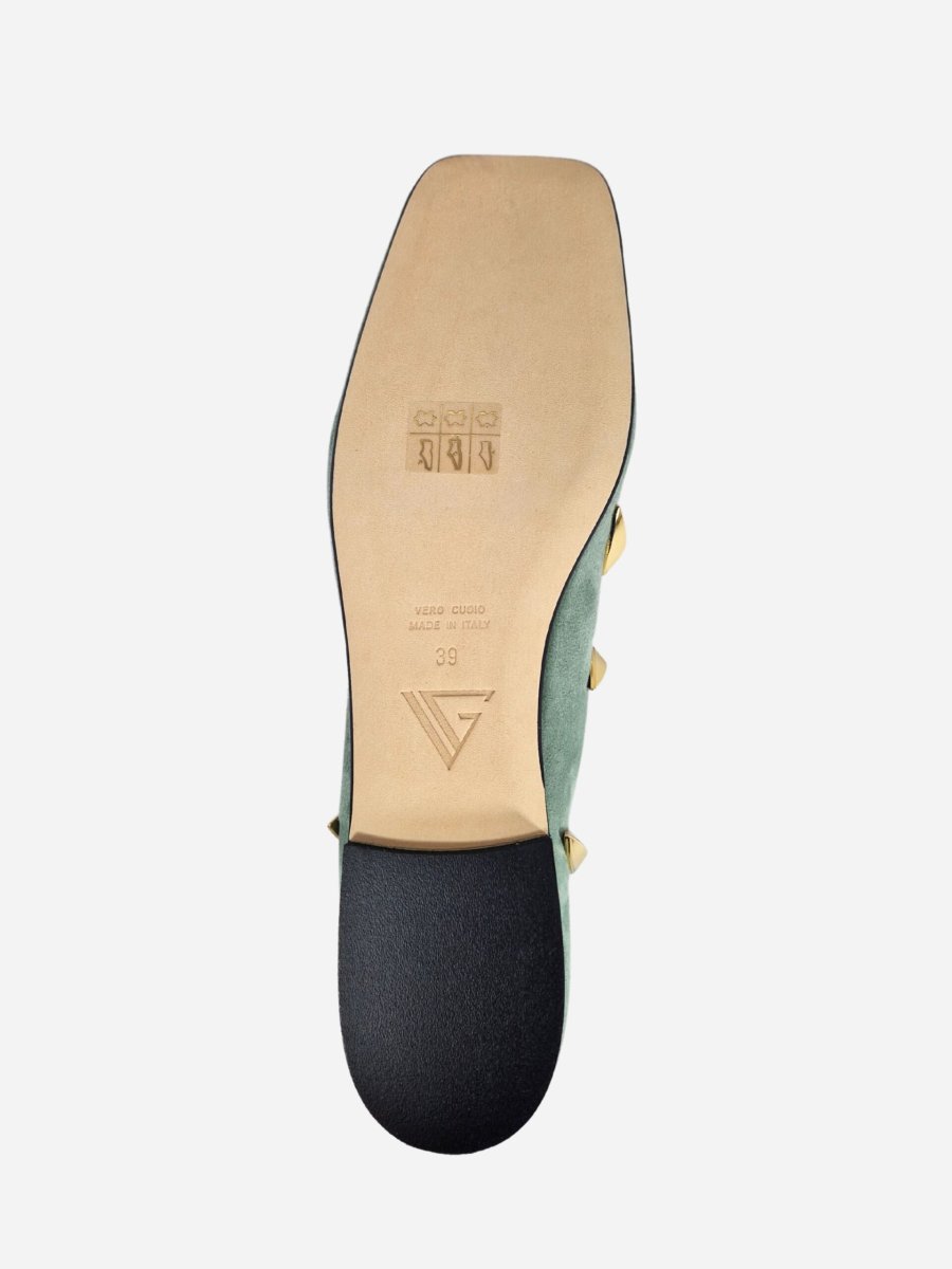 Ballerine by Giampaolo Viozzi. Calzature realizzate in vera pelle scamosciata con morbido fondo in cuoio e suola in materiale sintetico, impreziosite da borchie dorate lungo tutta la tomaia. Made in Italy. Disponibile in piรน colori: Panna, Nero, Testa di moro, Verde Acqua