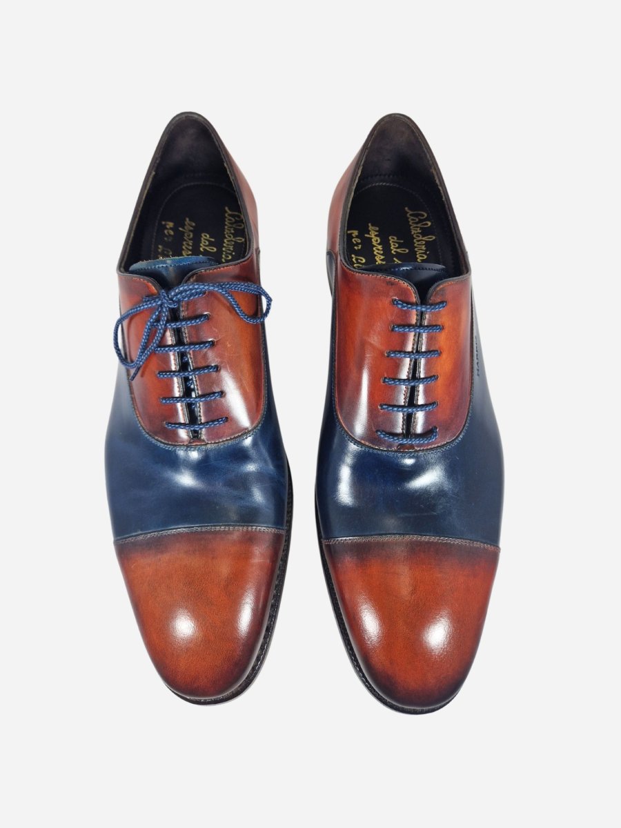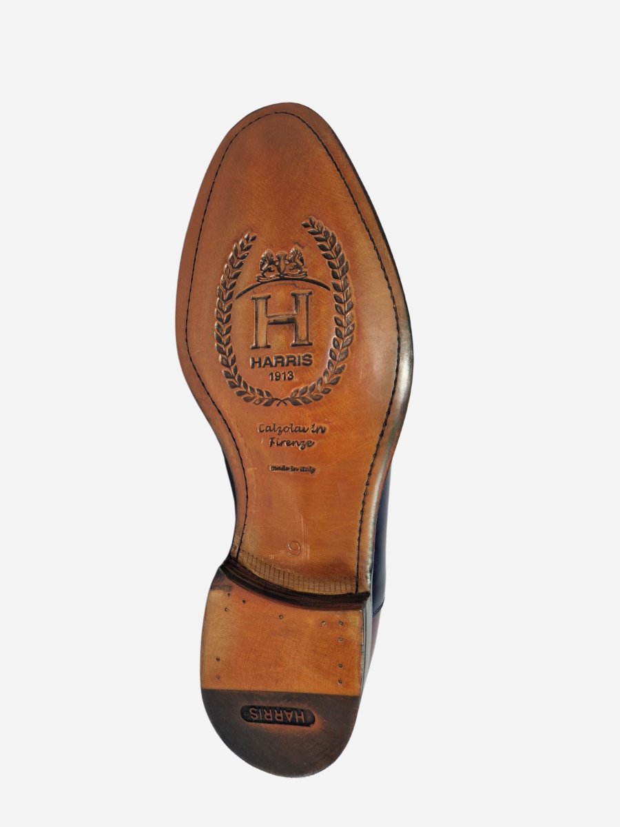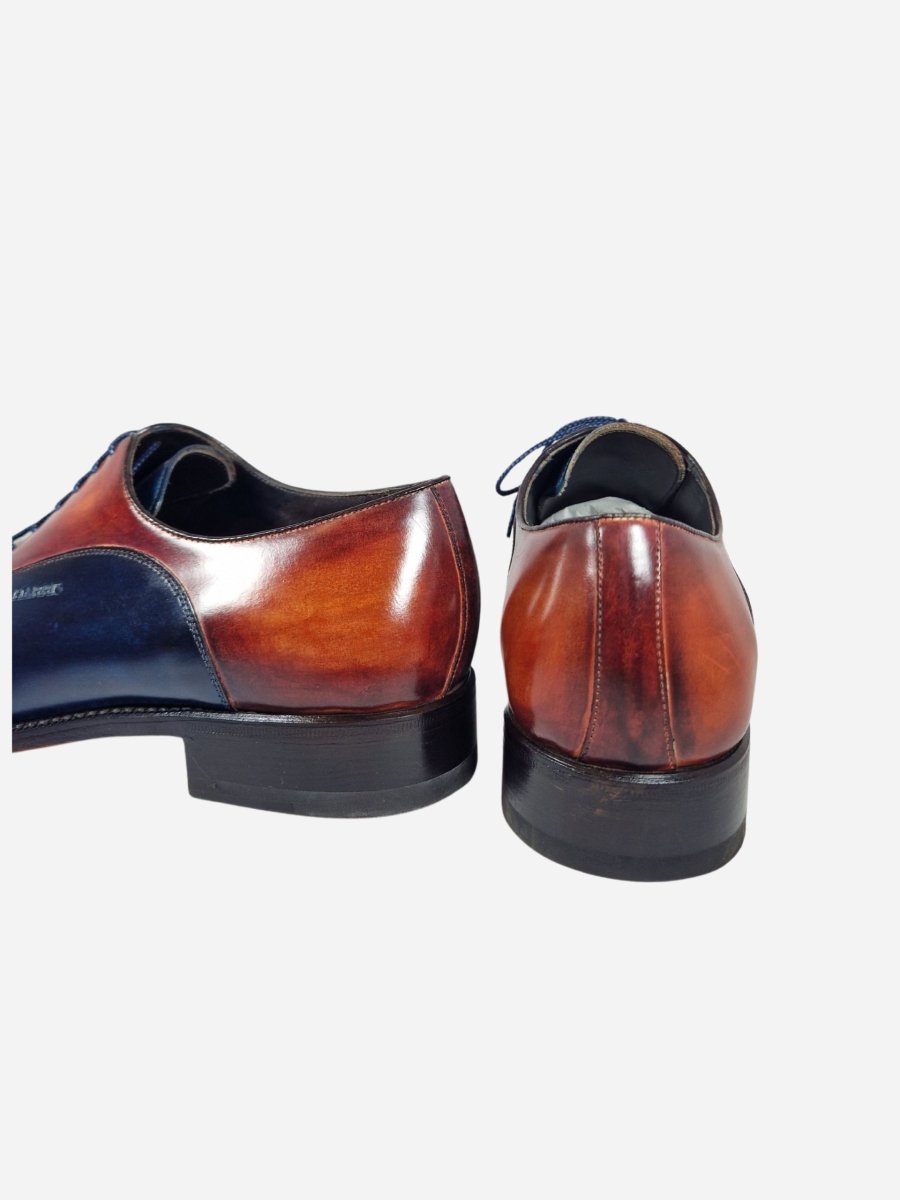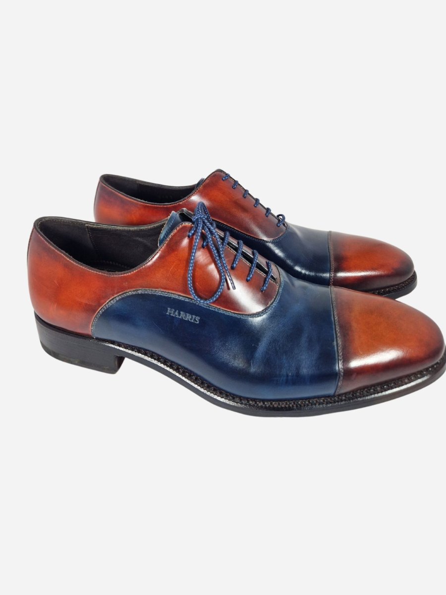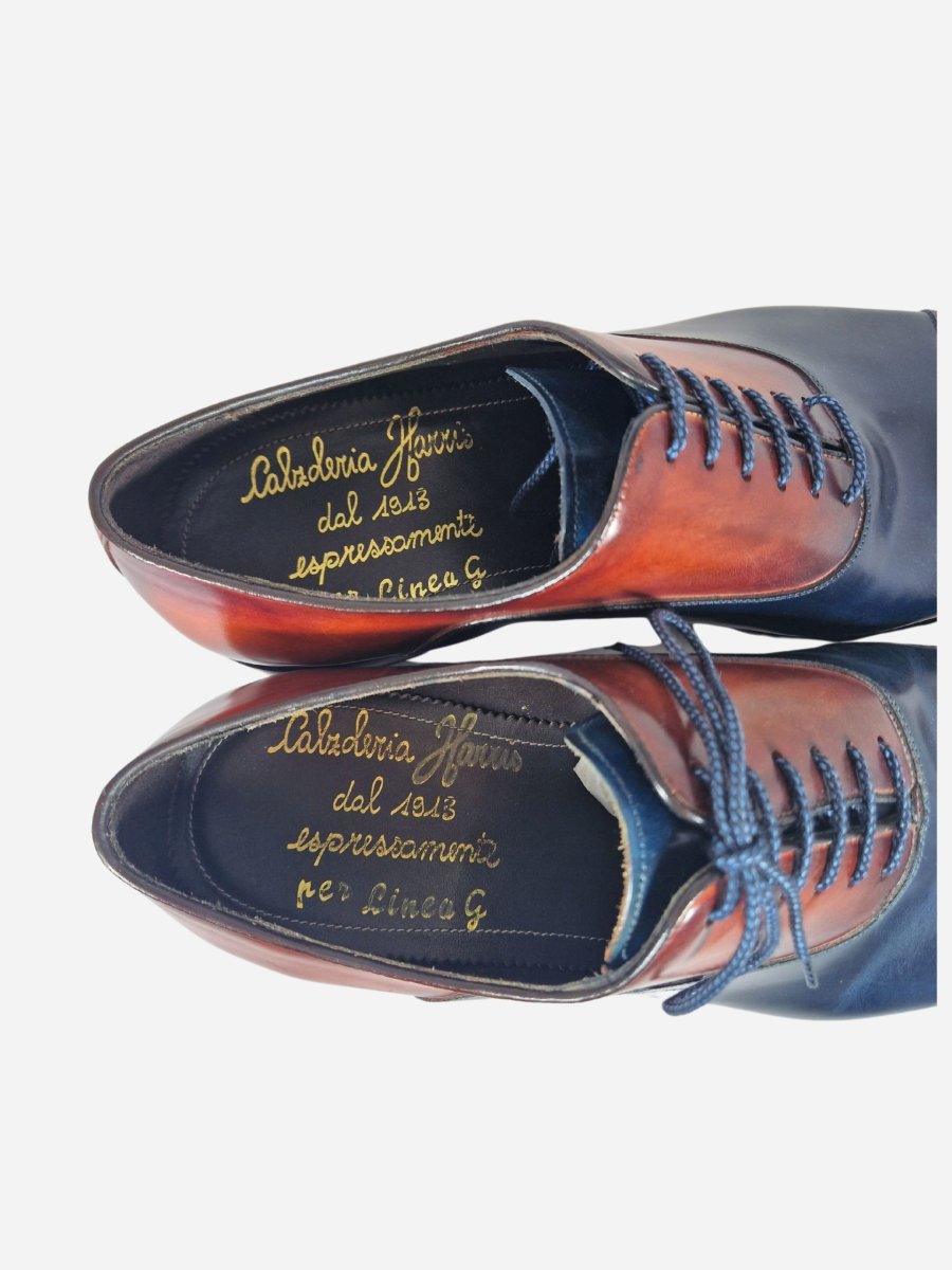 Stringata 8181 di Harris. La tomaia รจ realizzata interamente in pelle di vitello dipinta e sfumata a mano nelle eleganti tonalitร blu e arancio. Suola in cuoio.