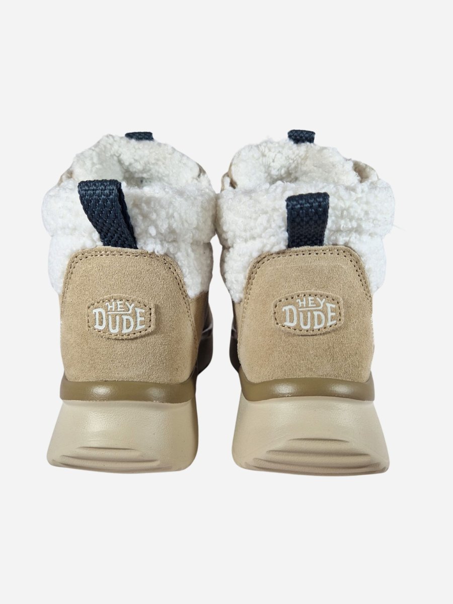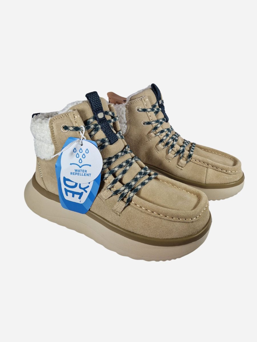 Stivaletti WENDY PEAKย by Hey Dude. Calzature realizzate in camoscio, arricchite da cuciture a contrasto e lacci. Interno in morbida lana e suola in gomma leggera. La linguetta permette una calzata semplice e comoda.