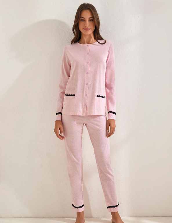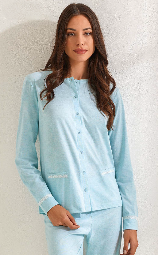Pigiama aperto donna Il Granchio primavera/estate, maglia manica lunga con bottoncini, pantalone lungo in tinta unita. Composizione: 100% cotone. Confezione da 8 pezzi. Disponibile nei colori Assortiti (Menta e Rosa) nelle taglie Assortite S (2pz) – M (2pz) โ L (2pz) โ XL (2pz).