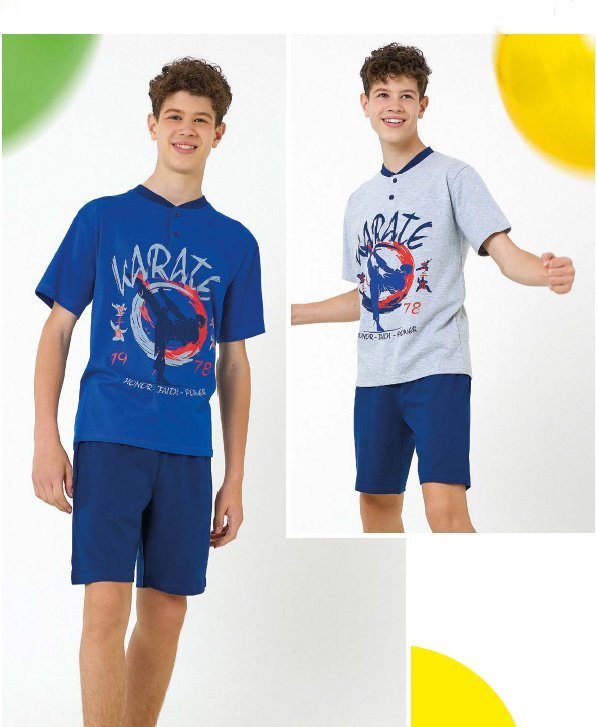 Pigiama corto ragazzo Il Granchio primavera/estate, maglia manica corta con bottoncini, pantalone corto in tinta unita. Composizione: 100% cotone. Confezione da 12 pezzi. Disponibile nei colori Assortiti (Grigio e Indaco) nelle taglie assortite 11/12 anni (4pz) โ 13/14 anni (4pz) โ 15/16 anni (4pz).