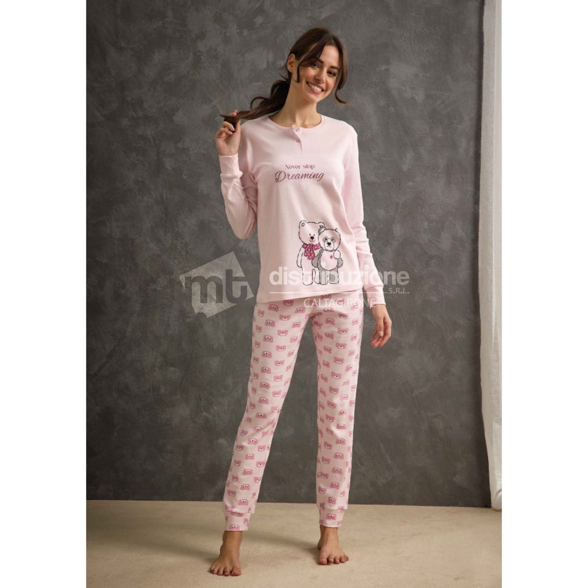 Pigiama donna Il Granchio autunno/inverno, in caldo cotone, maglia manica lunga a serafino con bottoncini, pantalone lungo con fantasia, il tutto con polsini. Composizione: 100% caldo cotone. Confezione da 8 pezzi. Disponibile nei colori Assortiti (Panna e Rosa) nelle taglie Assortite S (2pz) โ M (2pz) โ L (2pz) โ XL (2pz).