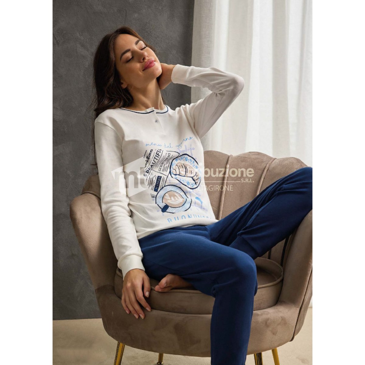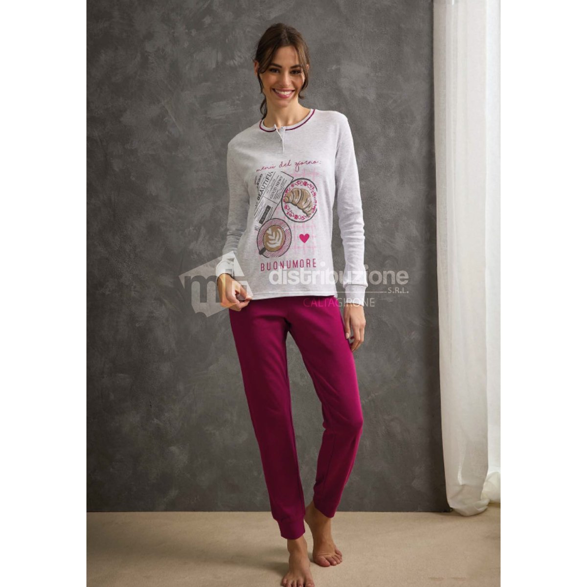Pigiama donna Il Granchio autunno/inverno, in caldo cotone, maglia manica lunga a serafino con bottoncini, pantalone lungo in tinta unita, il tutto con polsini. Composizione: 100% caldo cotone. Confezione da 8 pezzi. Disponibile nei colori Assortiti (Grigio e Panna) nelle taglie Assortite S (2pz) โ M (2pz) โ L (2pz) โ XL (2pz).