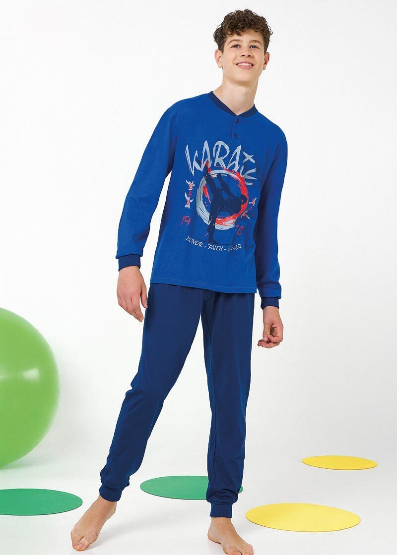 Pigiama ragazzo Il Granchio primavera/estate, maglia manica lunga a serafino con bottoncini, pantalone lungo in tinta unita con polsini alle caviglie. Composizione: 100% cotone. Confezione da 12 pezzi. Disponibile nei colori Assortiti (Grigio e Royal) nelle taglie assortite 11/12 anni (4pz) โ 13/14 anni (4pz) โ 15/16 anni (4pz).