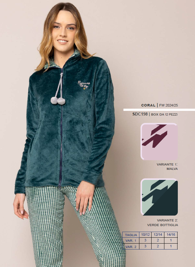Pigiama ragazza Irge, tessuto pile coral che garantisce un comfort straordinario, giacca con zip e polsini alle maniche per una vestibilitร avvolgente. Confezione da 12 pezzi. Disponibile nei colori Assortiti (Malva e Verde) nelle taglie 10/12 anni (6pz) โ 12/14 anni (4px) โ 14/16 anni (2pz).